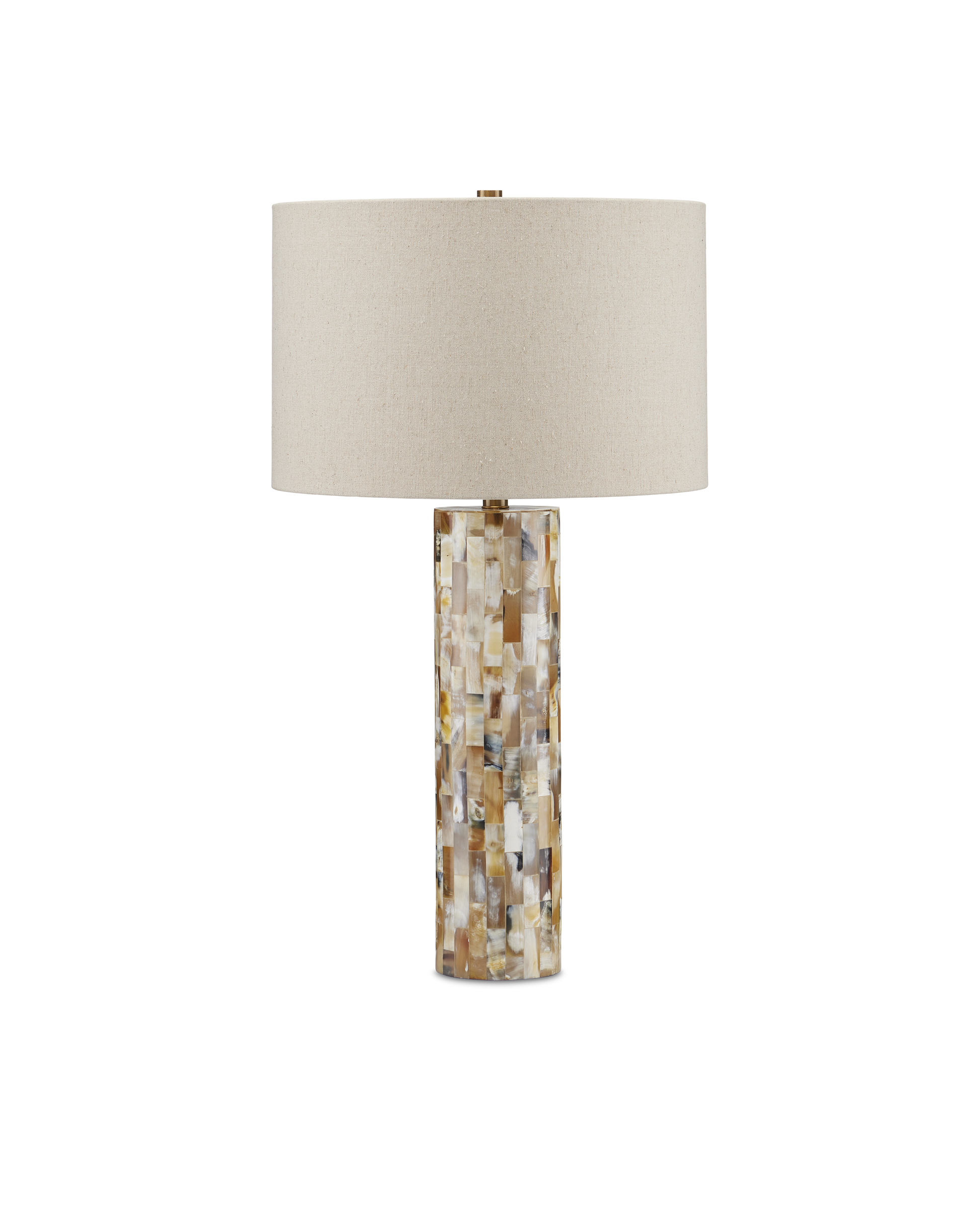 The elegant columnar body of the Colevile Table Lamp is covered in asymmetrical pieces of natural horn inlay that have been hand cut and painstakingly applied. Designed by Pam Bailey and Christina Pomroy, they chose a shinier type of horn in order to give this tan lamp a heavy dose of sheen. The Colevile is topped with an oatmeal linen shade that is fastened with a brass finial.