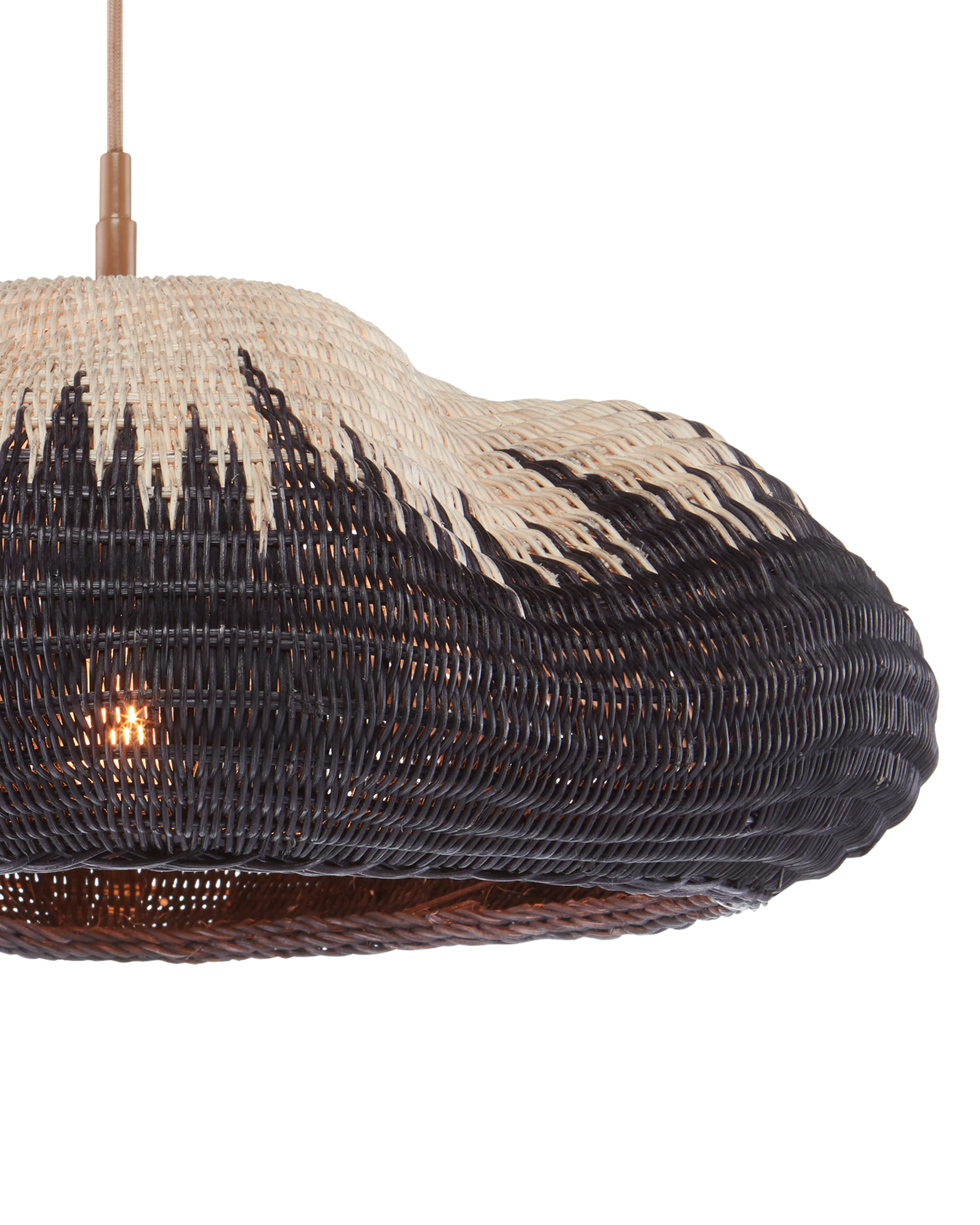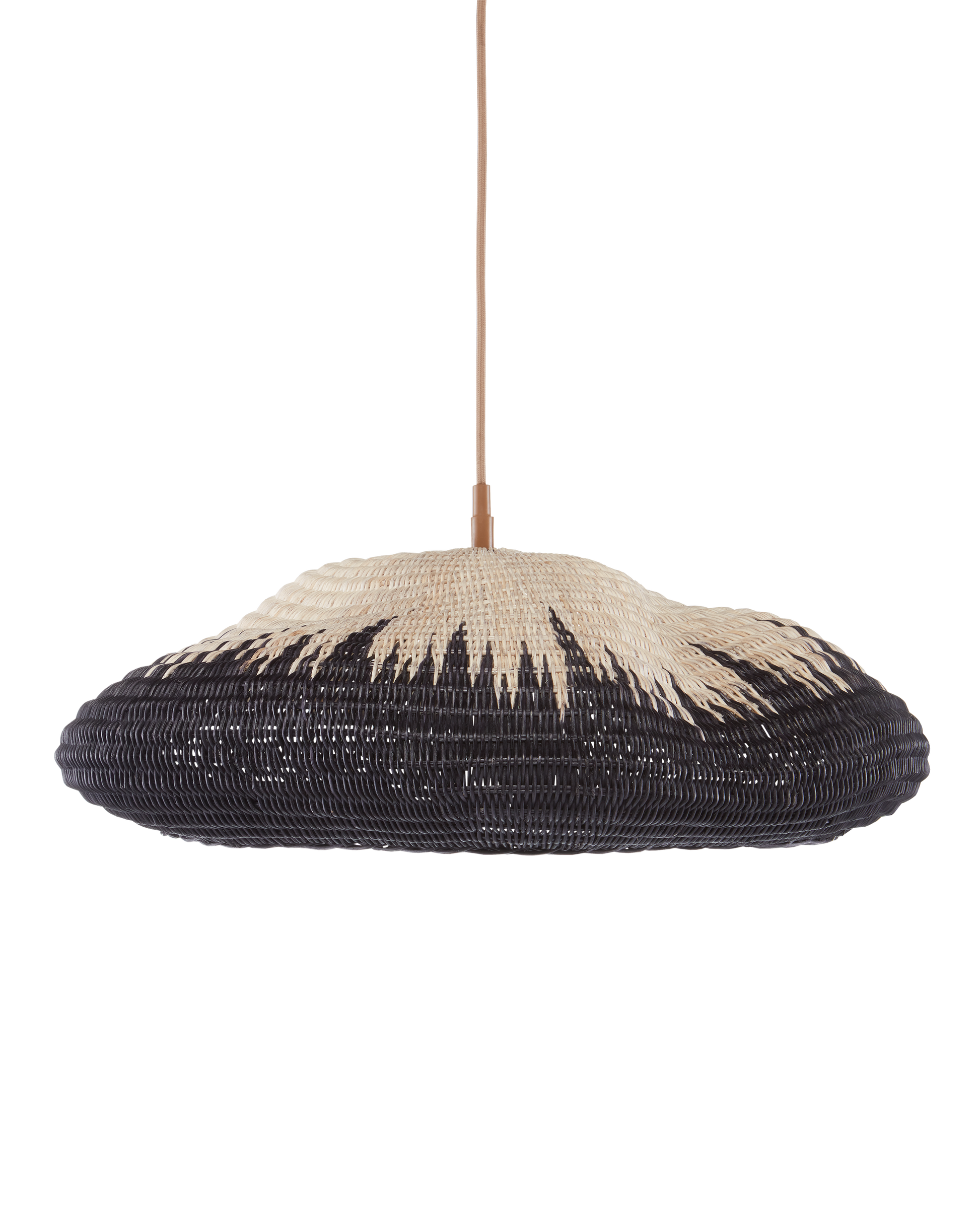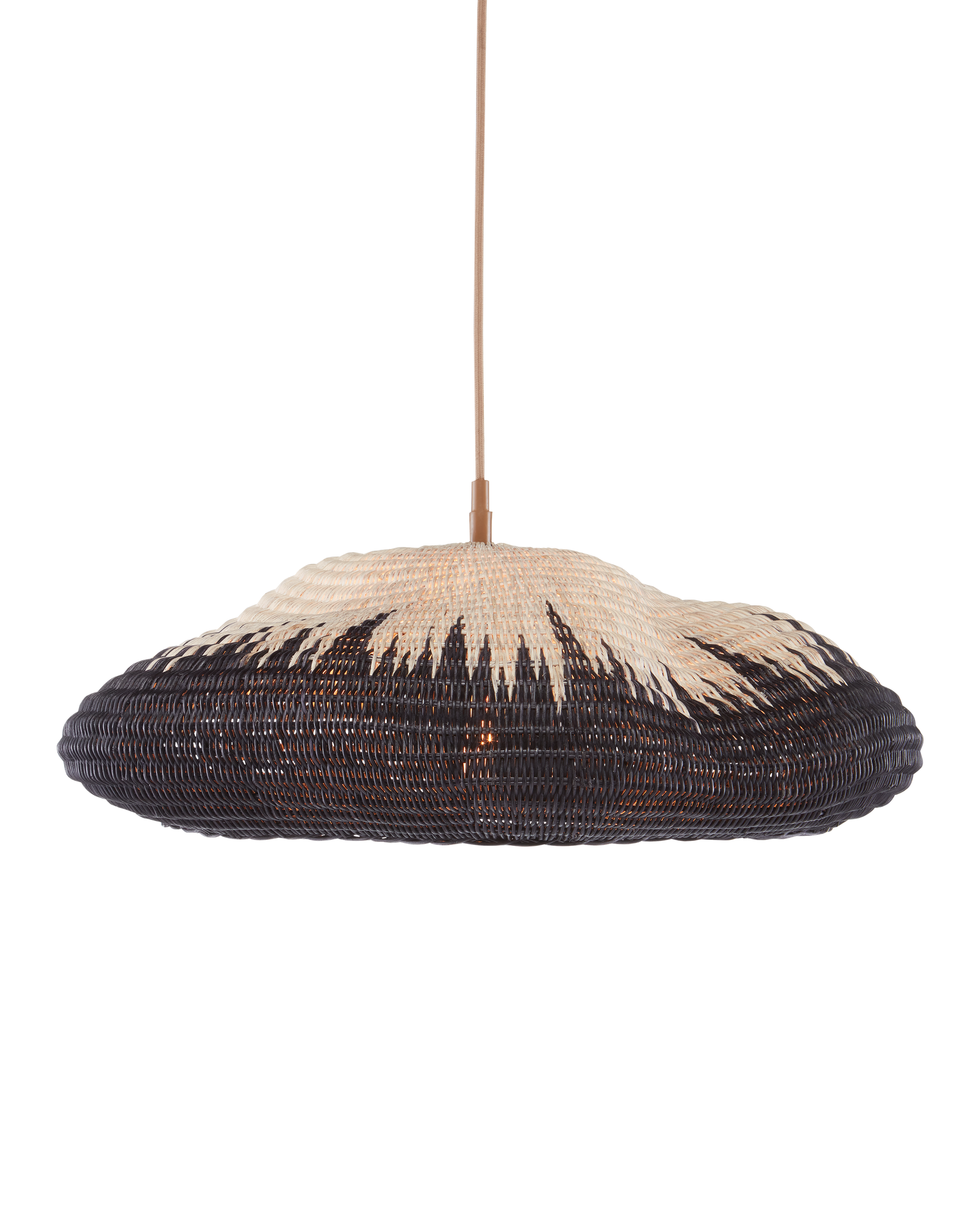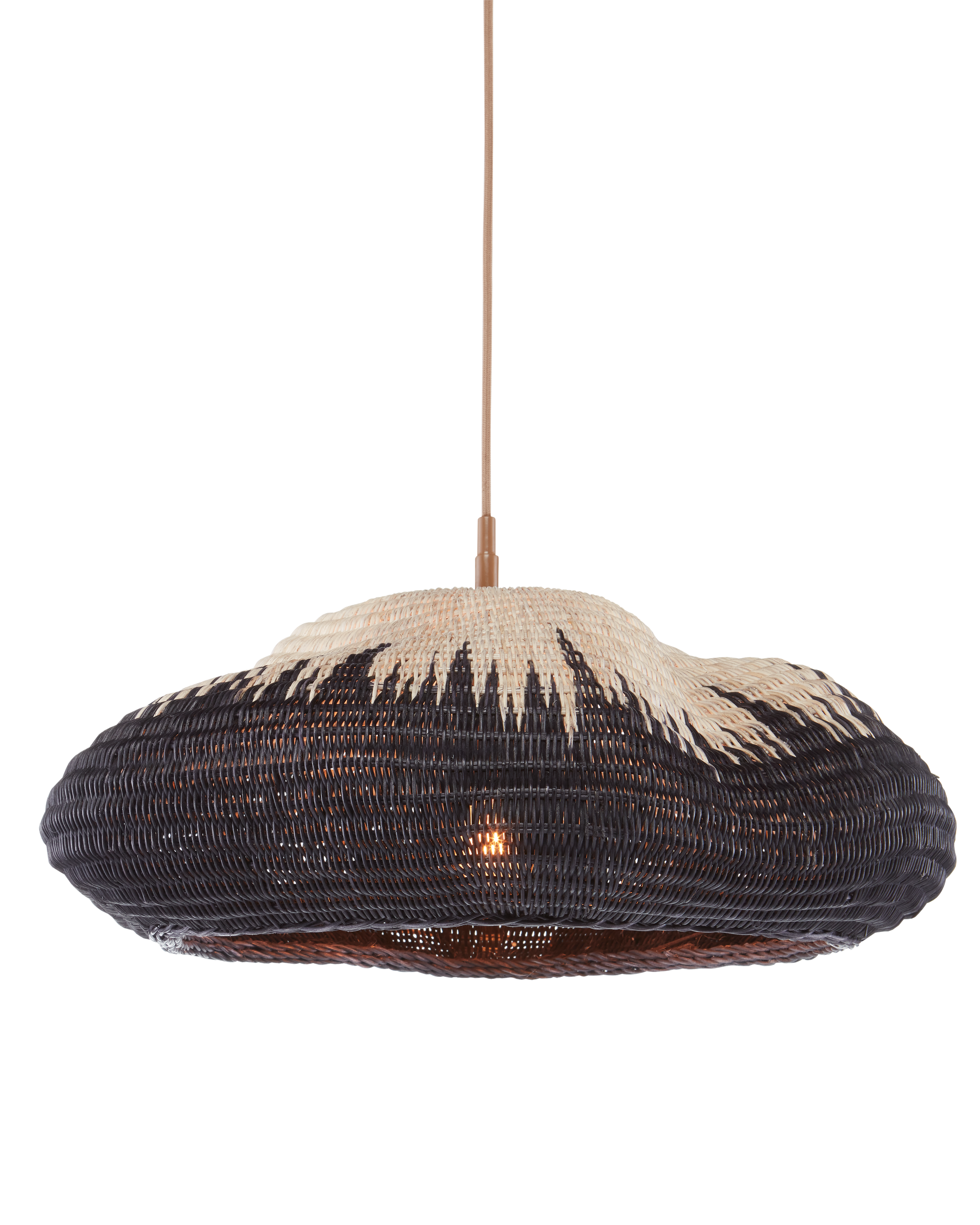 The Comme Des Paniers Pendant was inspired by wicker bags our design team saw in Paris. Panier in French means basket, the name a nod to the basket-weave it took to achieve this cloche-like shade. A detail of note is how the two-tone wicker shade looks as if there is a flame flowing up it. The wrought iron hardware on this basket-weave pendant is in a Khaki finish. Adjustable from 15.5" to 129.5" with use of included chain/rod kit/cable. If your space calls for a longer drop, additional chain/rods/cable is available for purchase.