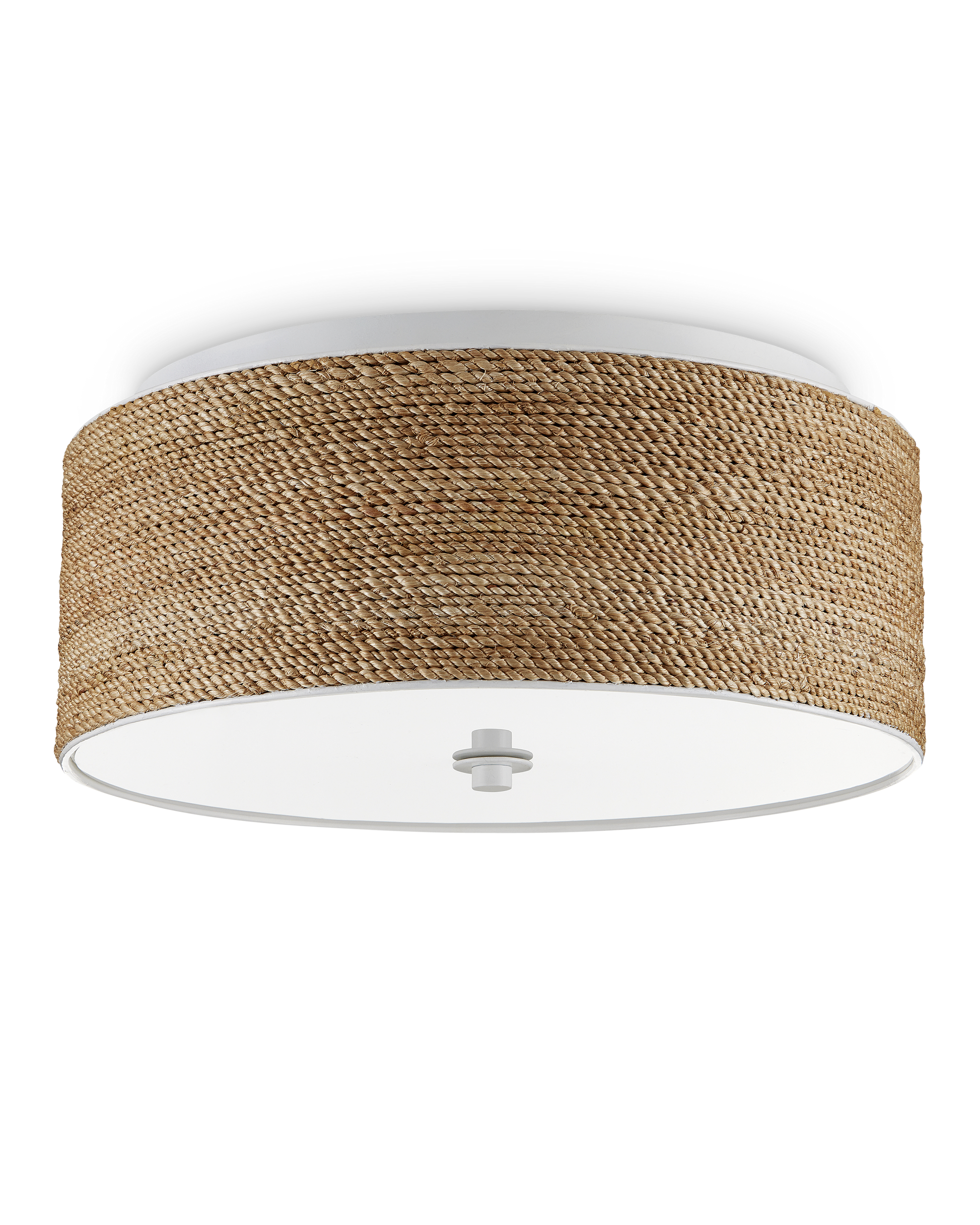 Abaca rope is densely woven around the circumference of the Coulton Flush Mount. Clarence Mallari designed the rope flush mount to be luminous. Choices that enhance the glow include the sugar white finish and the acrylic diffuser. This fixture illustrates how painstaking it is to weave natural fibers so consistently and evenly to create the textural rows that bring it warmth.