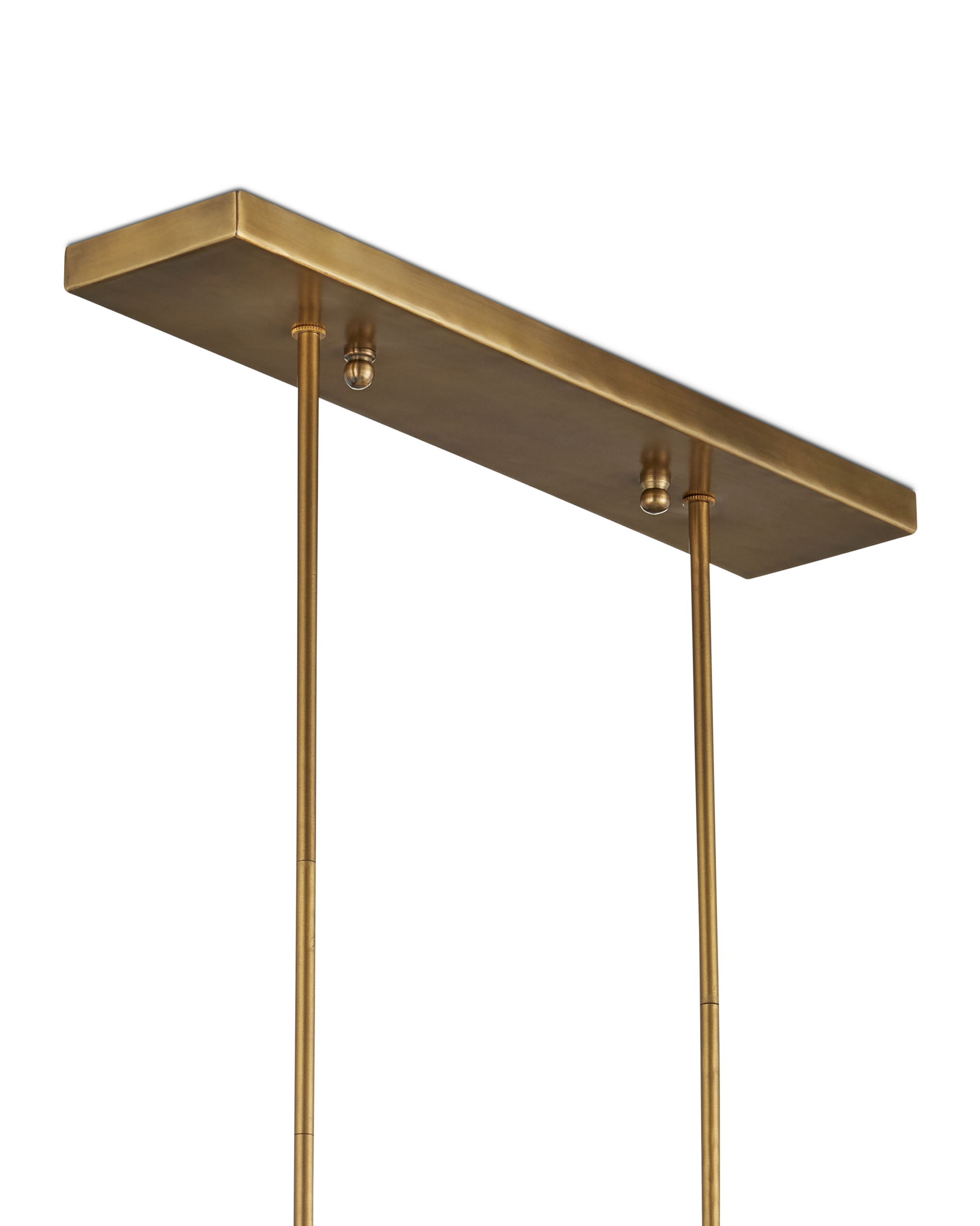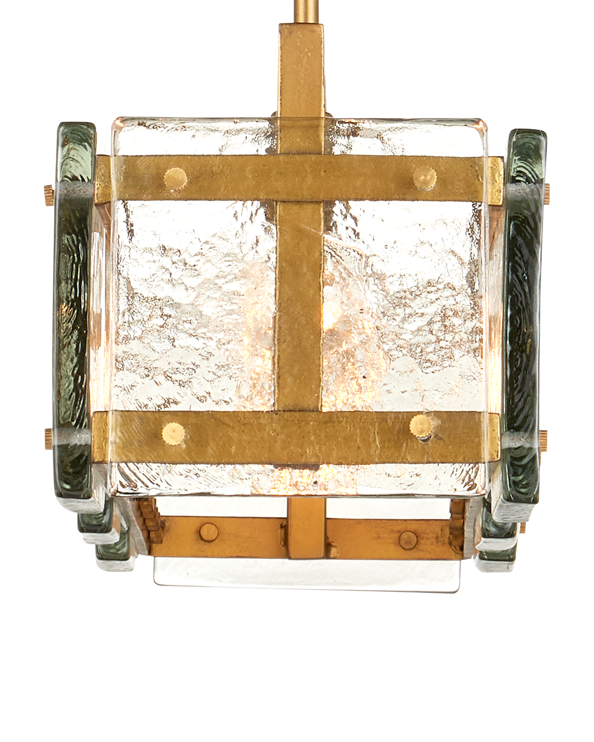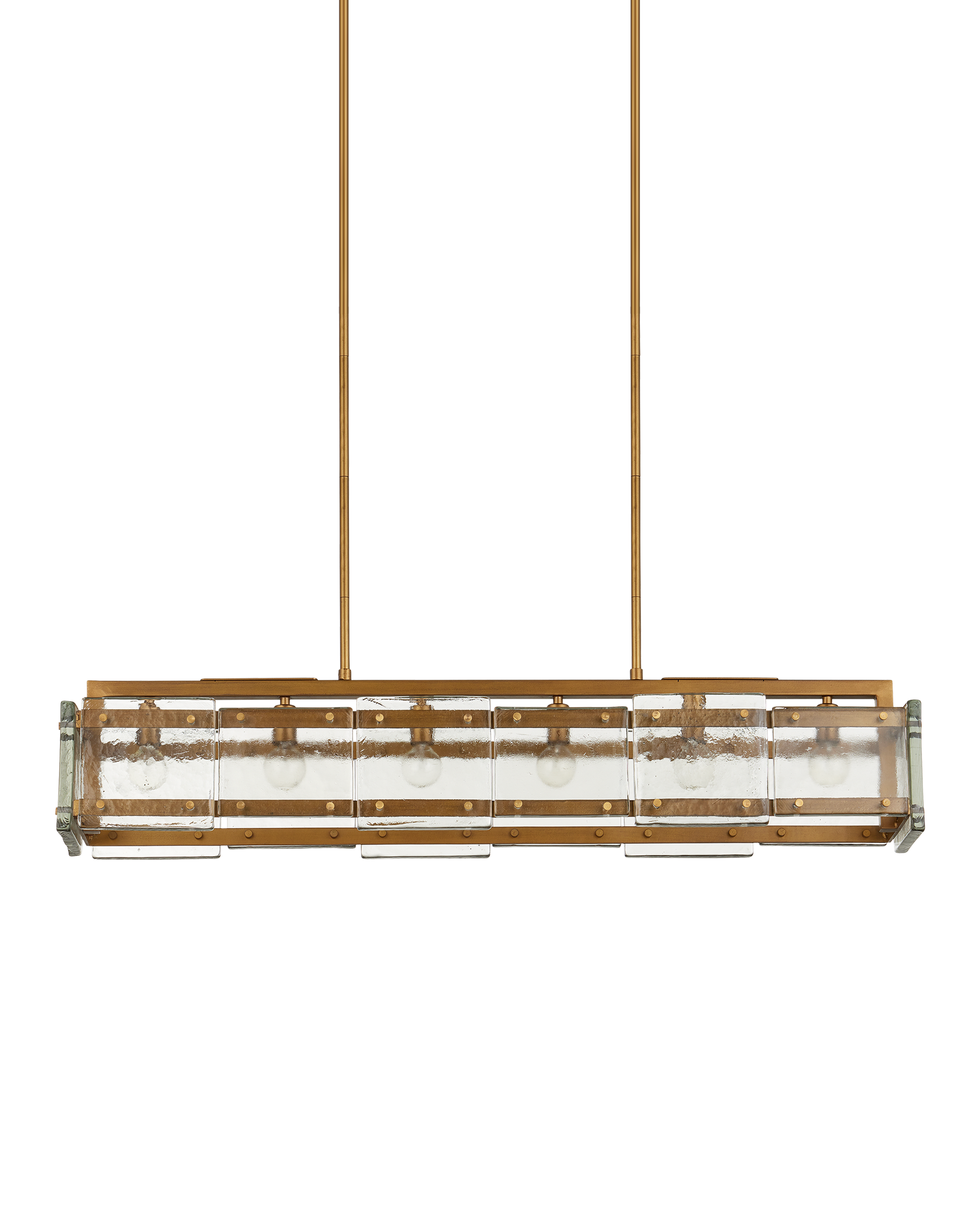 Clarence Mallari designed the Countervail Rectangular Chandelier with its panes of thick cast glass. The textural surfaces were the inspiration for this piece because the mottled nature of the glass enhances the glow of the chandelier. Each piece of the material that is fastened to a metal frame in an antique brass finish is unique. Mallari designed the panes to be fastened in place with sophisticated screws, which makes each piece removable. Adjustable from 12.75" to 54.75" with use of included chain/rod kit/cable. If your space calls for a longer drop, additional chain/rods/cable is available for purchase.