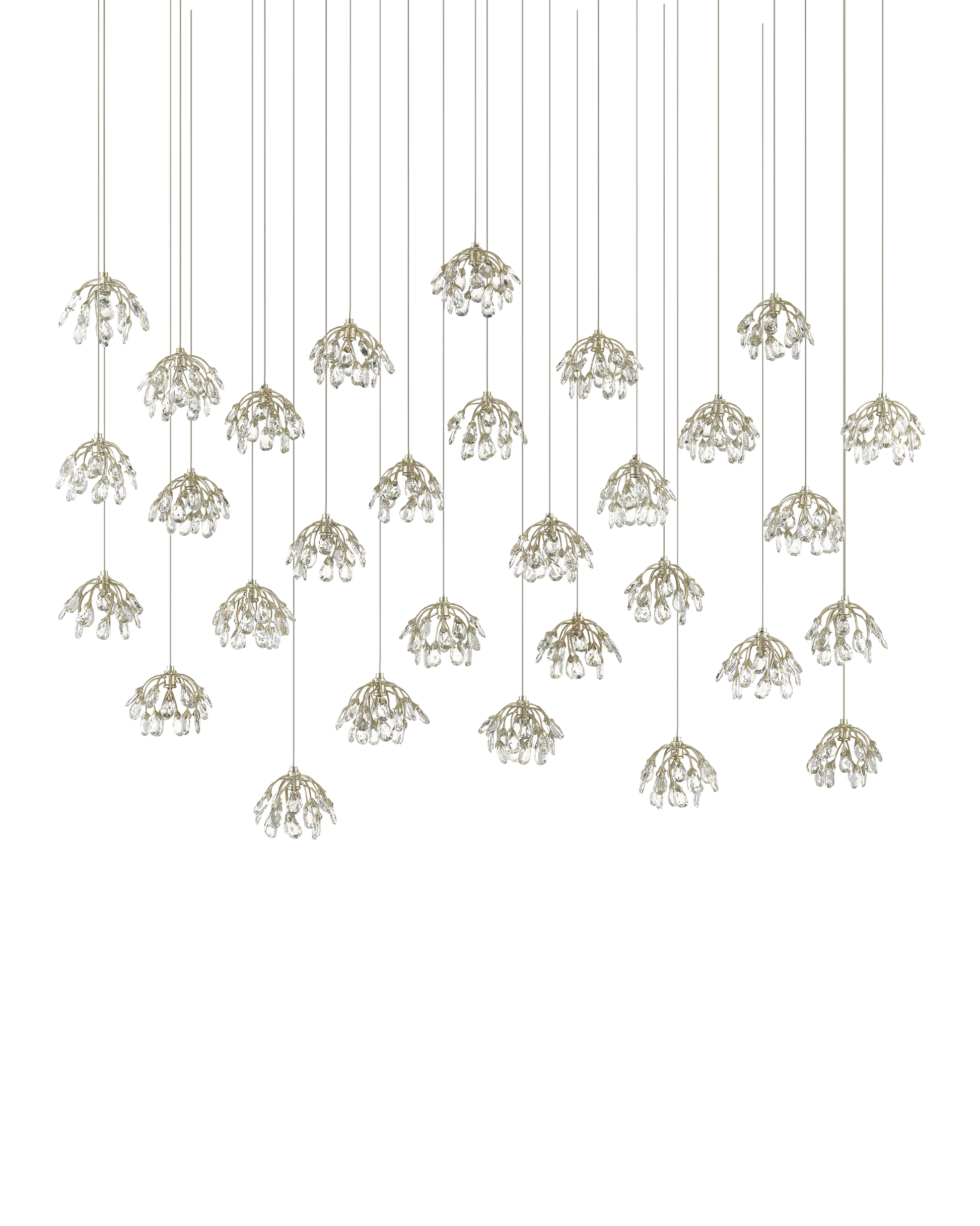 The Crystal Bud 30-Light Multi-Drop Pendant dangles flowers made of delicate faceted crystals from its canopy to make the shades effervescent and graceful. The canopy of this piece is luminous in a painted silver finish. This fixture is among Currey & Company's multi-drop pendant collection, which includes multiple configurations.