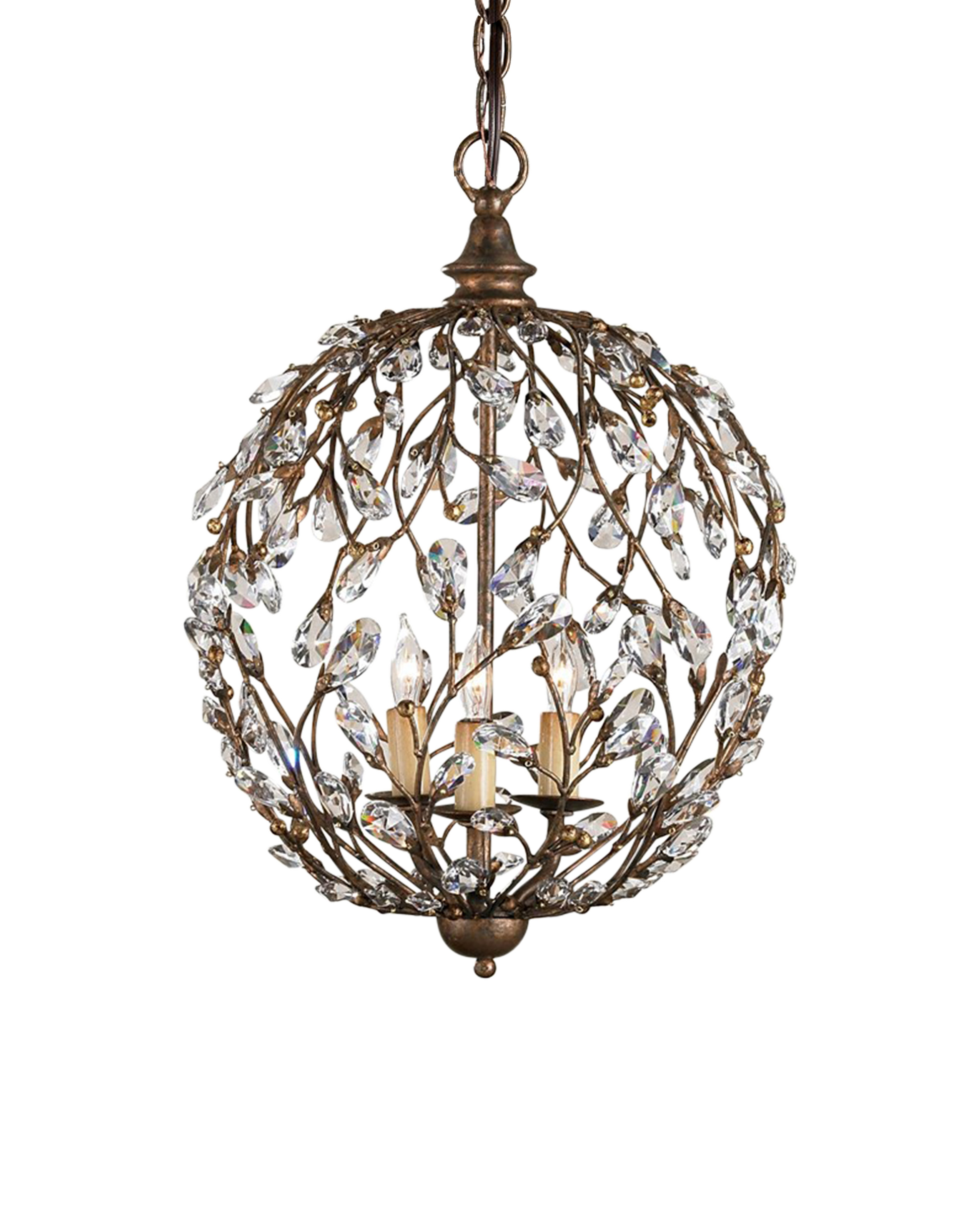 The Crystal Bud Cupertino Orb Chandelier has delicate faceted crystals unfurling from vines that flow along its globe-like body. The rust-colored metal in a Cupertino finish serves as a warm contrast to the luminous glass, the interplay making the profile of this crystal chandelier complex. This is one of the fixtures in the varied Crystal Bud family of lights.