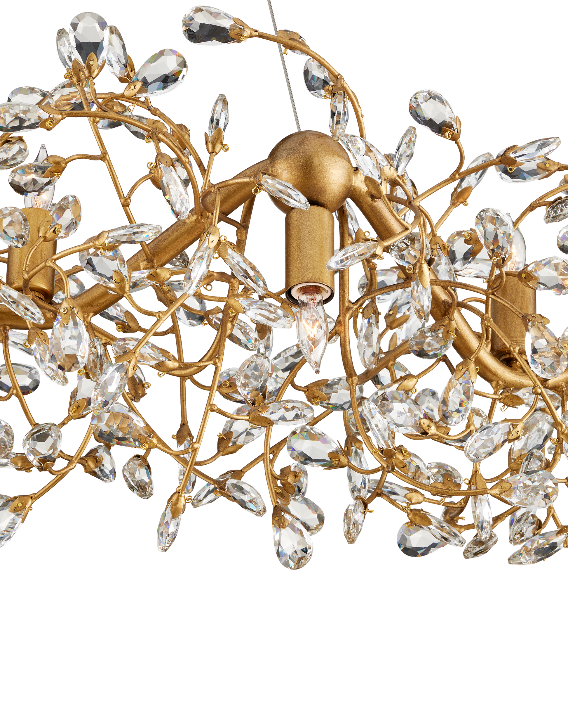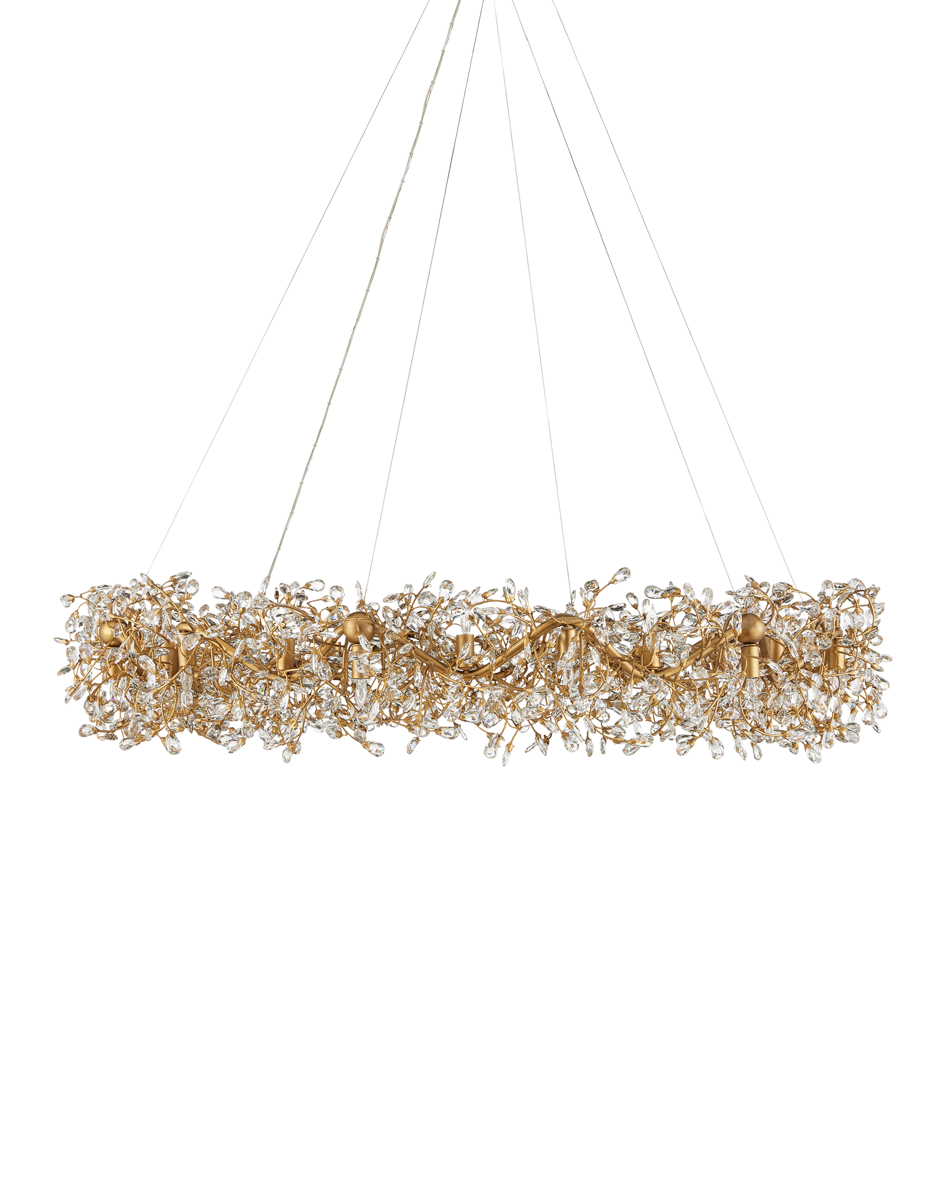 The Crystal Bud Grande Ring Chandelier has delicate faceted crystals unfurling from vines that flow around the fixture. The gleaming metal in a brass finish serves as a warm contrast to the luminous crystals; the interplay making the profile of this fixture complex and interesting. This stunning crystal chandelier is nearly 50 inches in diameter and the lights alternate pointing up and down to increase the sparkle and the luxurious aura. Adjustable from 36" to 102" with use of included chain/rod kit/cable. If your space calls for a longer drop, additional chain/rods/cable is available for purchase.