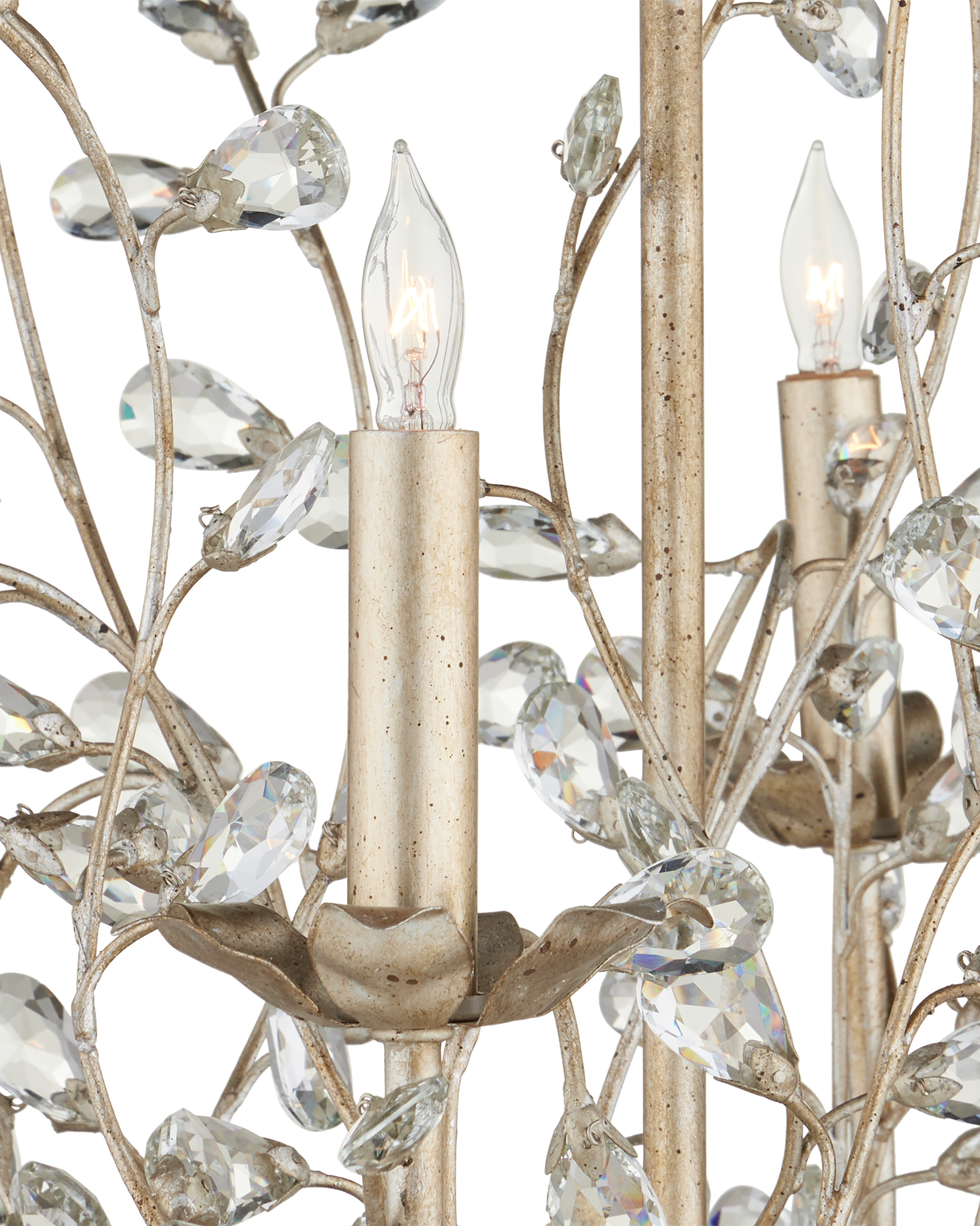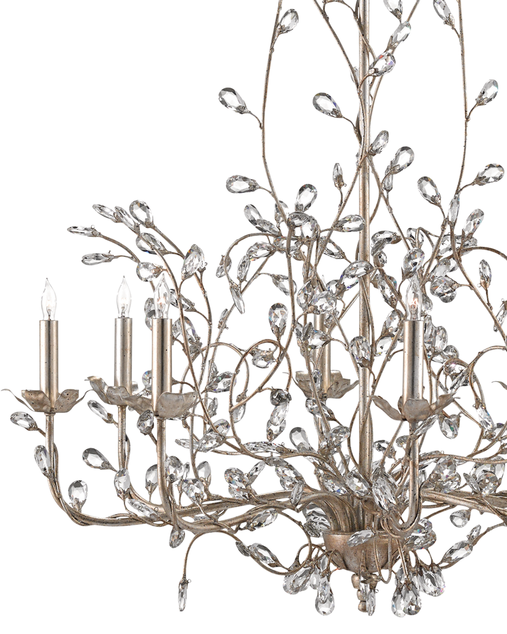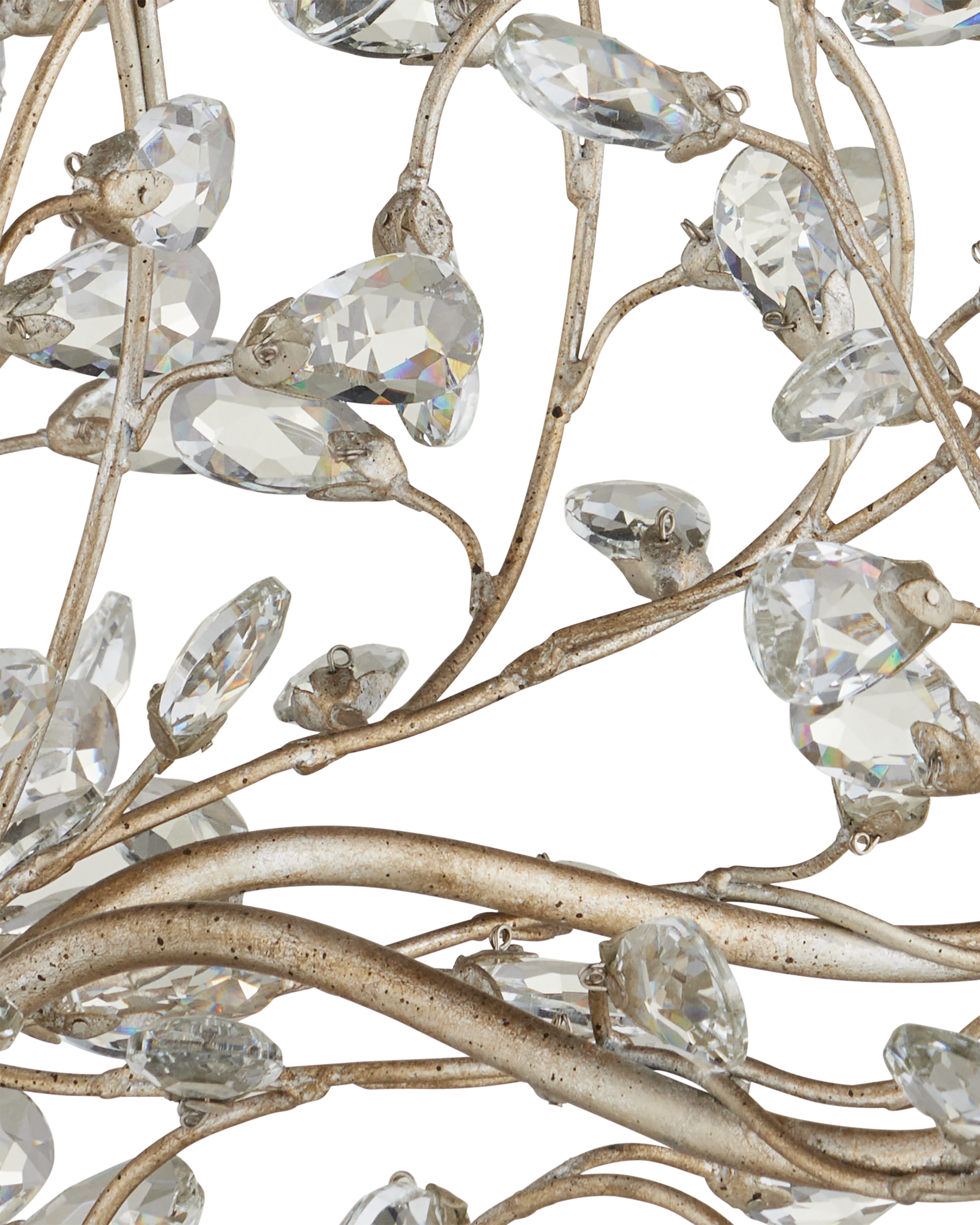 The Crystal Bud Silver Large Chandelier has delicate faceted crystals unfurling from vines that flow along its frame. The metal in a silver Granello finish brings greater sheen to the luminous glass, the interplay making the profile of this crystal chandelier radiant. This is one of the fixtures in the varied Crystal Bud family of lights. Adjustable from 38.25" to 105" with use of included chain/rod kit/cable. If your space calls for a longer drop, additional chain/rods/cable is available for purchase.
