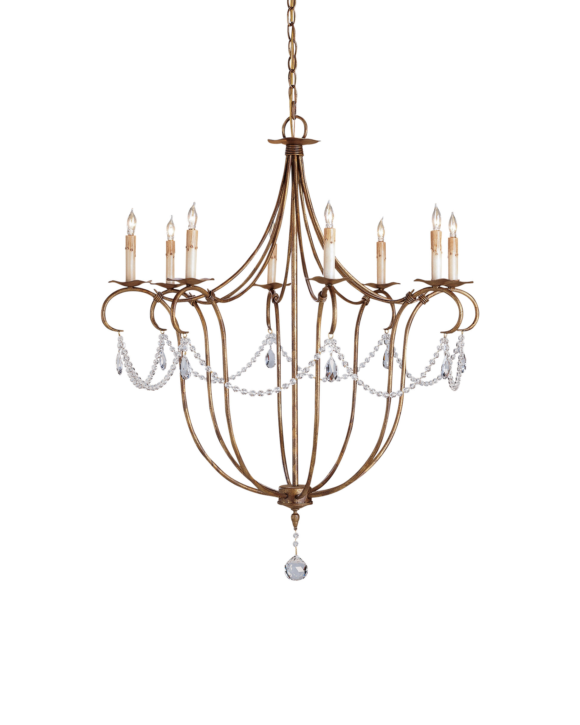 The Crystal Lights Gold Large Chandelier drips with crystal beads that swag between wrought iron curls in a Rhine gold finish. These support lovely teardrop pendants. The gold chandelier balances its candelabra bulbs on bobeches sitting atop its slender arms. The Crystal Lights family includes a number of designs in a variety of finishes.
