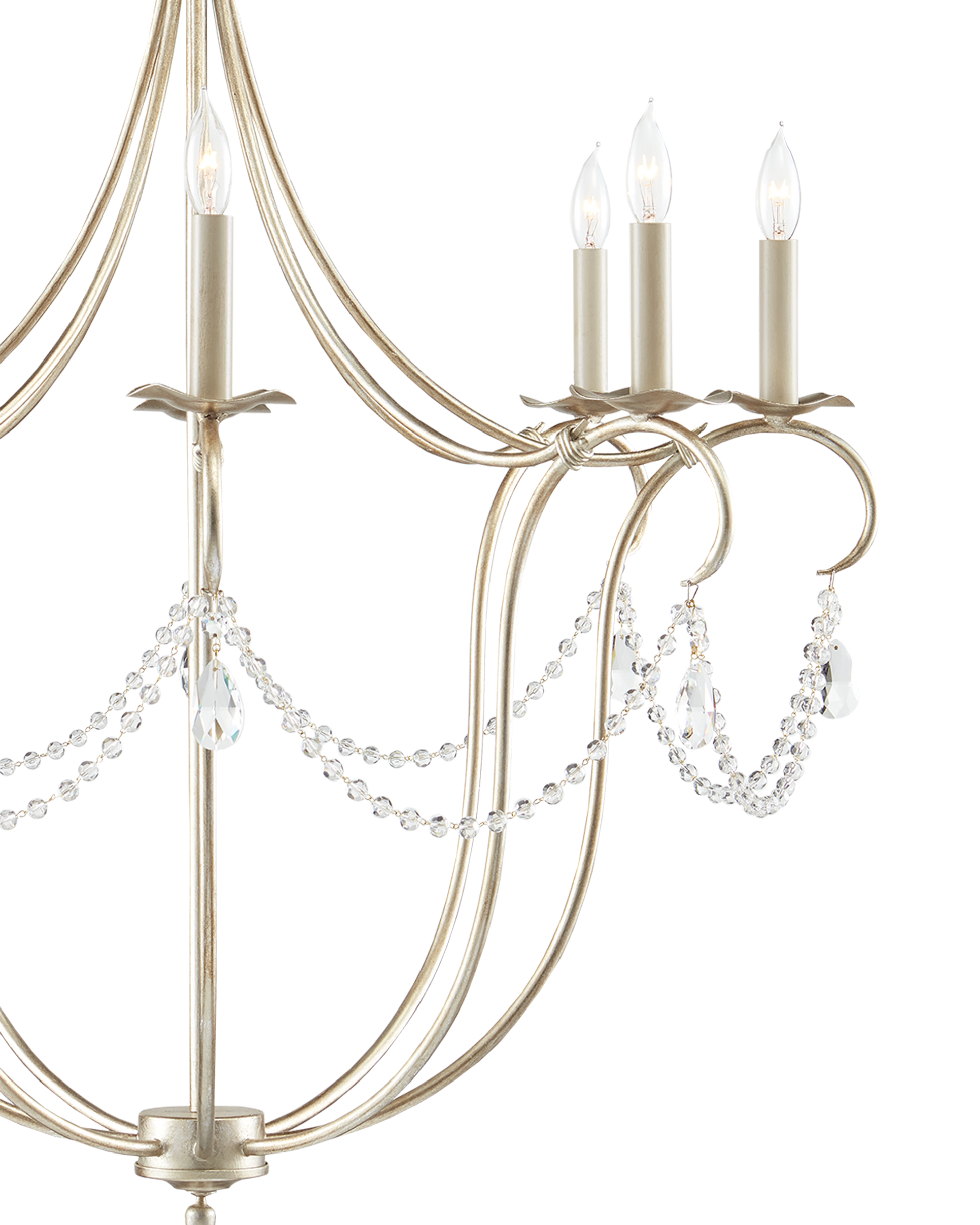 The Crystal Lights Silver Large Chandelier drips with crystal beads that swag between wrought iron curls in a silver leaf finish. These support lovely teardrop pendants. The silver chandelier balances its candelabra bulbs on bobeches sitting atop its slender arms. The Crystal Lights family includes a number of designs in a variety of finishes.