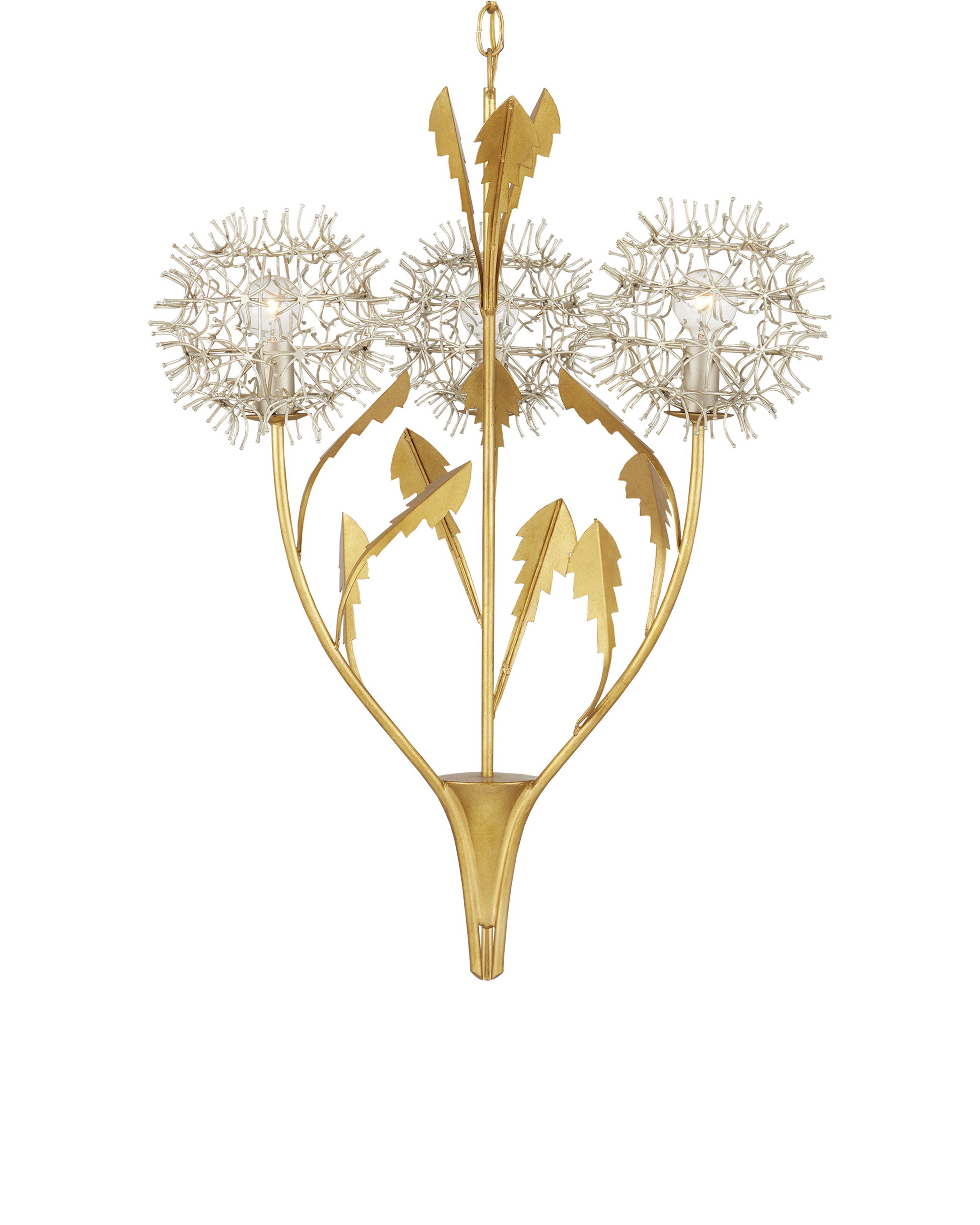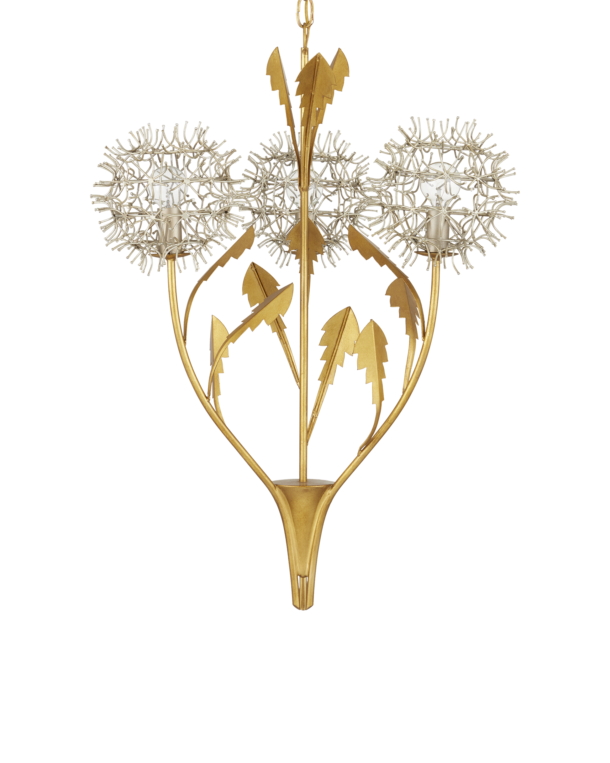 The Dandelion Silver & Gold Pendant is a masterful composition that celebrates its namesake flower. The puff-balls that surround the bulbs are made of nails that are bent and welded together, a process that is extremely labor intensive. Made of wrought iron, the pendant's bottom cone, stems, and leaves are in a contemporary gold leaf finish, while the floral elements are in a mix of contemporary silver leaf and contemporary silver finishes. This special piece expressively celebrates nature. Adjustable from 35.25" to 103.25" with use of included chain/rod kit/cable. If your space calls for a longer drop, additional chain/rods/cable is available for purchase.