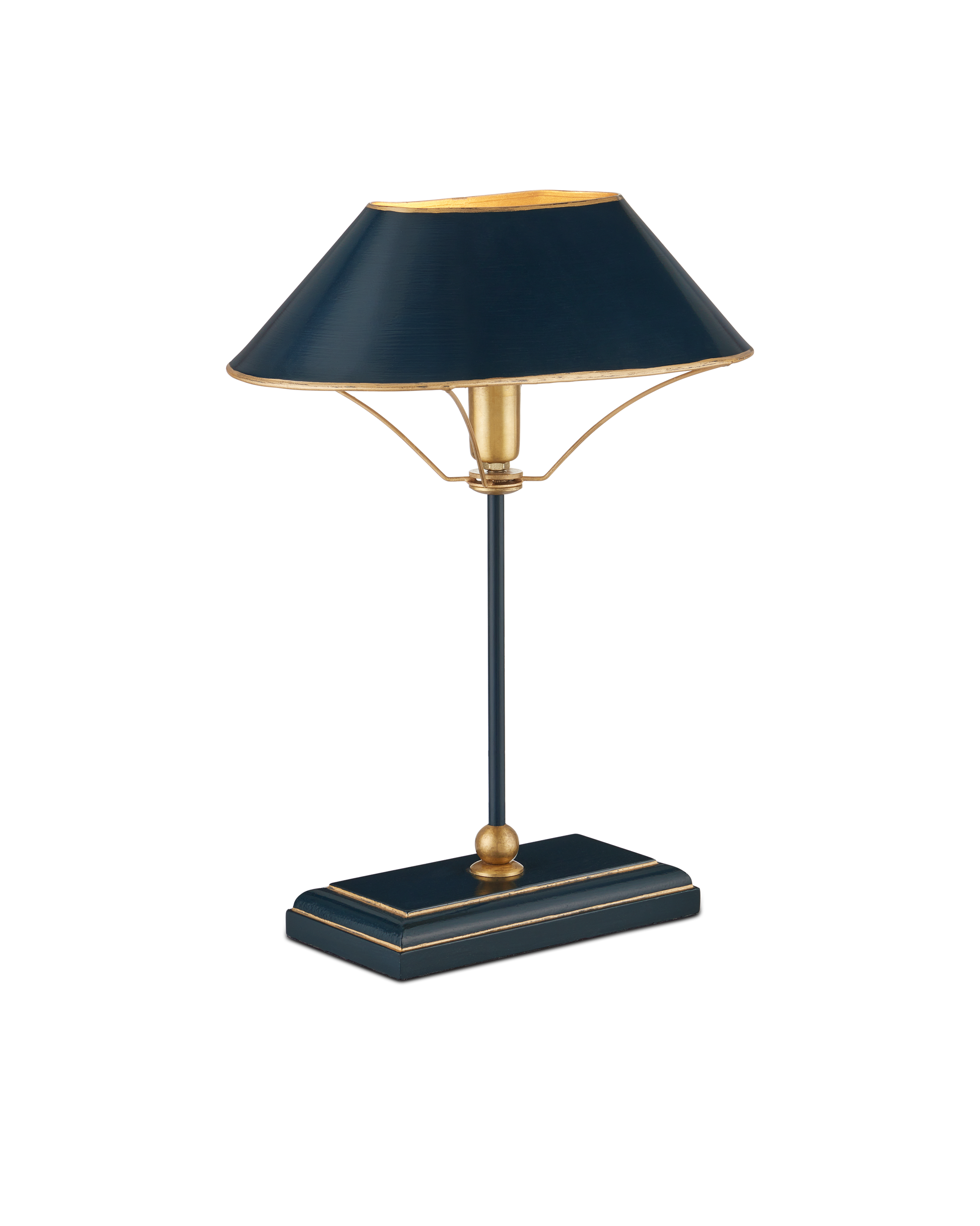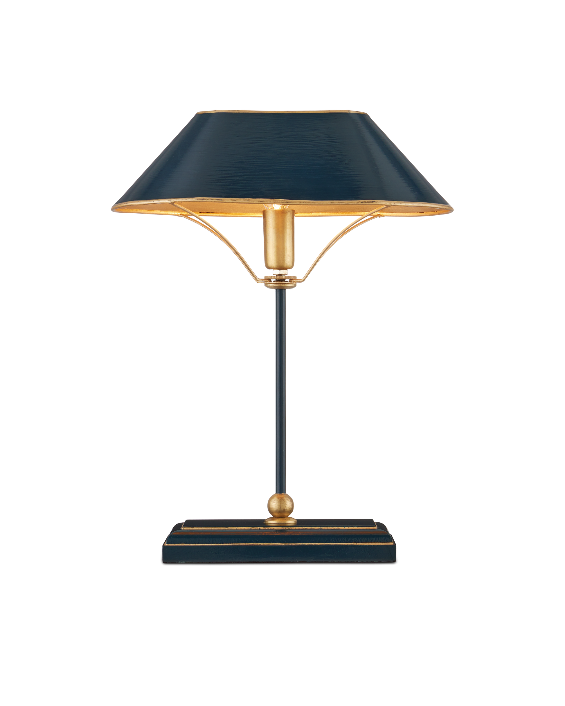 The Daphne Table Lamp looks as if it is made of one material in two distinctive finishes but the base is made of wood while the other elements on the navy-blue table lamp are made of iron and brass. The shape of the oval shade with its painted gold trim is a design detail, as is the gold finish on the interior of the shade that will warm the light bouncing off it.