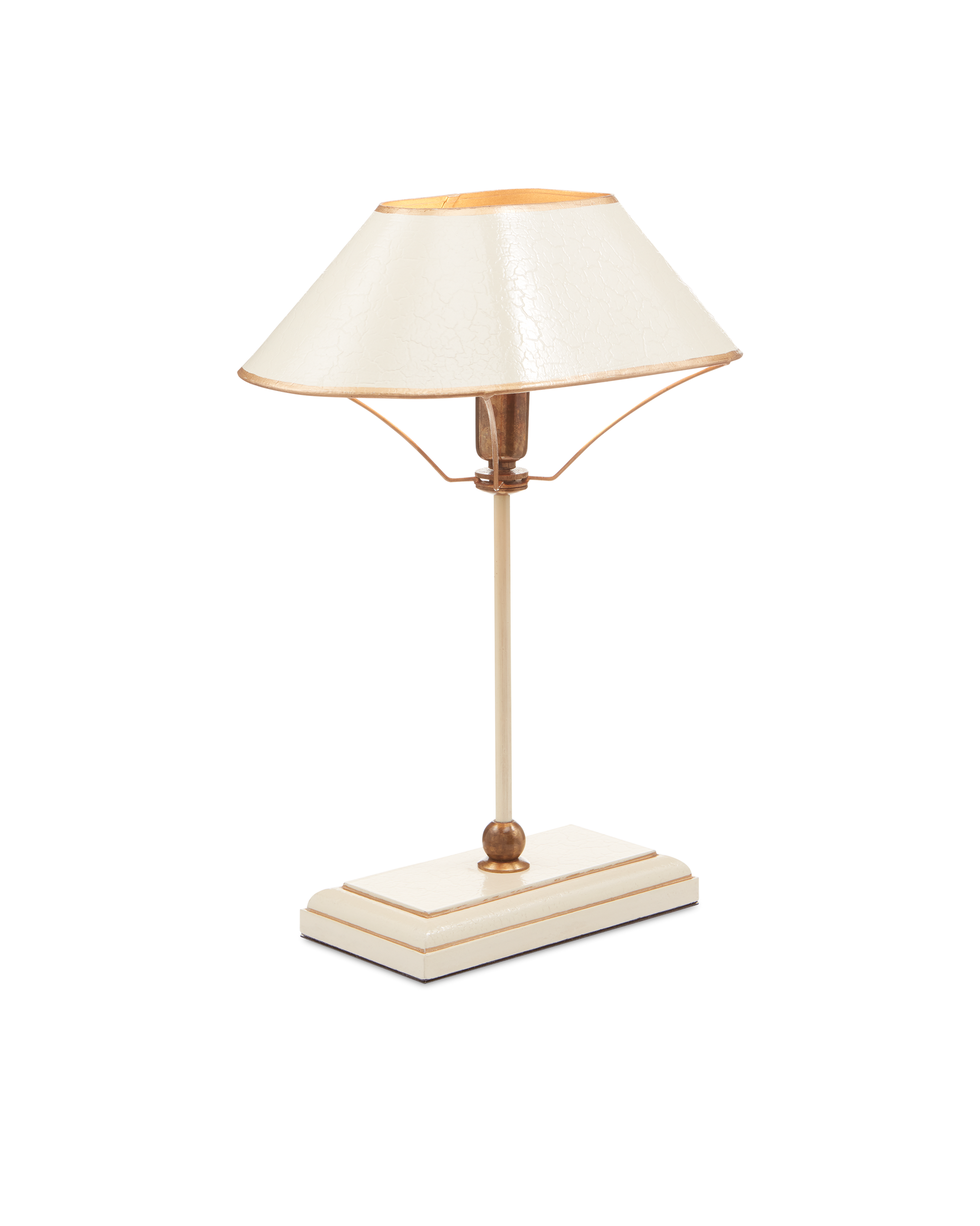 The Daphne Table Lamp looks as if it is made of one material in three distinctive finishes but the base is made of wood while the other elements on the ivory table lamp are made of wrought iron and brass in antique brass and gold finishes. The shape of the oval shade with its painted trim is a design detail worth noting.