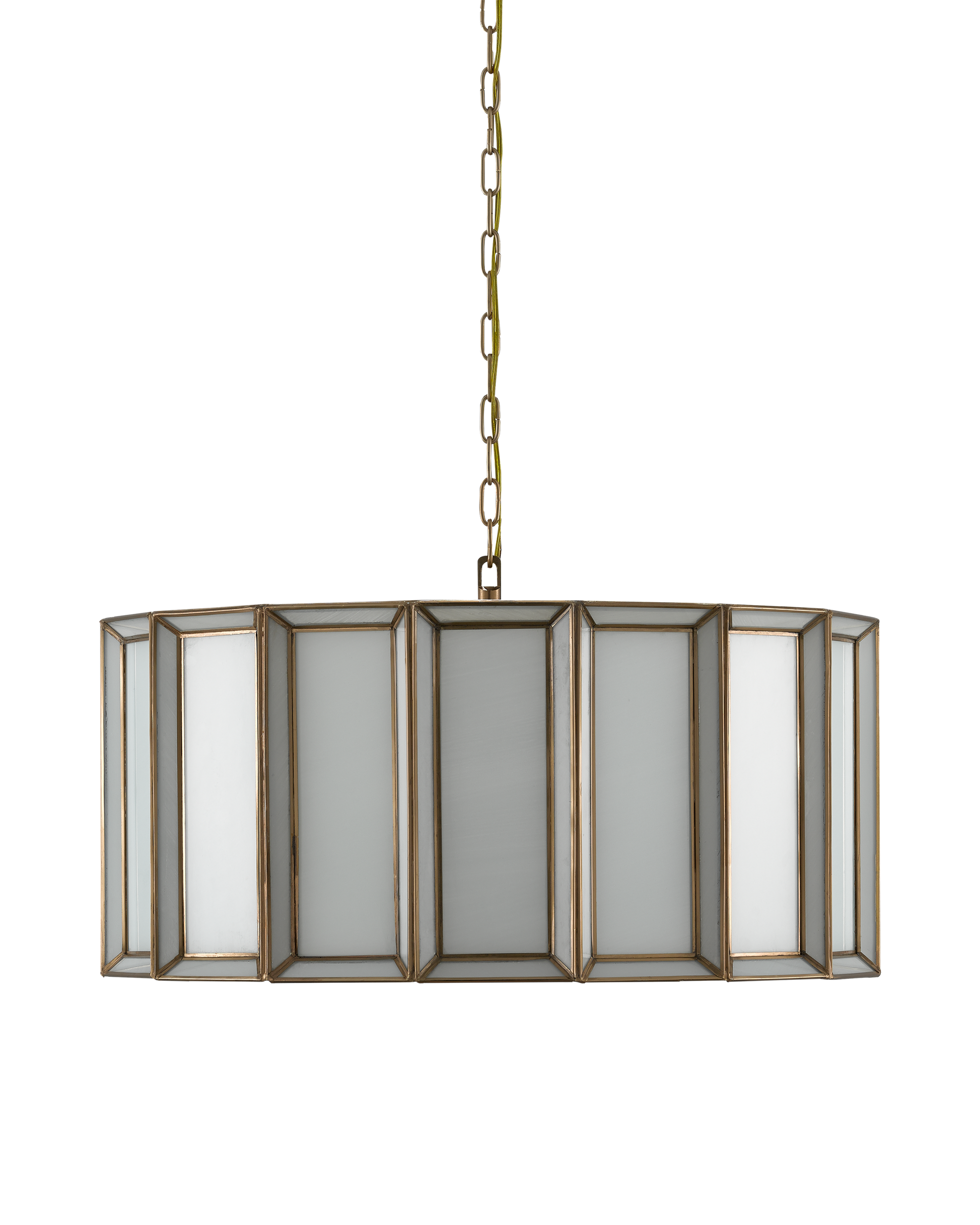 When a soft glow is desired, milk glass is one of the best materials to diffuse illumination. Our Daze Large Pendant is made of articulated panels of white milk glass that are joined together by ribs of metal in an antique brass finish. This white pendant, designed by Clarence Mallari, will turn luminous when it is switched on. Adjustable from 19.5" to 87.5" with use of included chain/rod kit/cable. If your space calls for a longer drop, additional chain/rods/cable is available for purchase.