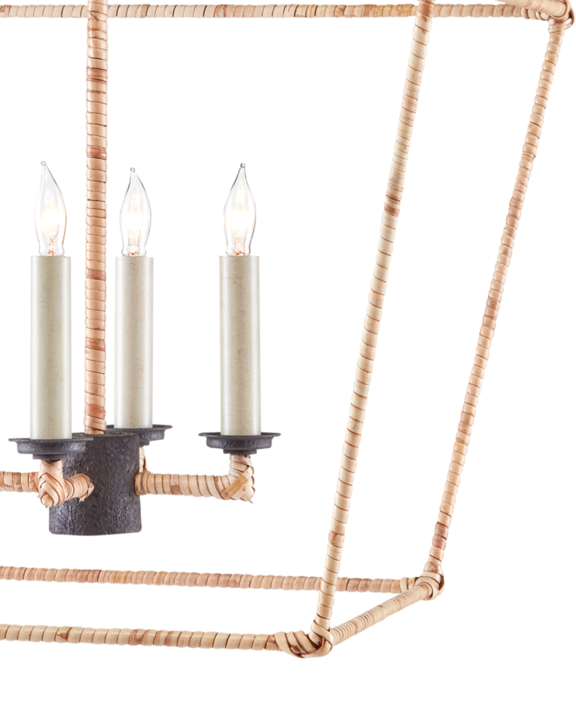 The Denison Medium Natural Lantern is a hammered wrought-iron fixture in a Mole black finish that is wrapped in rattan. The classic lantern shape has stood the test of time to make it one of our most popular offerings. A design element of note is the square that fastens the lantern to the chain. Adjustable from 27.5" to 96.5" with use of included chain/rod kit/cable. If your space calls for a longer drop, additional chain/rods/cable is available for purchase.