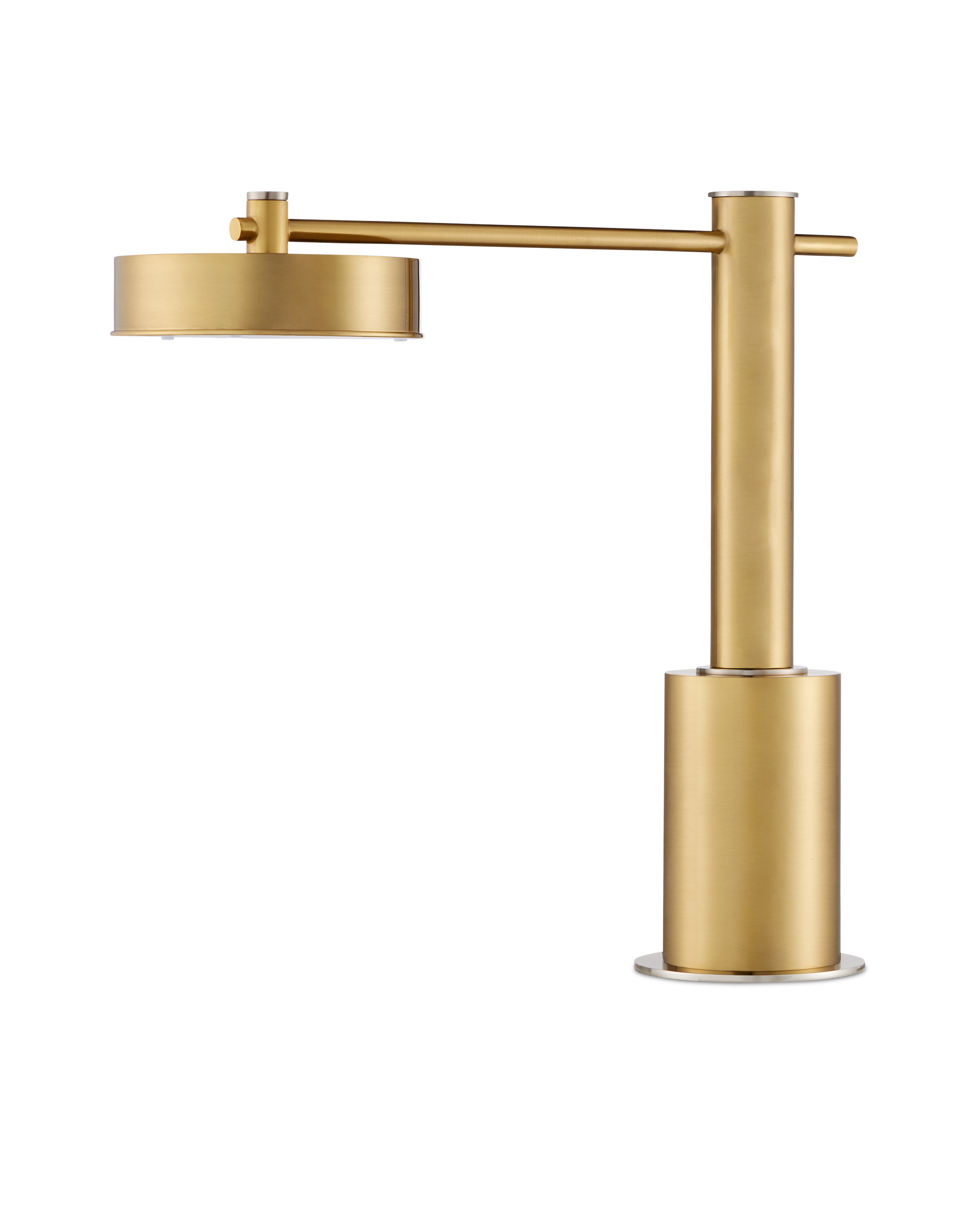 Clarence Mallari designed the Dialect Desk Lamp that is fitted with integrated LED technology. The majority of the metal on the lamp is finished in brushed brass, but the thin disc details throughout are in a brushed nickel finish. This modern interpretation of a desk lamp has an acrylic diffuser to keep the light evenly distributed.