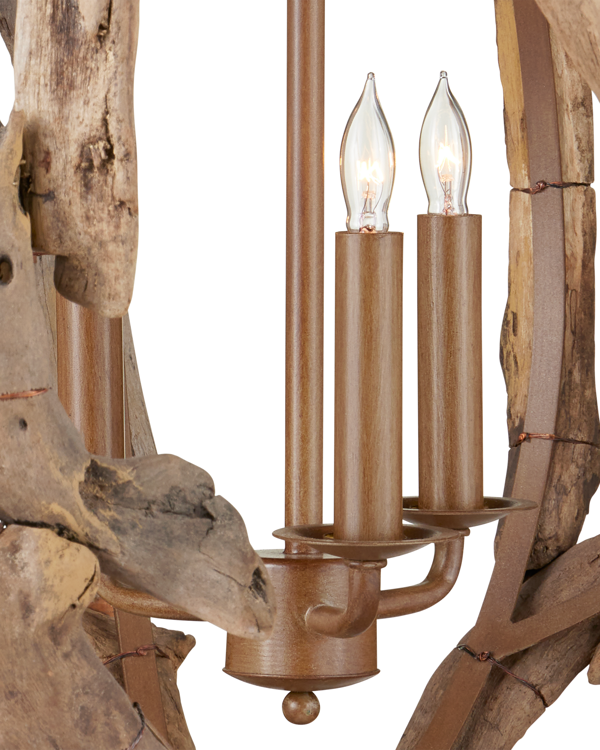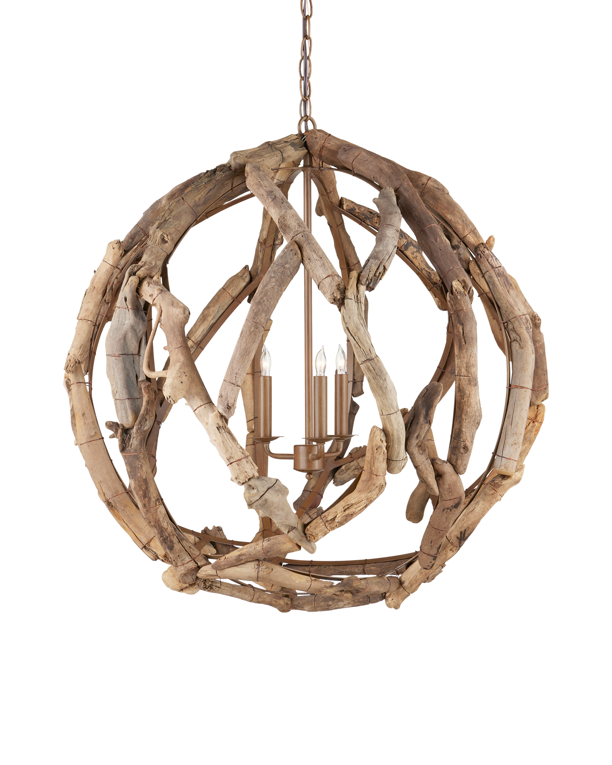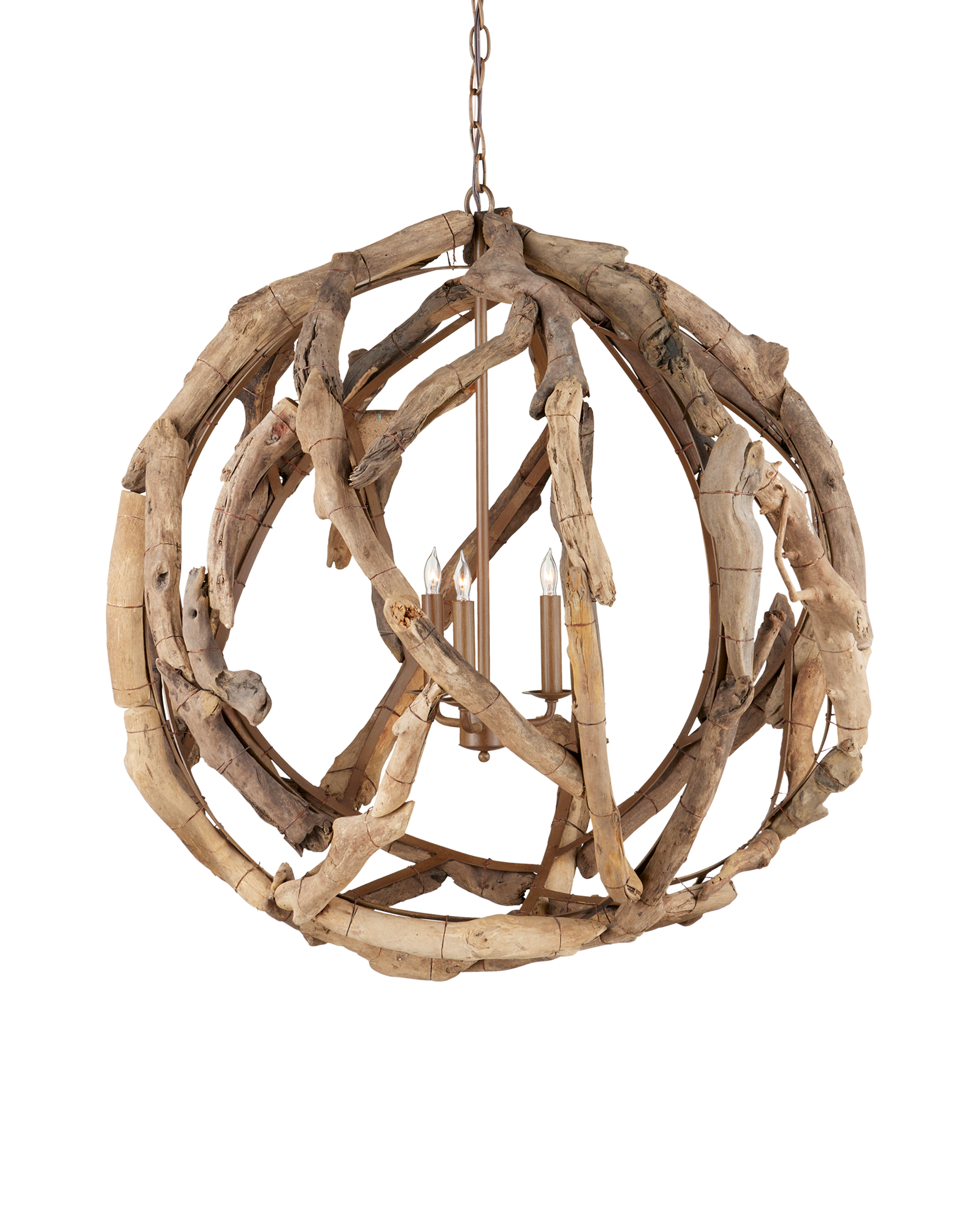 The Driftwood Orb Chandelier is crafted from hand-selected pieces of natural driftwood. The iron frame in a washed driftwood finish makes this a seamless tone-on-tone composition. The Driftwood is also available in a table lamp.