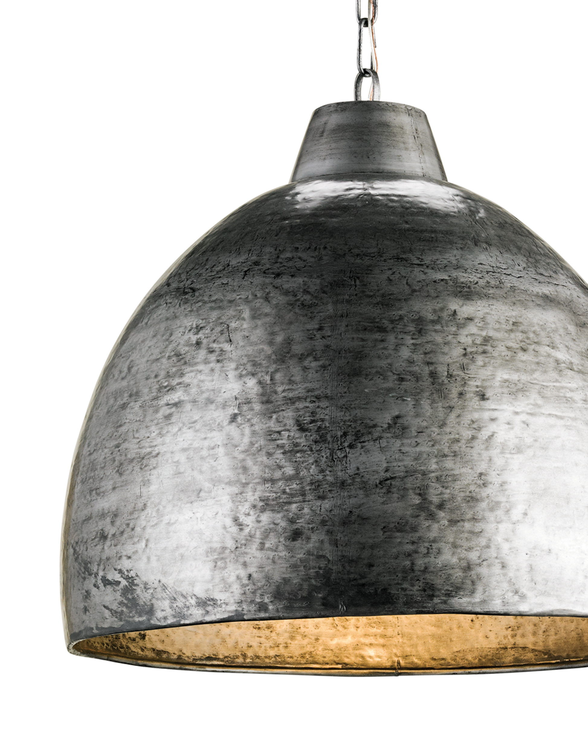 The Earthshine Steel Large Pendant has a hammered dome shape for a cool industrial look. Made of iron in a blackened steel finish, this sturdy silver pendant has a luminous glow on the interior.