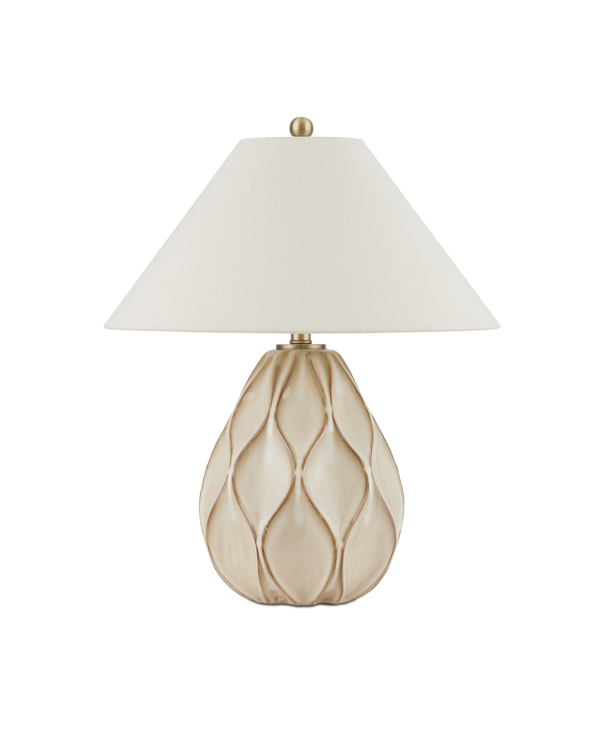 The undulating pattern on the pear-shaped body of the Edgemoor Table Lamp is reminiscent of macramé. Made of ceramic covered in a mix of beige and dark brown glazes, the peaks on the lamp stand out because they've been rubbed to show the deeper tones underneath. The hardware on this beige lamp is in a light antique brass finish, as is the finial.