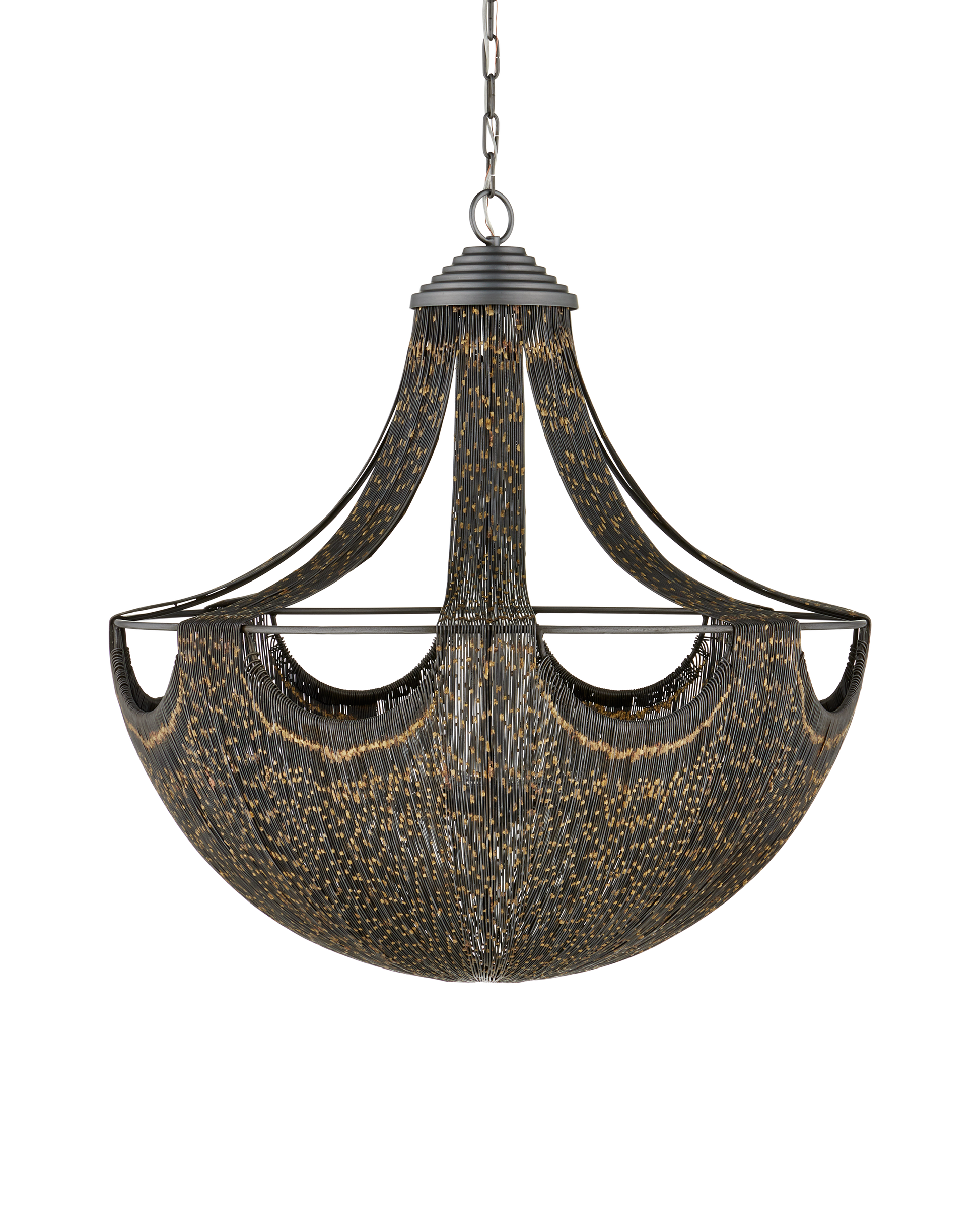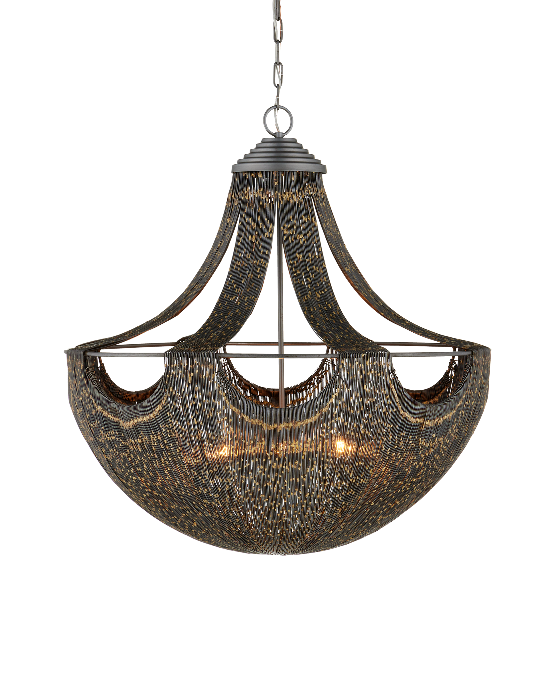 A sophisticated scalloped pattern transforms the bell-shaped Eduardo Chandelier to take it from typical to exceptional. Made of strands of thin iron wires that are wrapped continuously around the fixture's form, the dark brown chandelier glints like gold when light strikes it. Adjustable from 36.5" to 105.5" with use of included chain/rod kit/cable. If your space calls for a longer drop, additional chain/rods/cable is available for purchase.