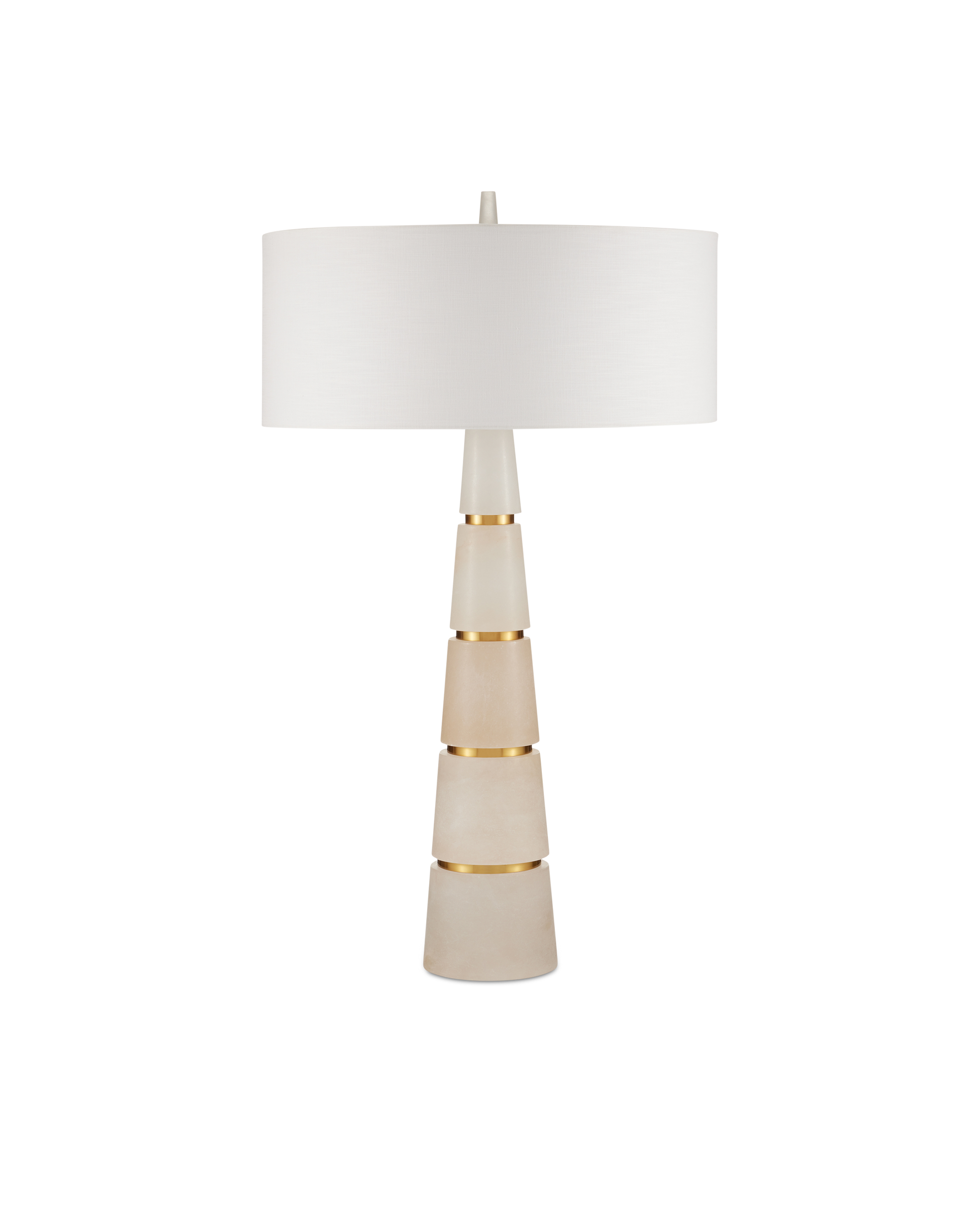 The Eleanora Table Lamp, designed by Tom Caldwell, has a modern feel that leans toward Hollywood glamour. Made of natural alabaster, the graduated segments of luminous material are cinched by brass rings that glow just as beautifully as the stone when the lamp is switched on. Design details of note are how the finial tapers as if it is an extension of the lamp's body, as well as the shallow profile of the off-white linen shade.