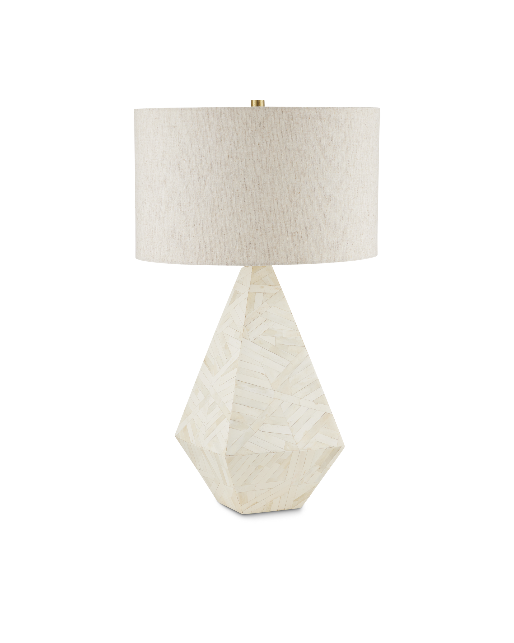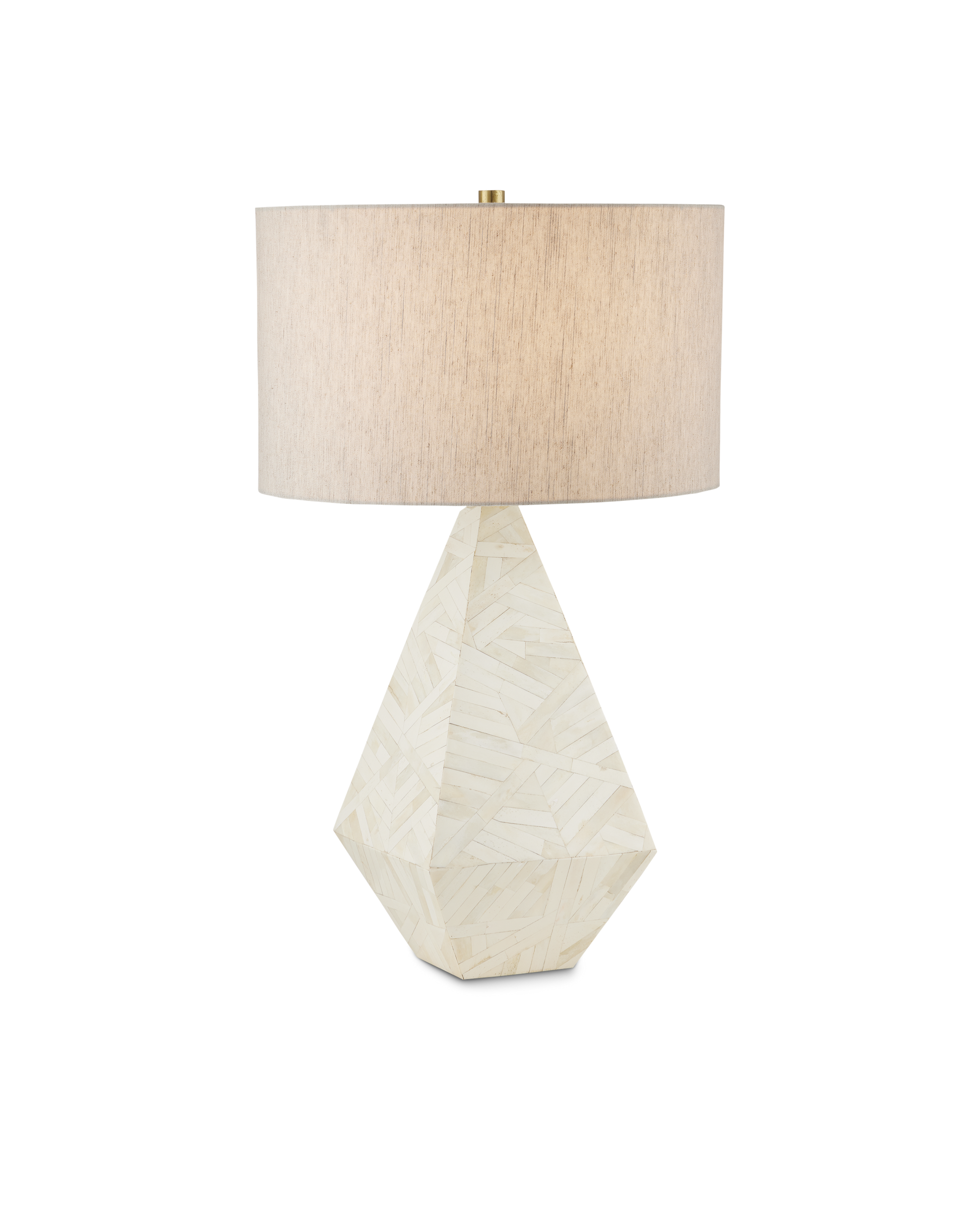 Tom Caldwell says of the Elysium White Table Lamp that the material and shape are the story: made of bone inlay, all hand-applied, this is a masterful creation. Affixing the random shapes of the pieces of bone to the telescoping shape of the lamp's body requires a painstaking attention to detail from the artisans. The hardware and finial are in an antique brass finish to draw out the warmer tones in the bone, as does the oatmeal linen shade.