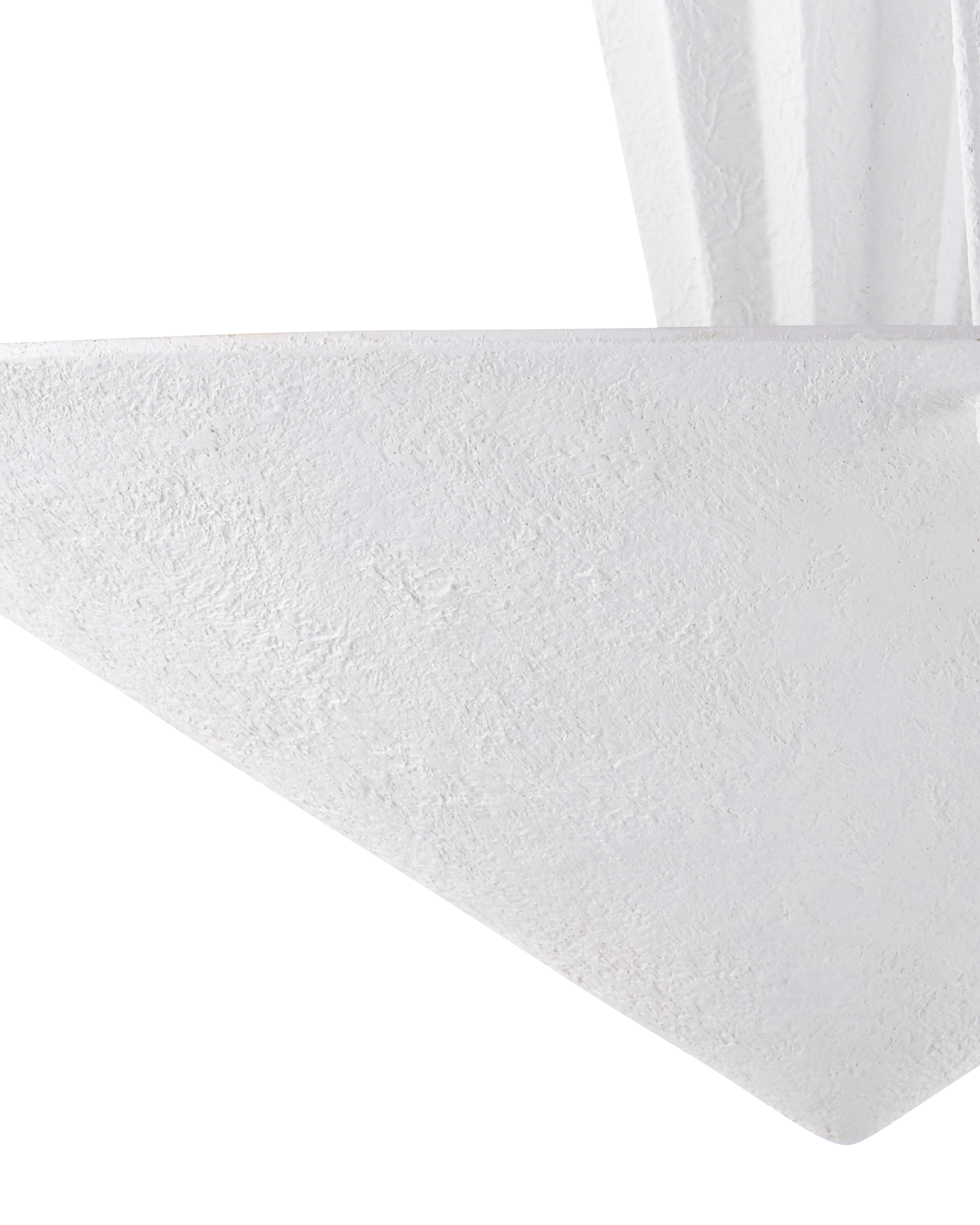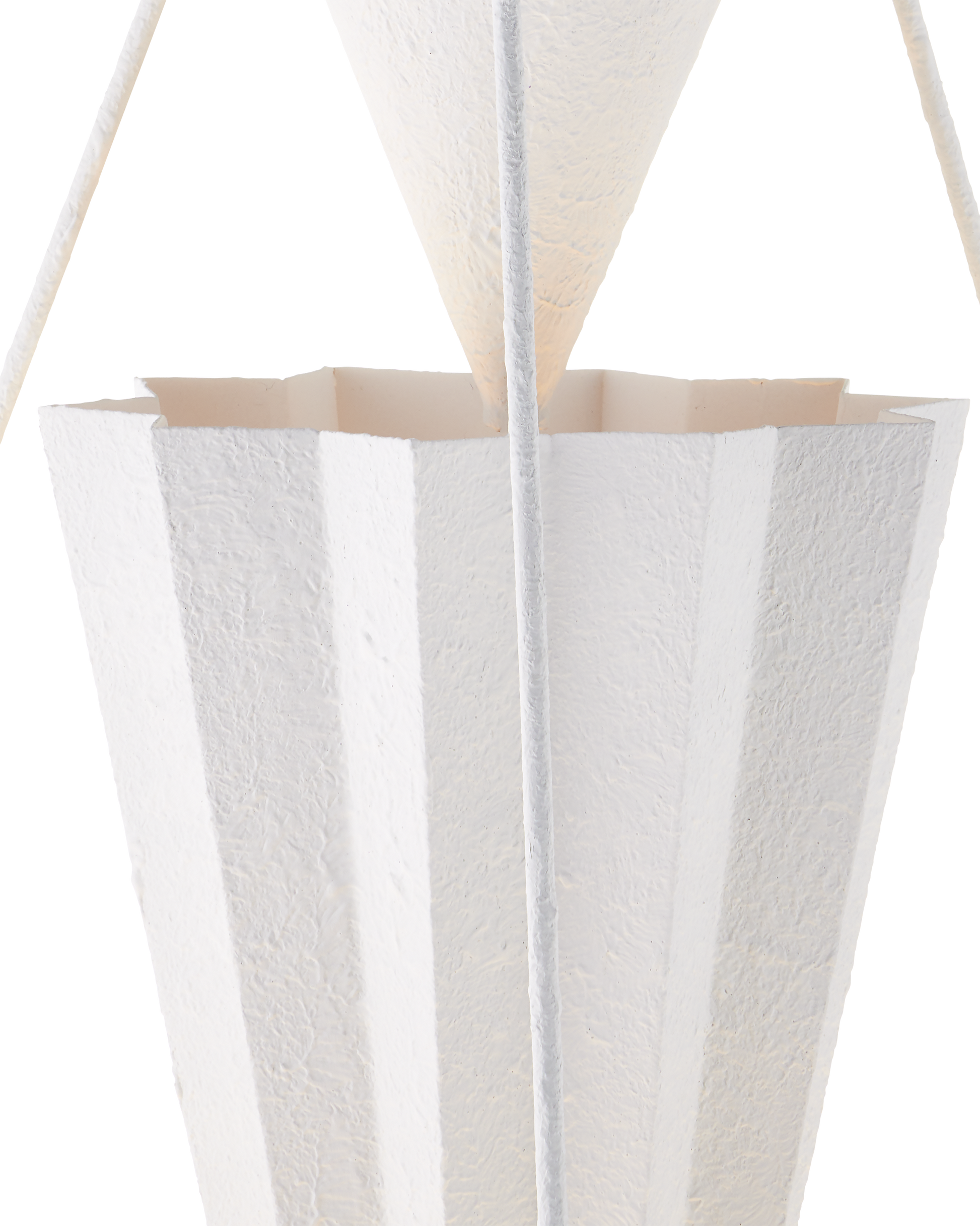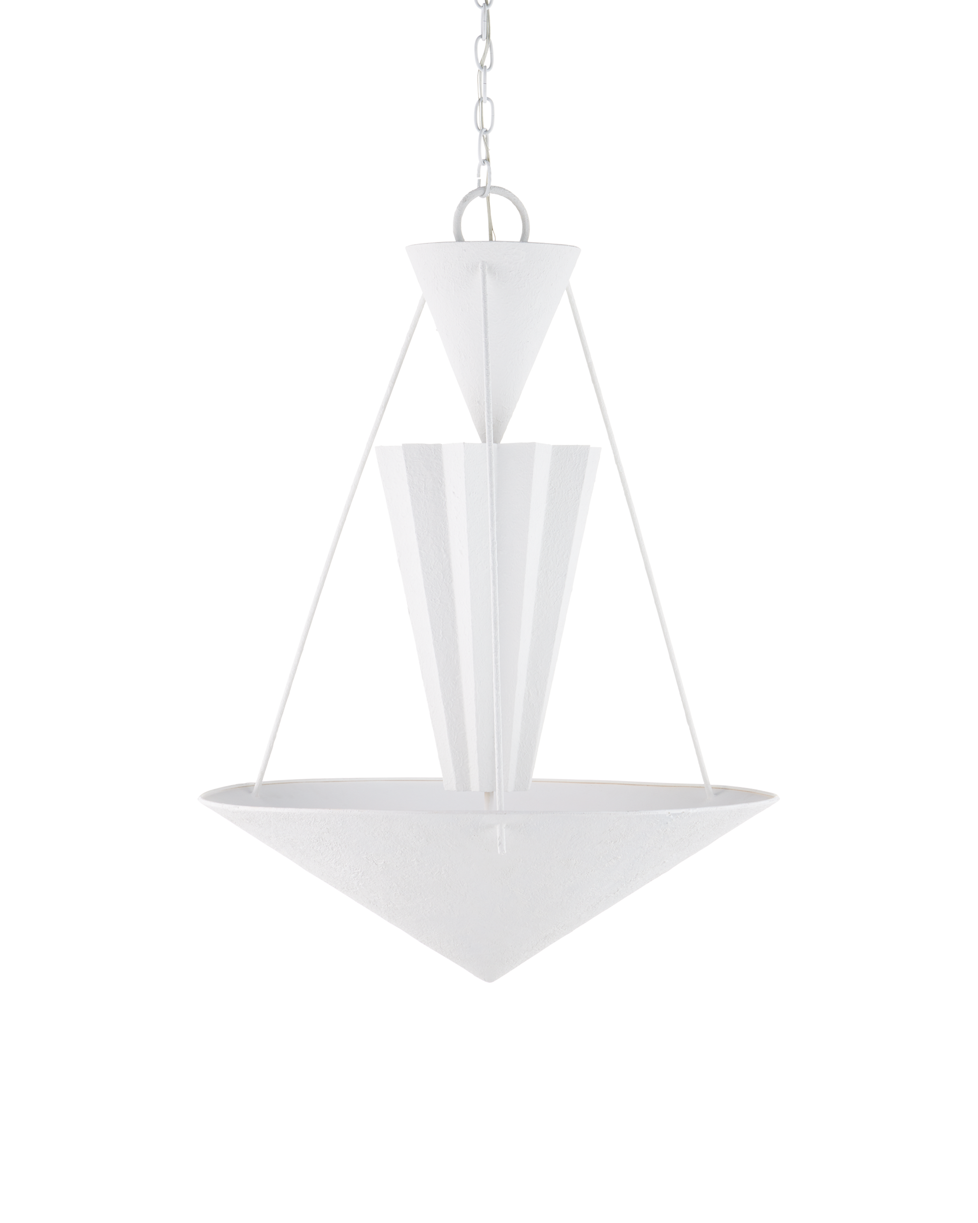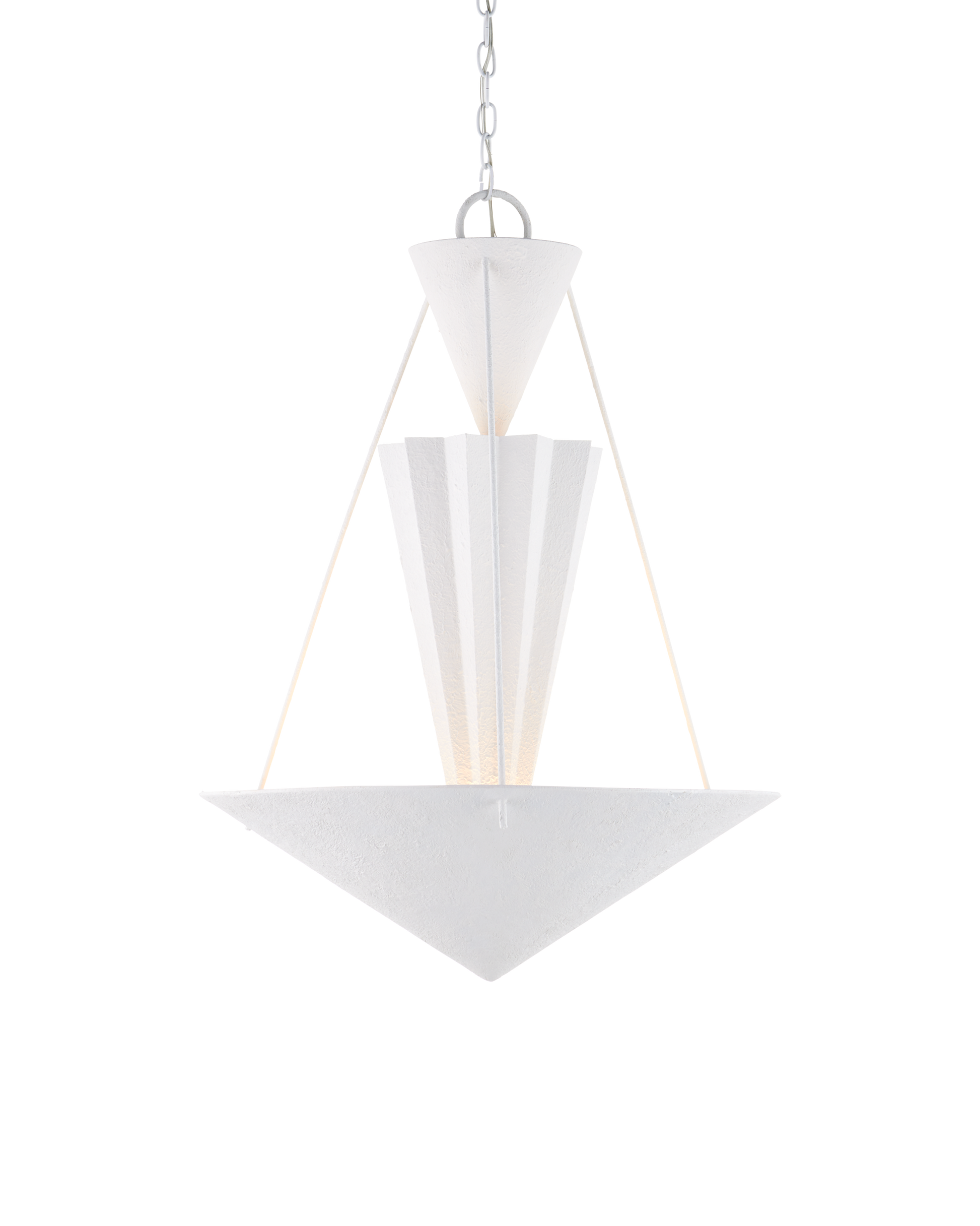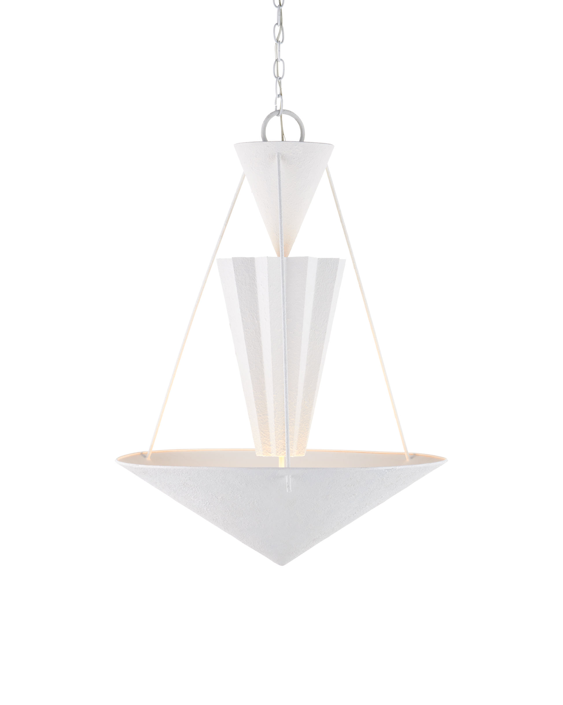 Playing with geometrical shapes that create tiers of up-light, the Empyrean Chandelier was designed with clean lines, making it as contemporary as designs come. The fluted shape of the middle shade is a design detail that brings added interest to the profile of this white chandelier. The wrought iron fixture is covered in a yeso blanco finish that creates a stippled effect to add a subtle tone-on-tone texture to the piece. Adjustable from 38.5" to 106.5" with use of included chain/rod kit/cable. If your space calls for a longer drop, additional chain/rods/cable is available for purchase.