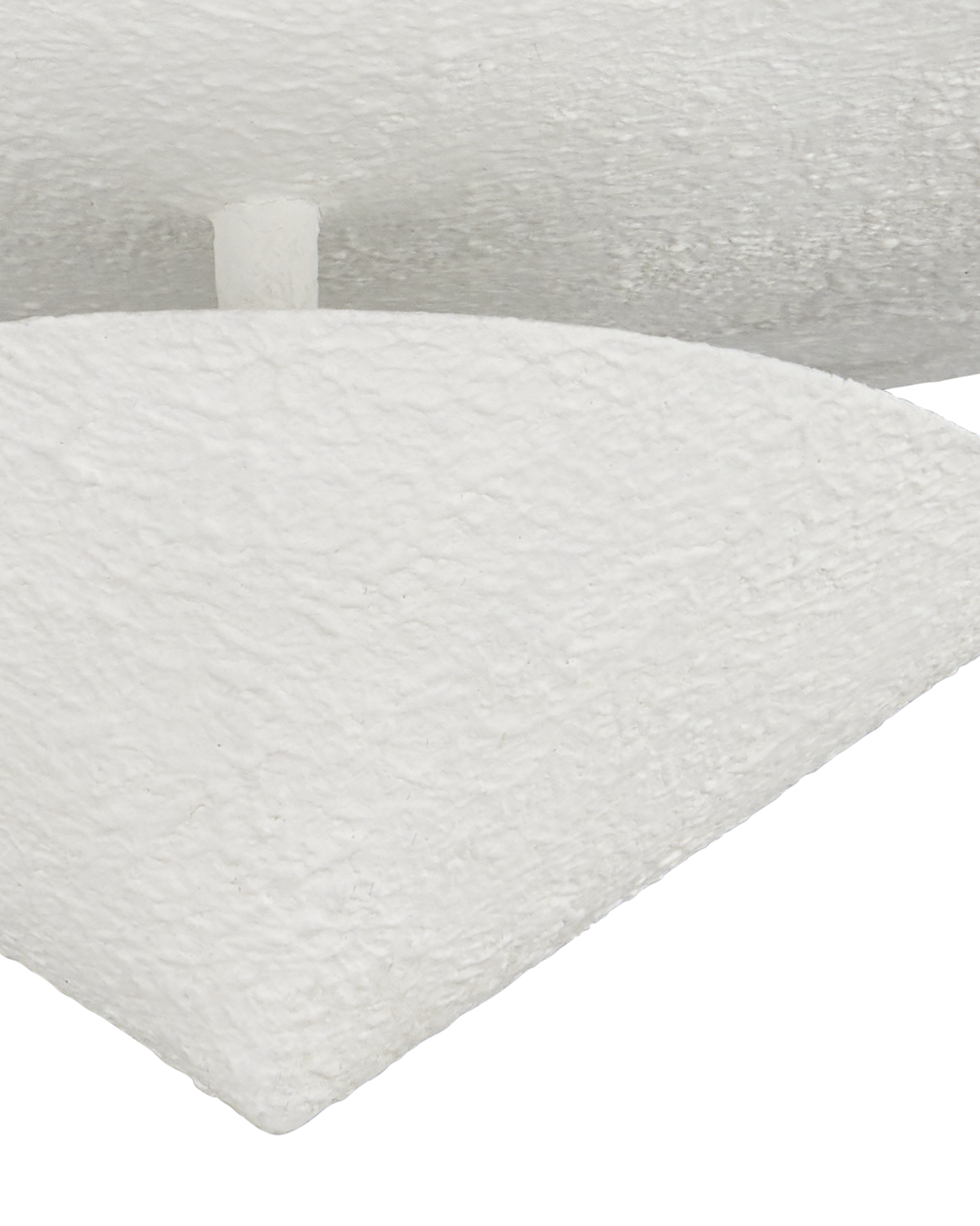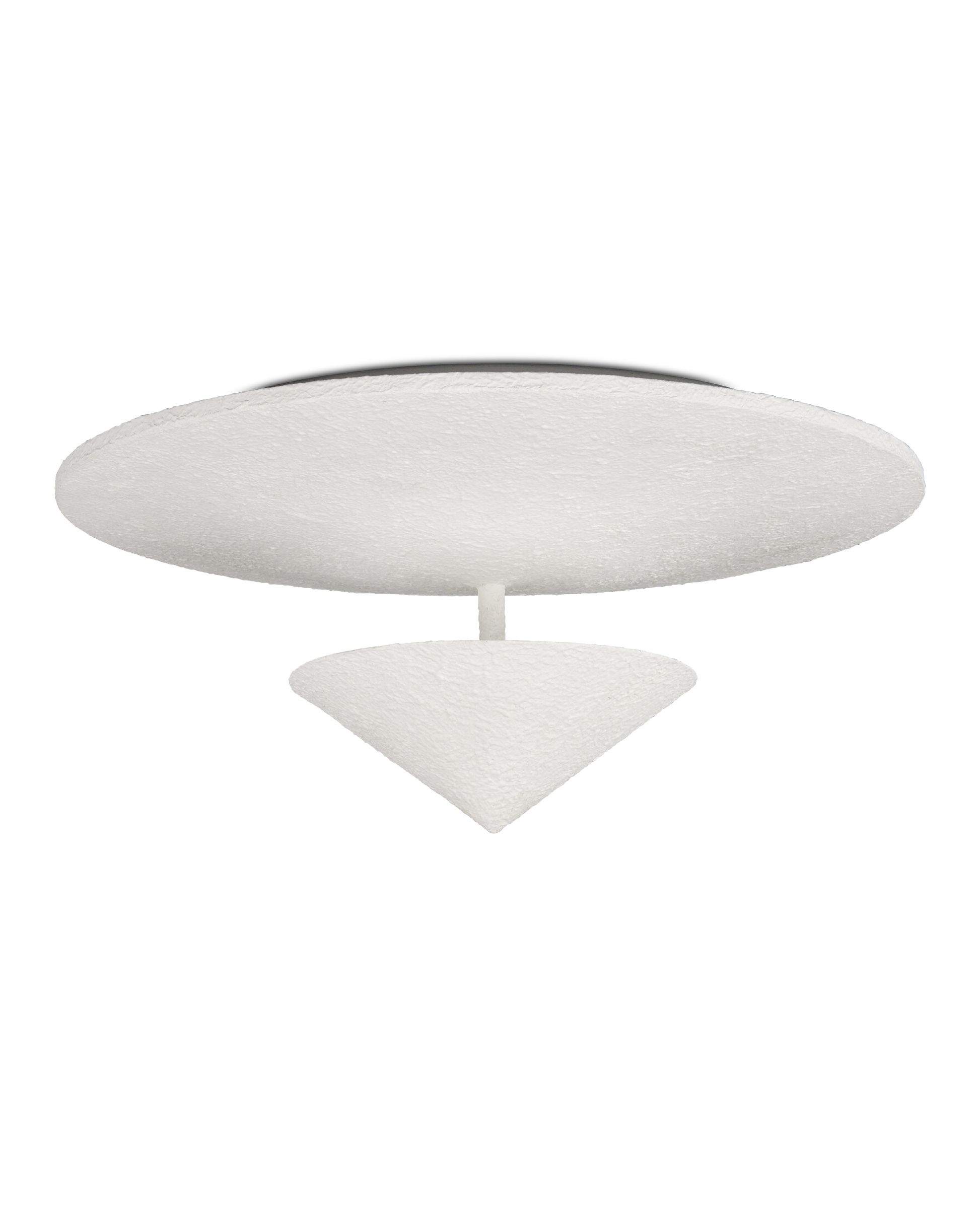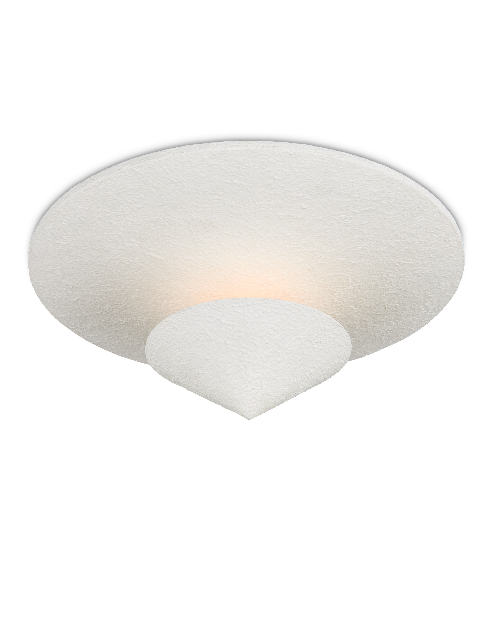 Playing with a geometrical shape that creates up-light, the Empyrean Flush Mount was designed with clean lines, making it as contemporary as designs come. The cone shape of the bottom feature is a design detail that brings added interest to the profile of this white flush mount. The wrought iron fixture is covered in a yeso blanco finish to add a subtle texture to the decidedly modern flush mount.
