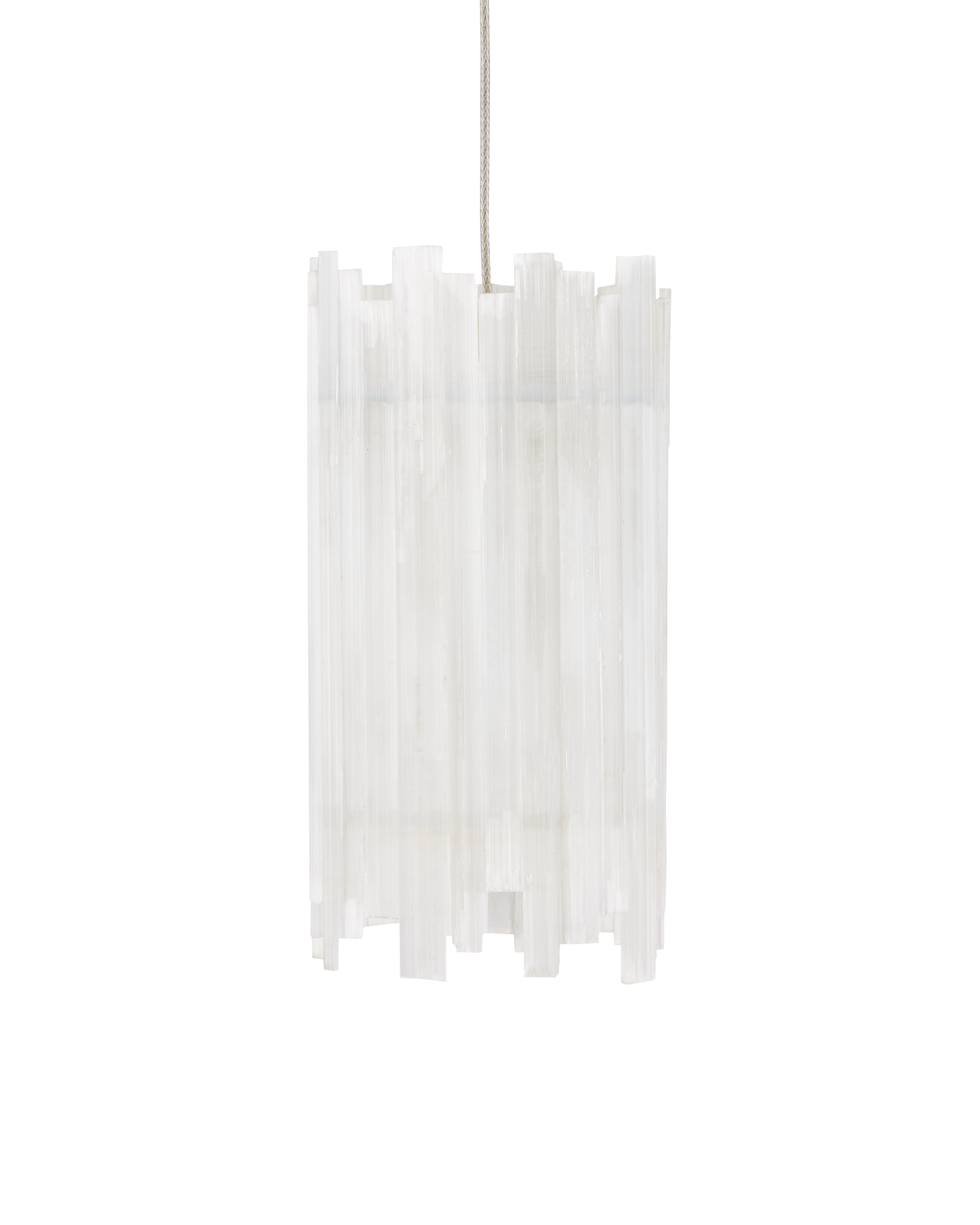 The Escenia 3-Light Multi-Drop Pendant has shades made of natural selenite. The ribs of the essential natural material are staggered top and bottom, which brings the shape of the shades added interest. When the lights are switched on, a beautiful glow is created by the crystal bars. The canopy of this piece is luminous in a painted silver finish. This fixture is among Currey & Company's multi-drop pendant collection, which includes multiple configurations.