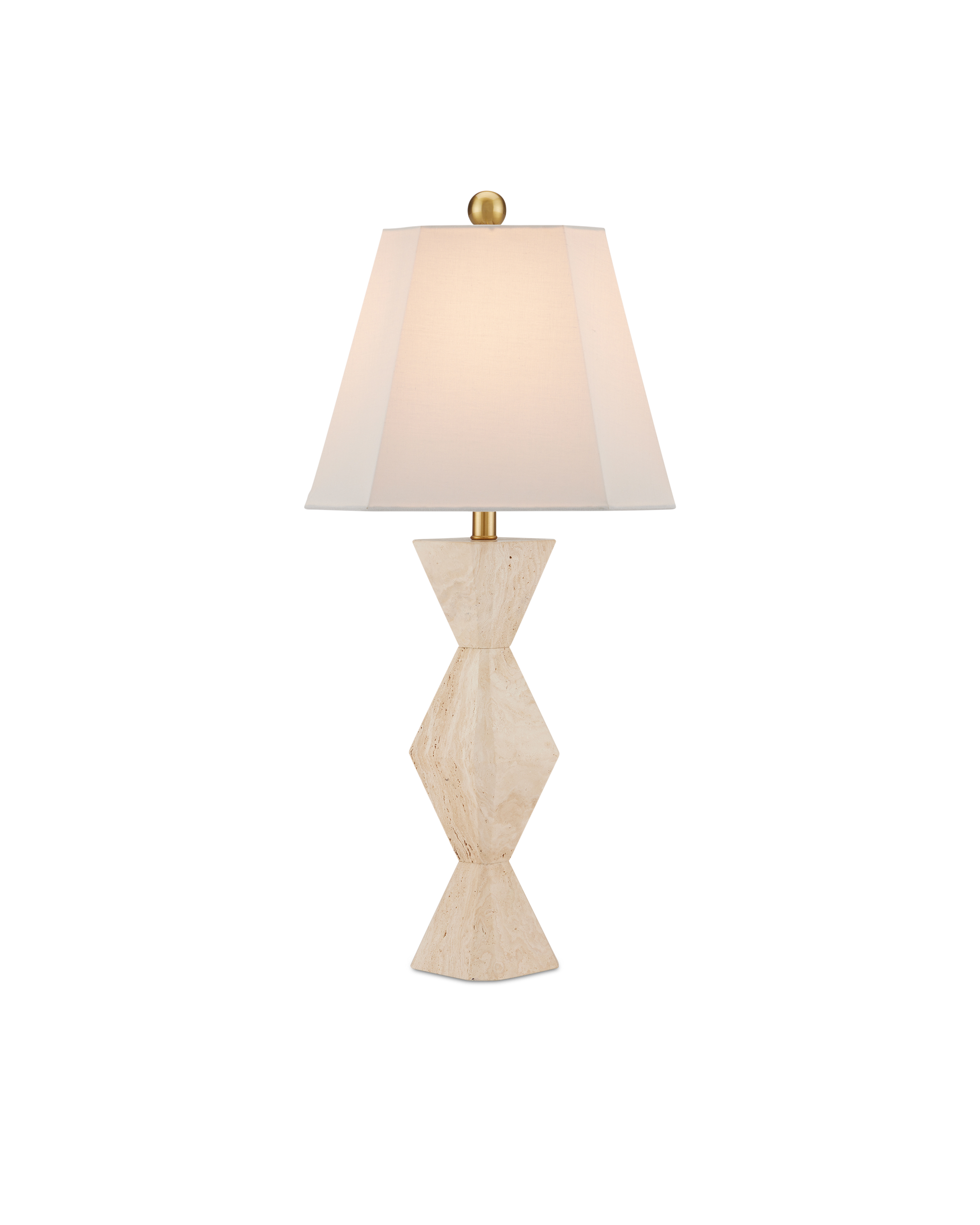 The Estelle Table Lamp has pyramid-shaped segments made of natural travertine that form a fluted profile. Designed by Tom Caldwell, this lamp is a labor-intensive piece because the shape is hand-formed. The square-cut-corner empire shade made of bone-colored linen echoes the tones in the travertine body of the contemporary lamp. Because it is made of natural travertine, the tones and the pits in the stone will vary from lamp to lamp.