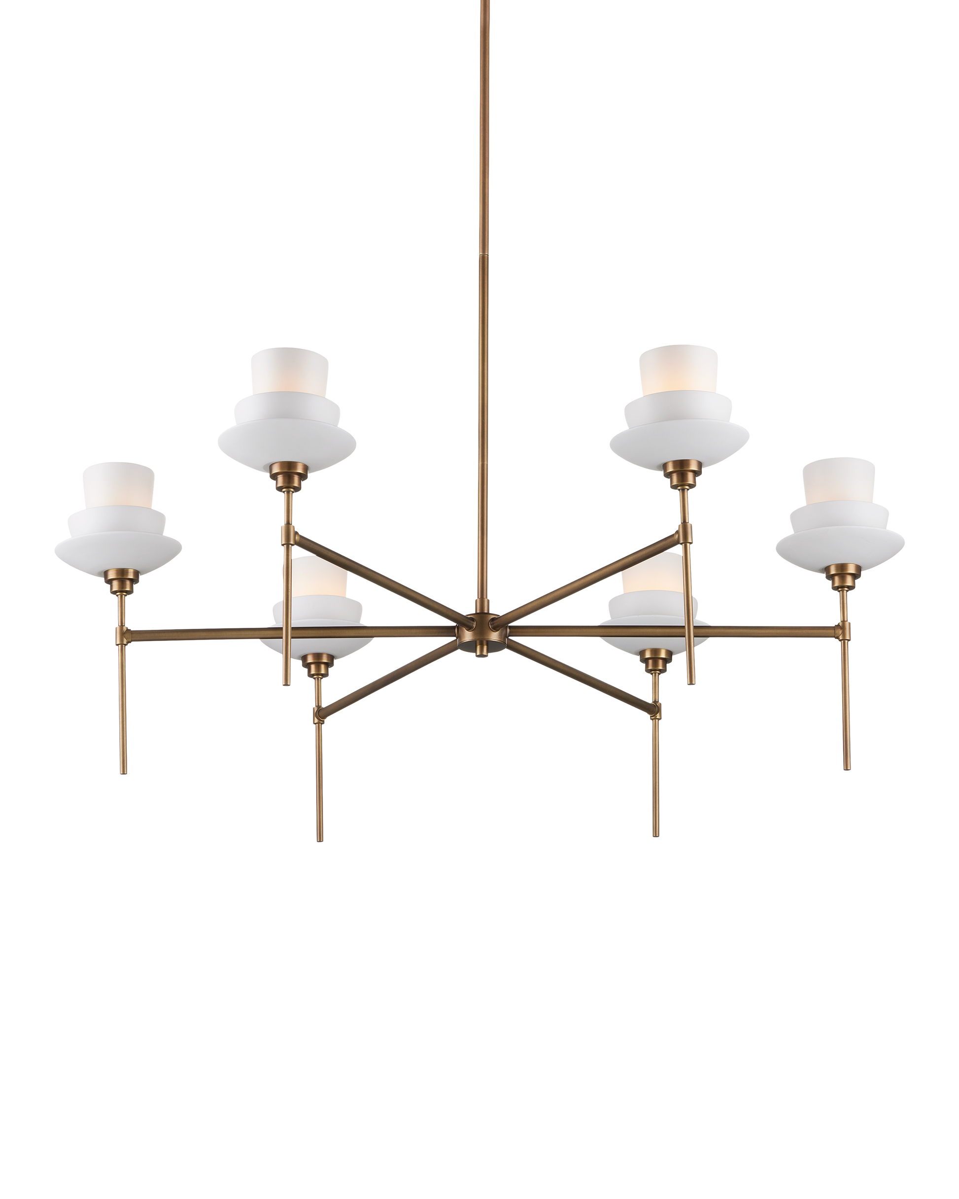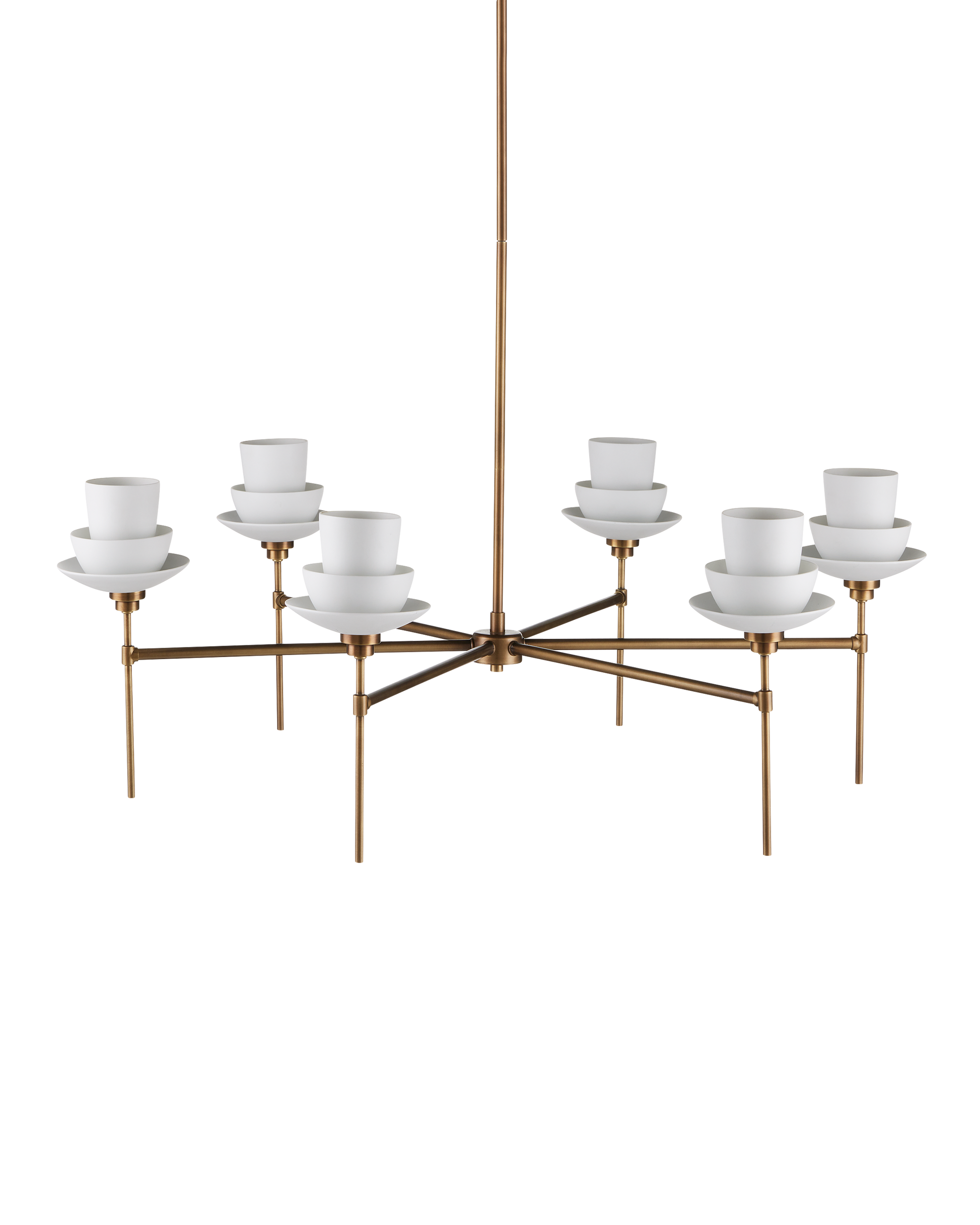 The Etiquette Chandelier is a mid-century-modern inspired chandelier made of metal in an antique brass finish. The telescoping stems hold semi-transparent bone china cups in graduating shapes that resemble tea cups. The luminous material softens the light that reflects from within. This gold chandelier was designed by Ian Thornton to be an uplight fixture with glowing shades. Adjustable from 24.5" to 66.5" with use of included chain/rod kit/cable. If your space calls for a longer drop, additional chain/rods/cable is available for purchase.