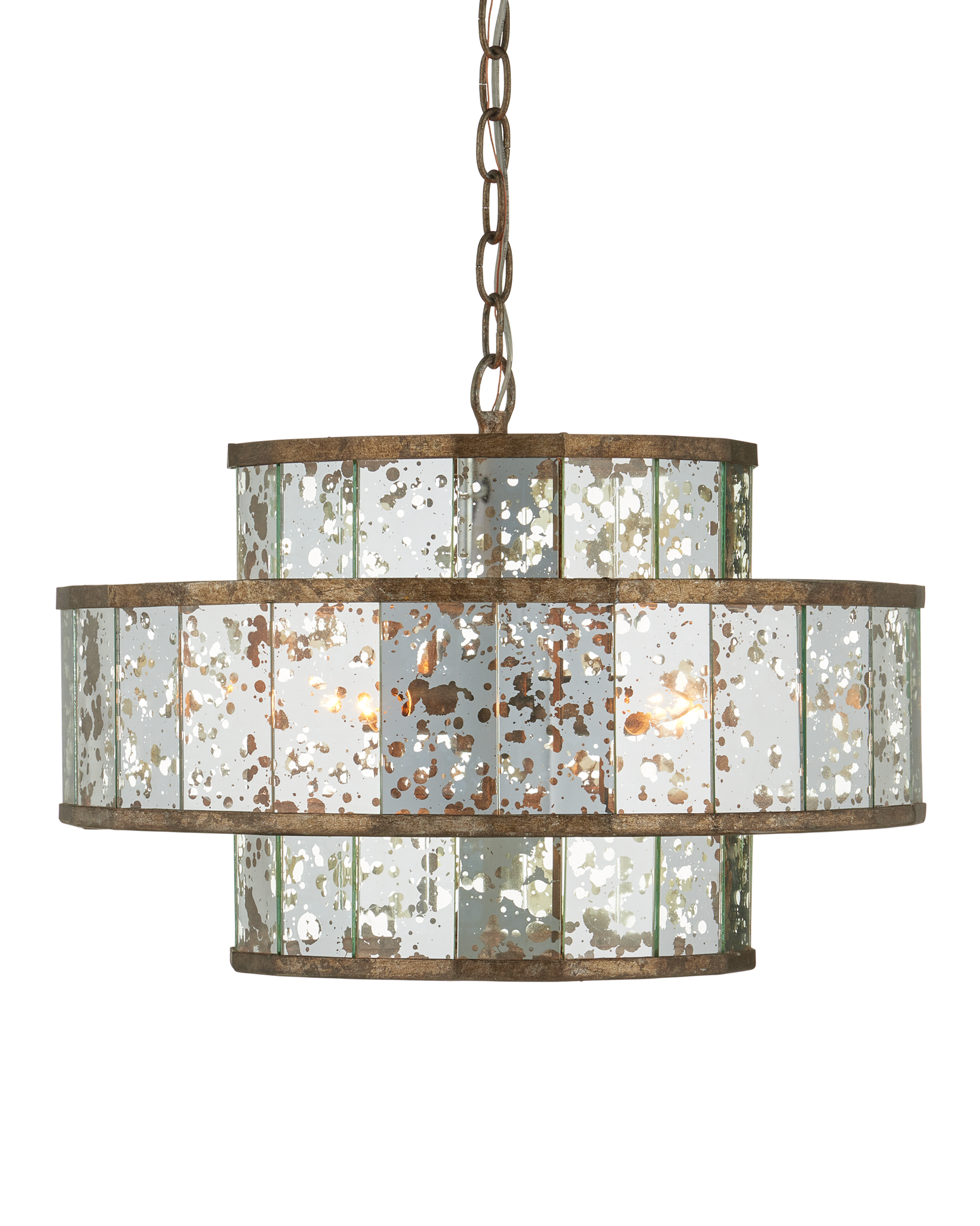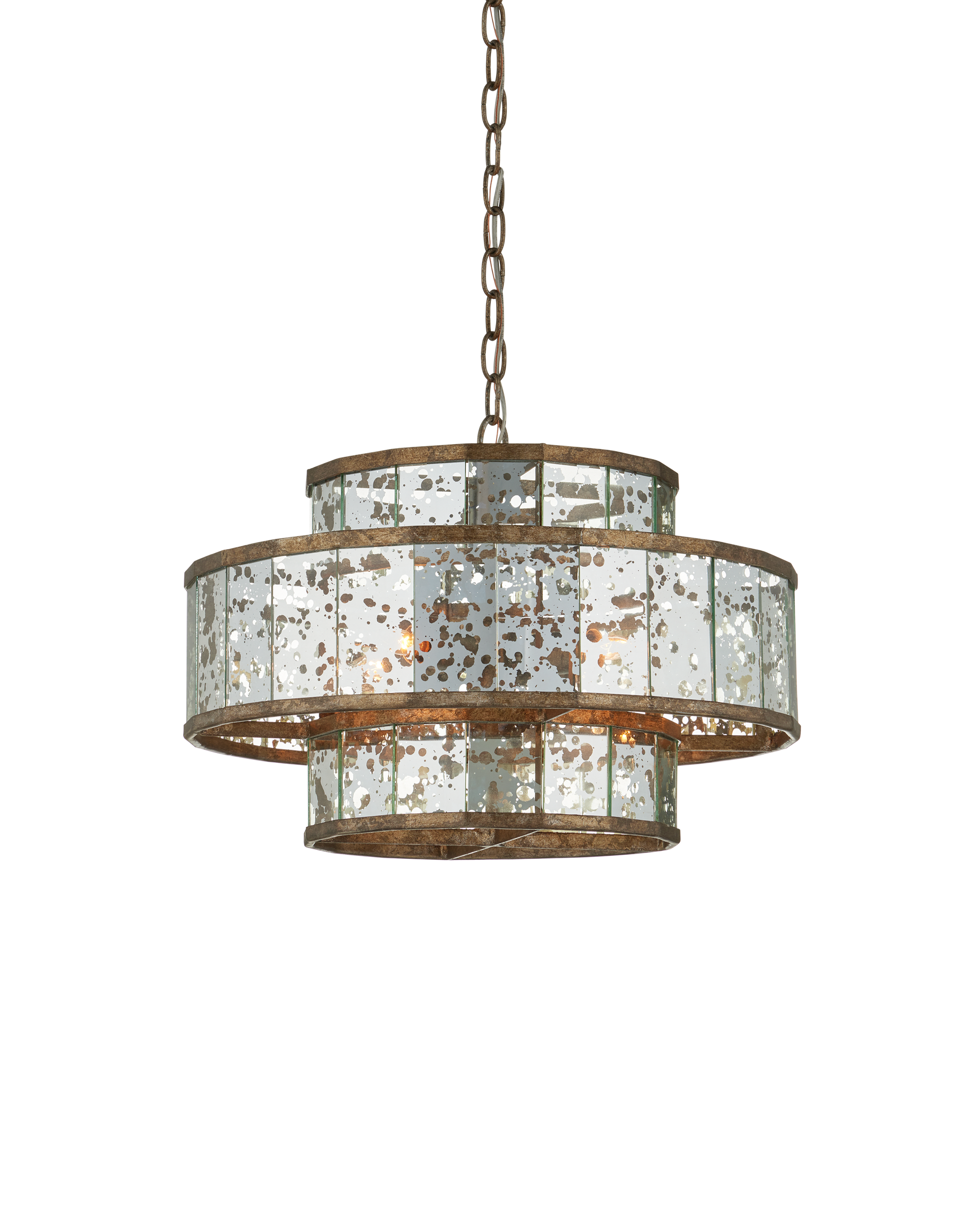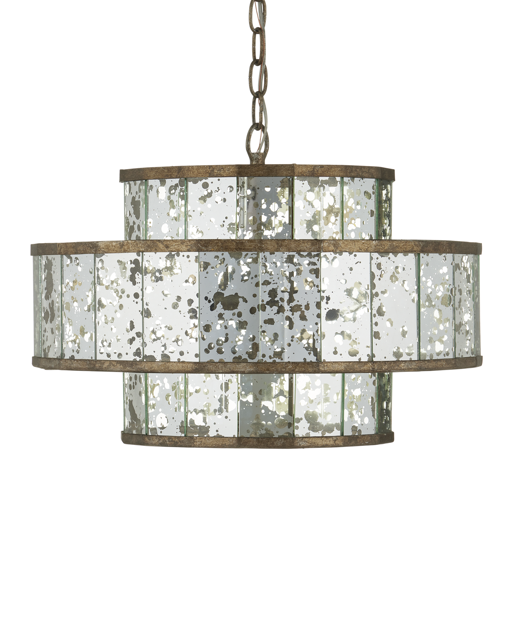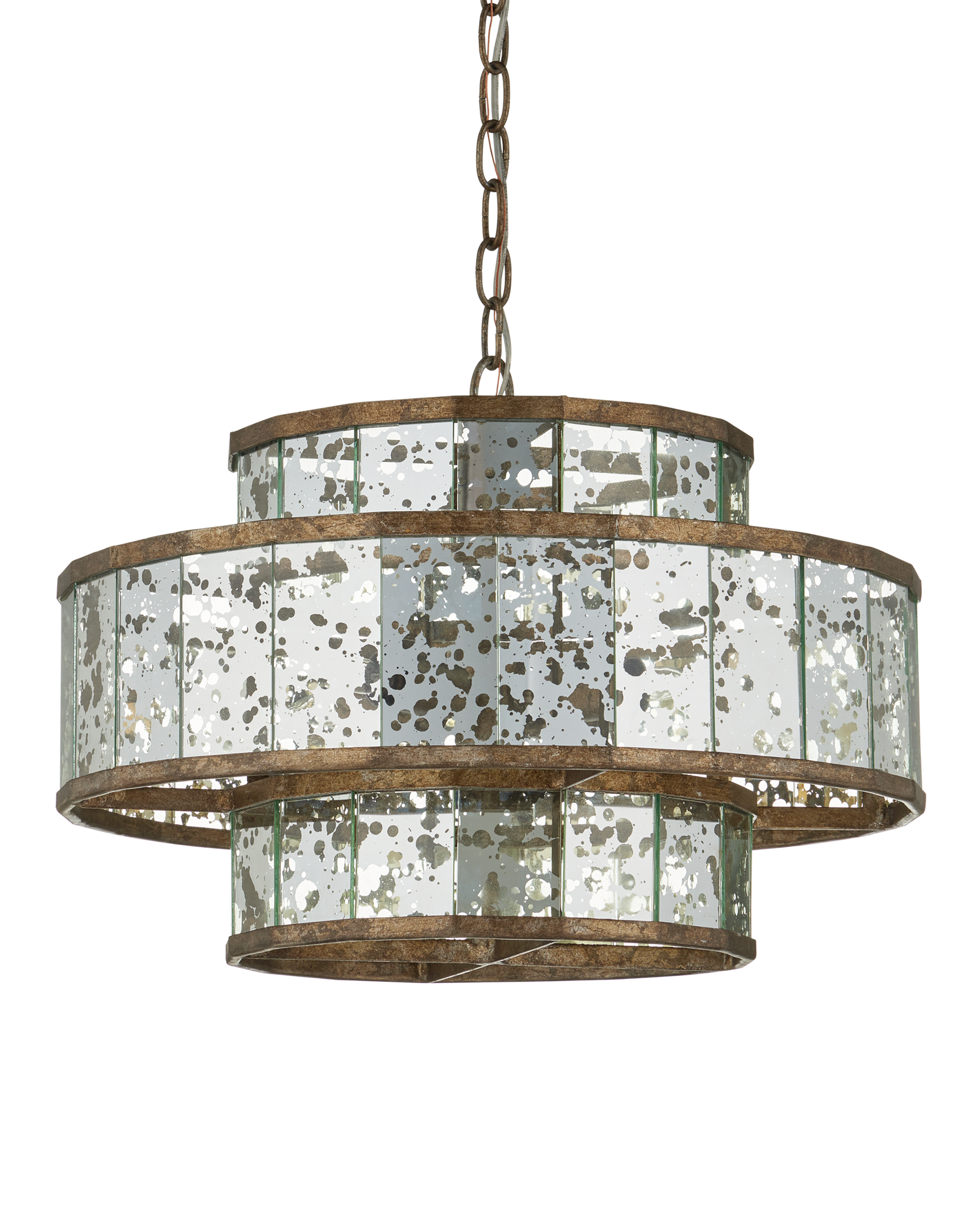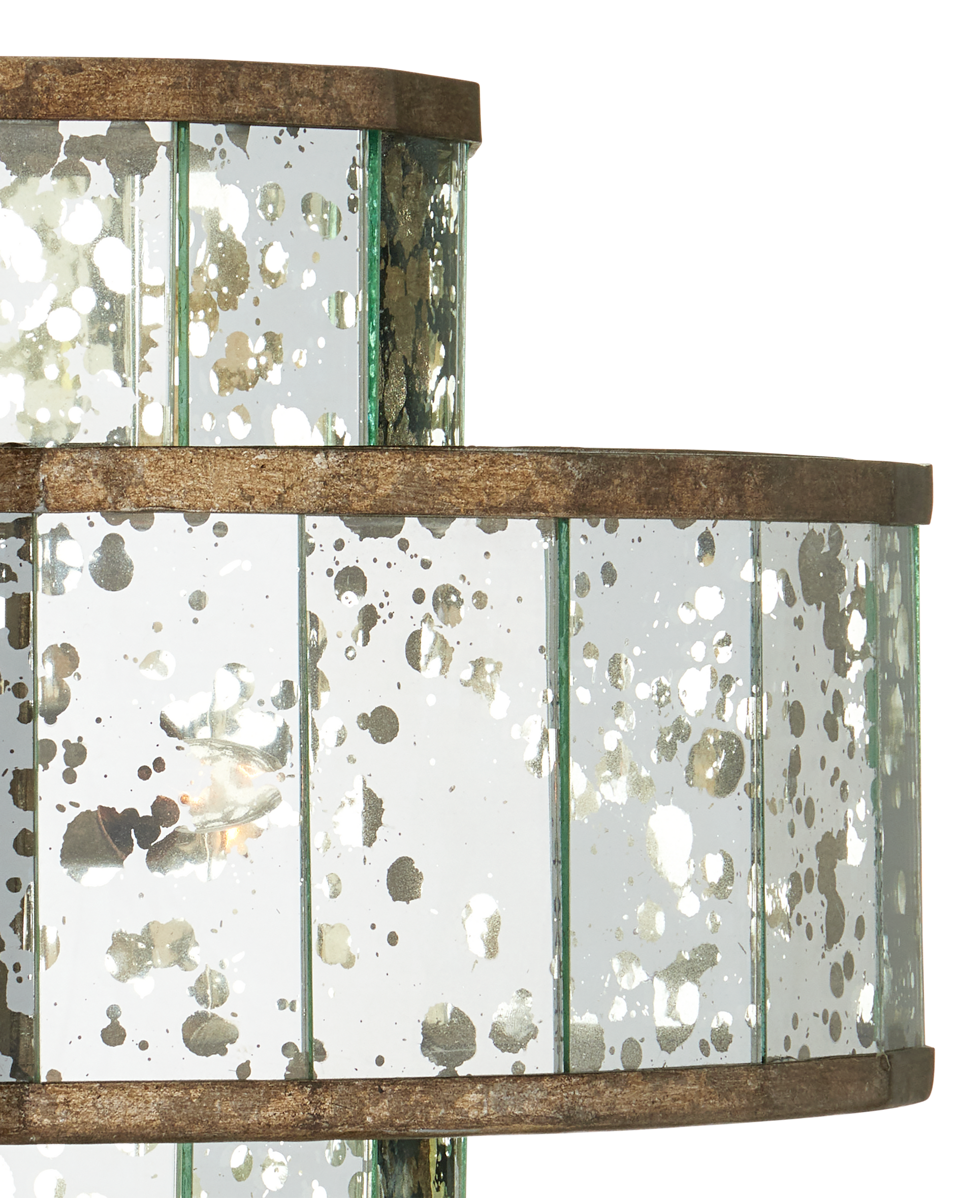 The Fantine Small Chandelier has shades made of Raj mirror that strikingly resemble mercury glass. The Pyrite bronze finish on the metal of this mirrored chandelier echoes the mottled tones in the glass to create synchronicity. The Fantine is also available in a large chandelier and a wall sconce.