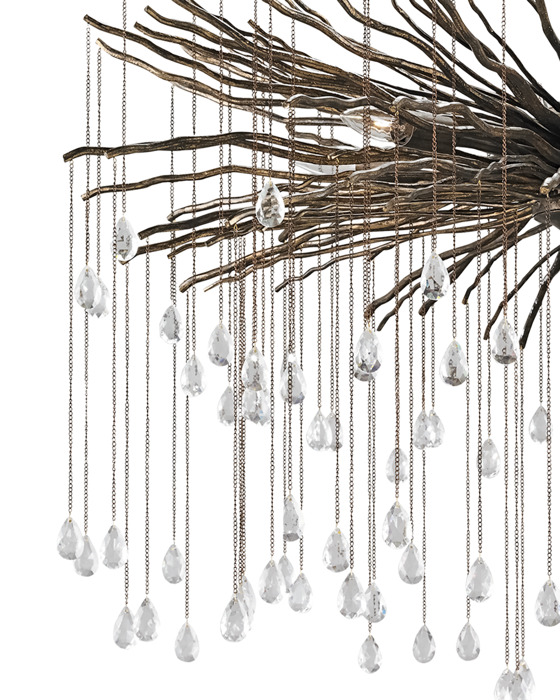 The Fen Large Chandelier is made of wrought iron limbs that stretch outward like gnarled branches. Each one supports a delicate chain adorned with a single crystal. The brutalist design of this bronze chandelier is heightened by the Cupertino finish.
