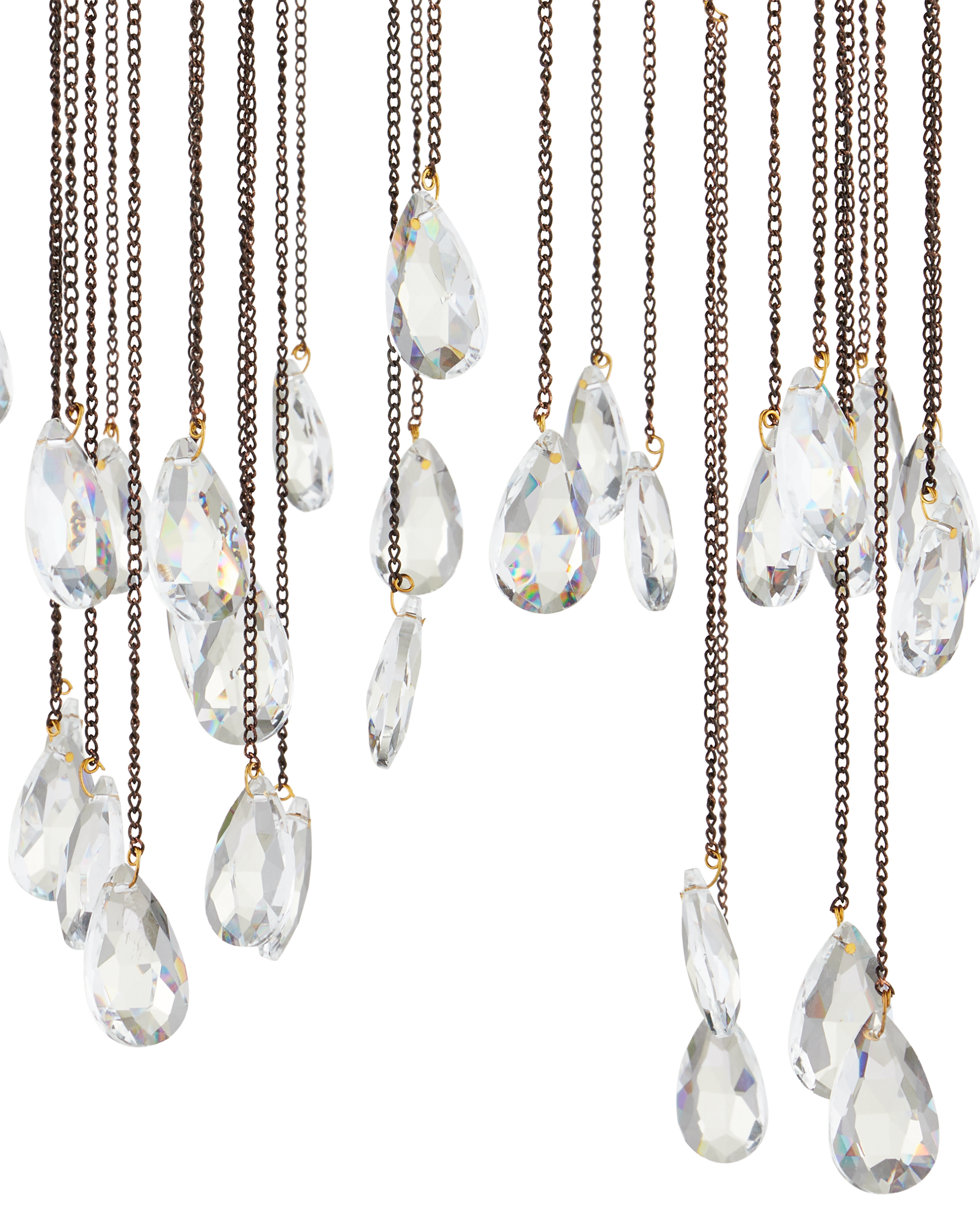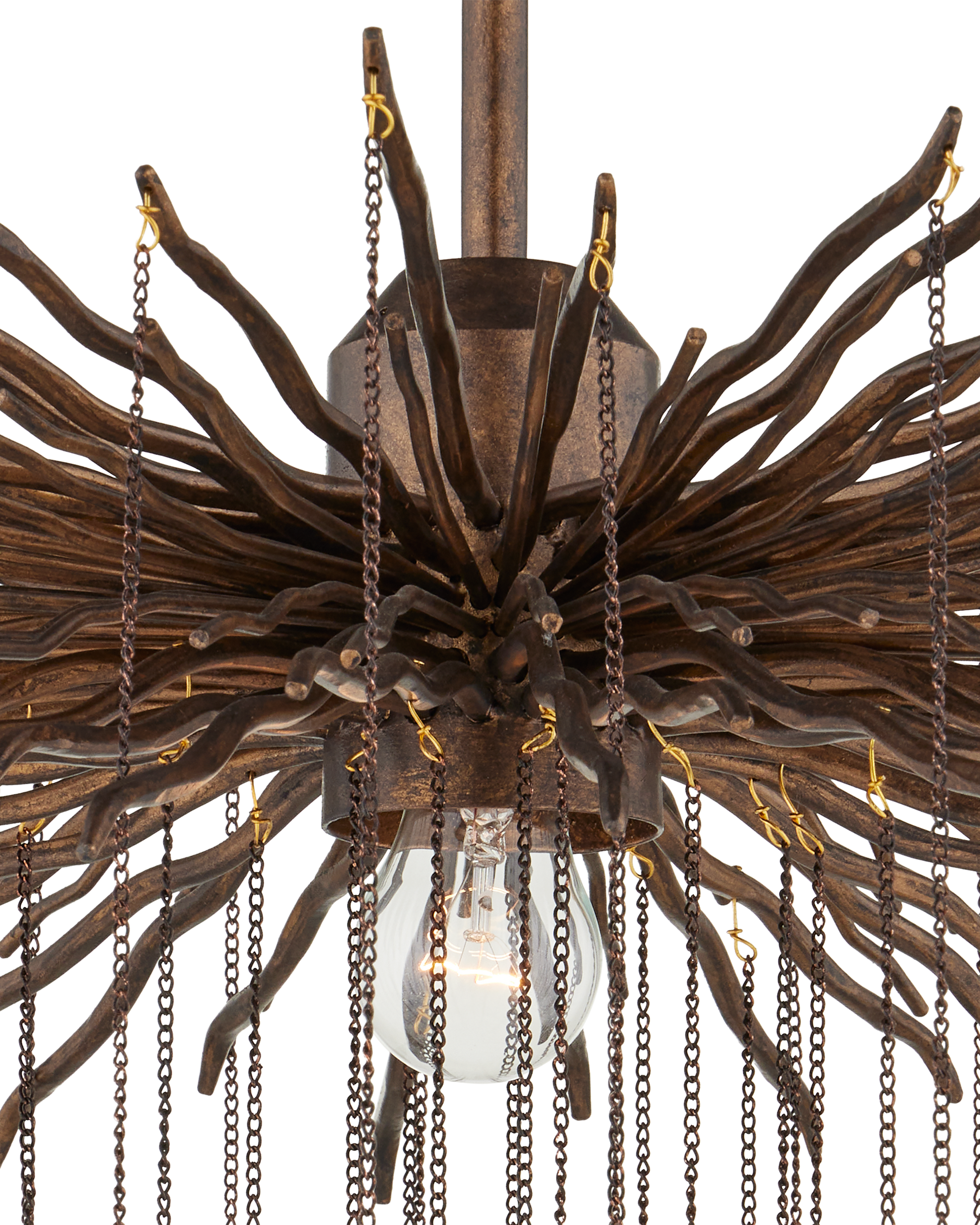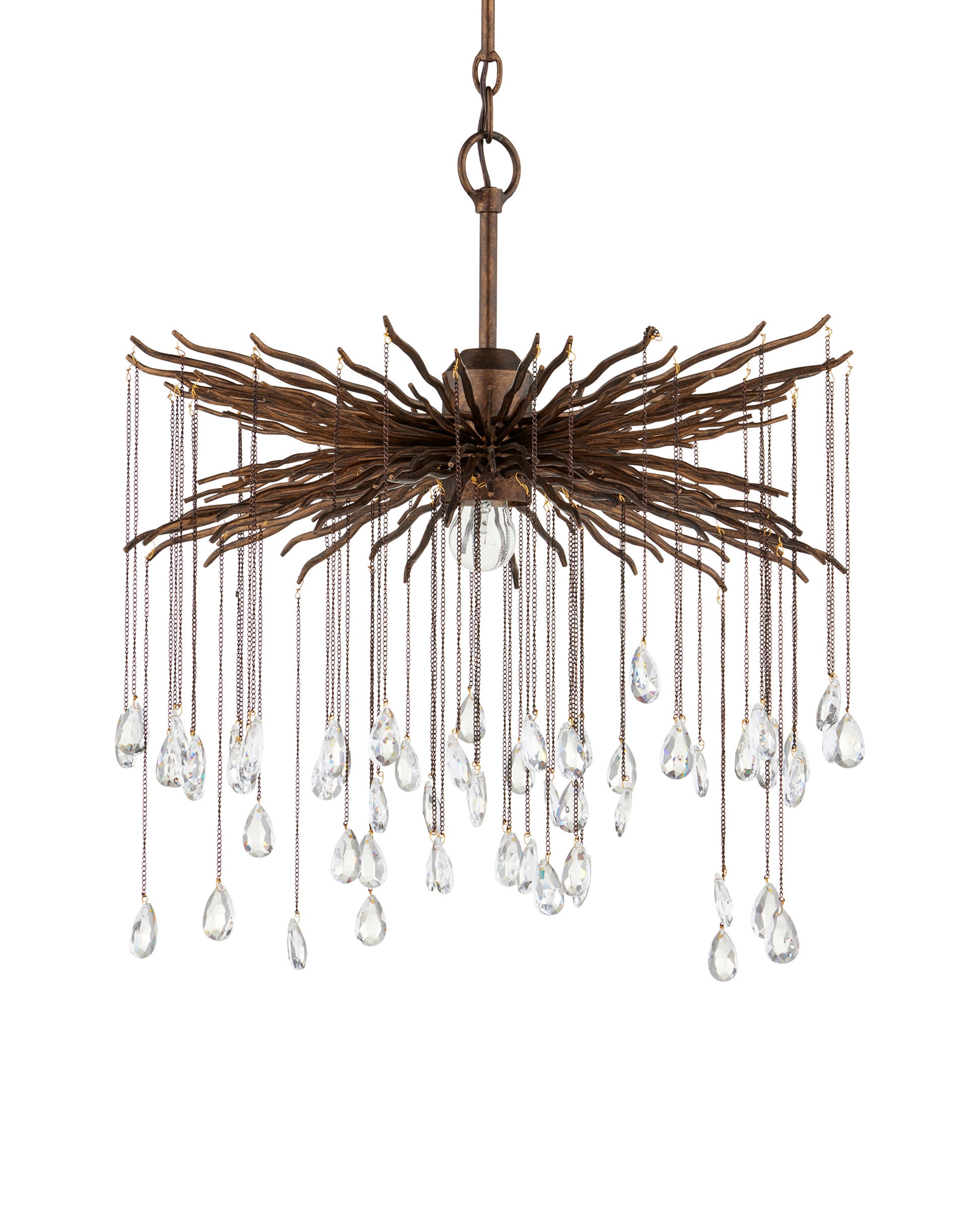 The Fen Small Chandelier is made of wrought iron limbs that stretch outward like gnarled branches. Each one supports a delicate chain adorned with a single crystal. The brutalist design of this bronze chandelier is heightened by the Cupertino finish.