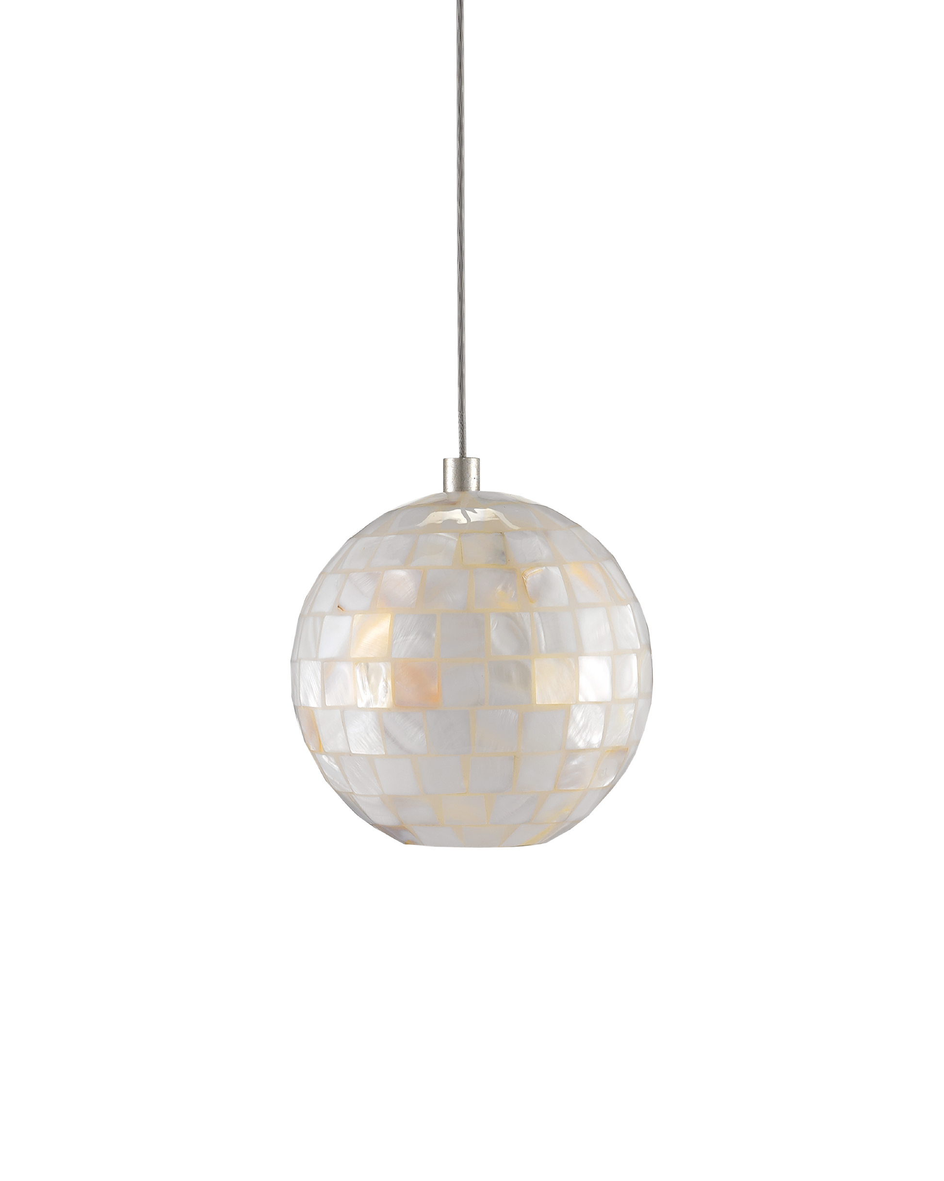 The Finhorn 1-Light Multi-Drop Pendant has an orb-shaped shade covered with small squares of mother of pearl, painstakingly hand-applied. The canopy of this piece is luminous in a painted silver finish. This fixture is among Currey & Company's multi-drop pendant collection, which includes multiple configurations.