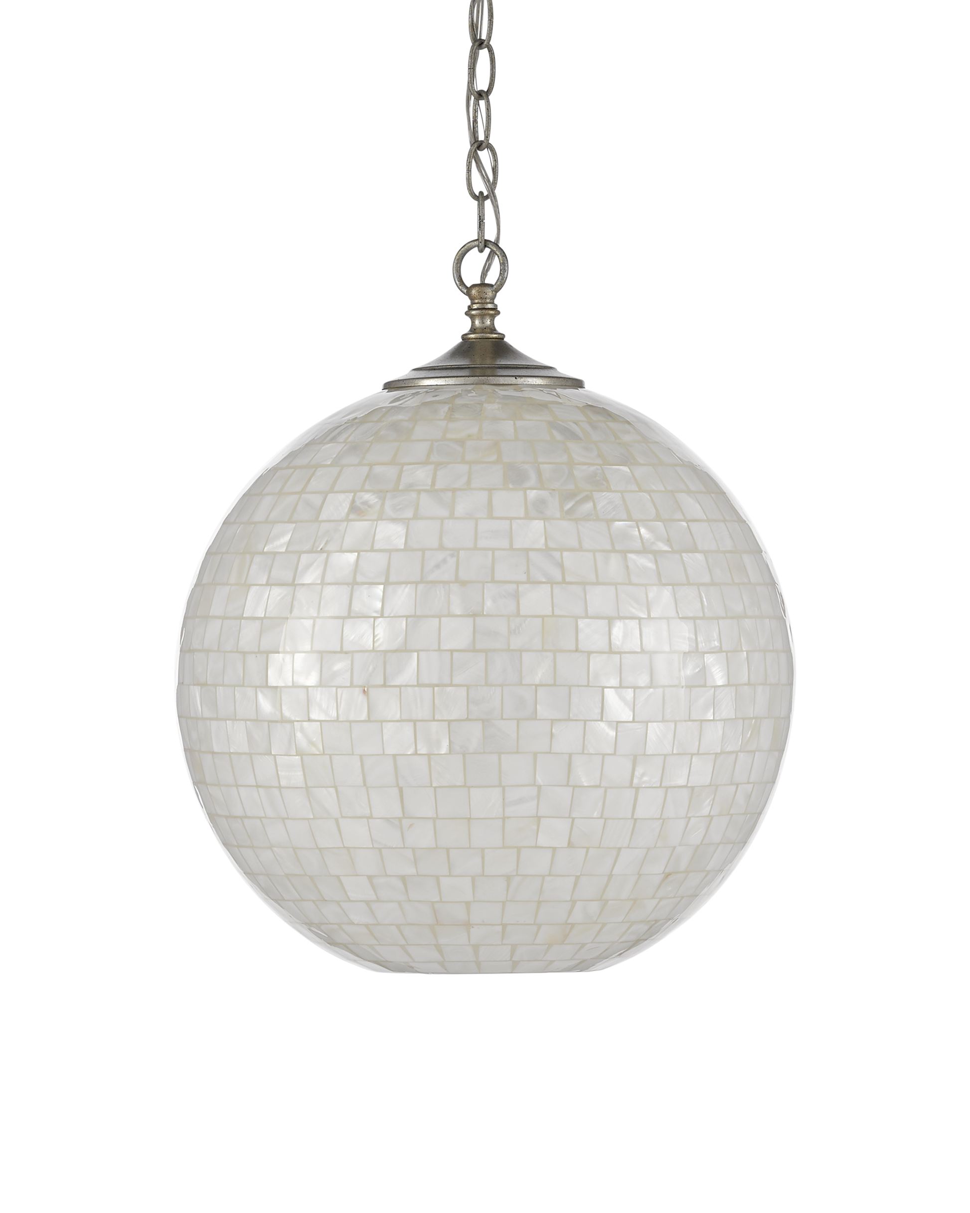 The Finhorn Pendant has an orb shape covered with small squares of mother of pearl. The metal affixing the globe pendant to the canopy, in an antique silver leaf finish, keeps this white pendant light. Adjustable from 21.75" to 90.5" with use of included chain/rod kit/cable. If your space calls for a longer drop, additional chain/rods/cable is available for purchase.