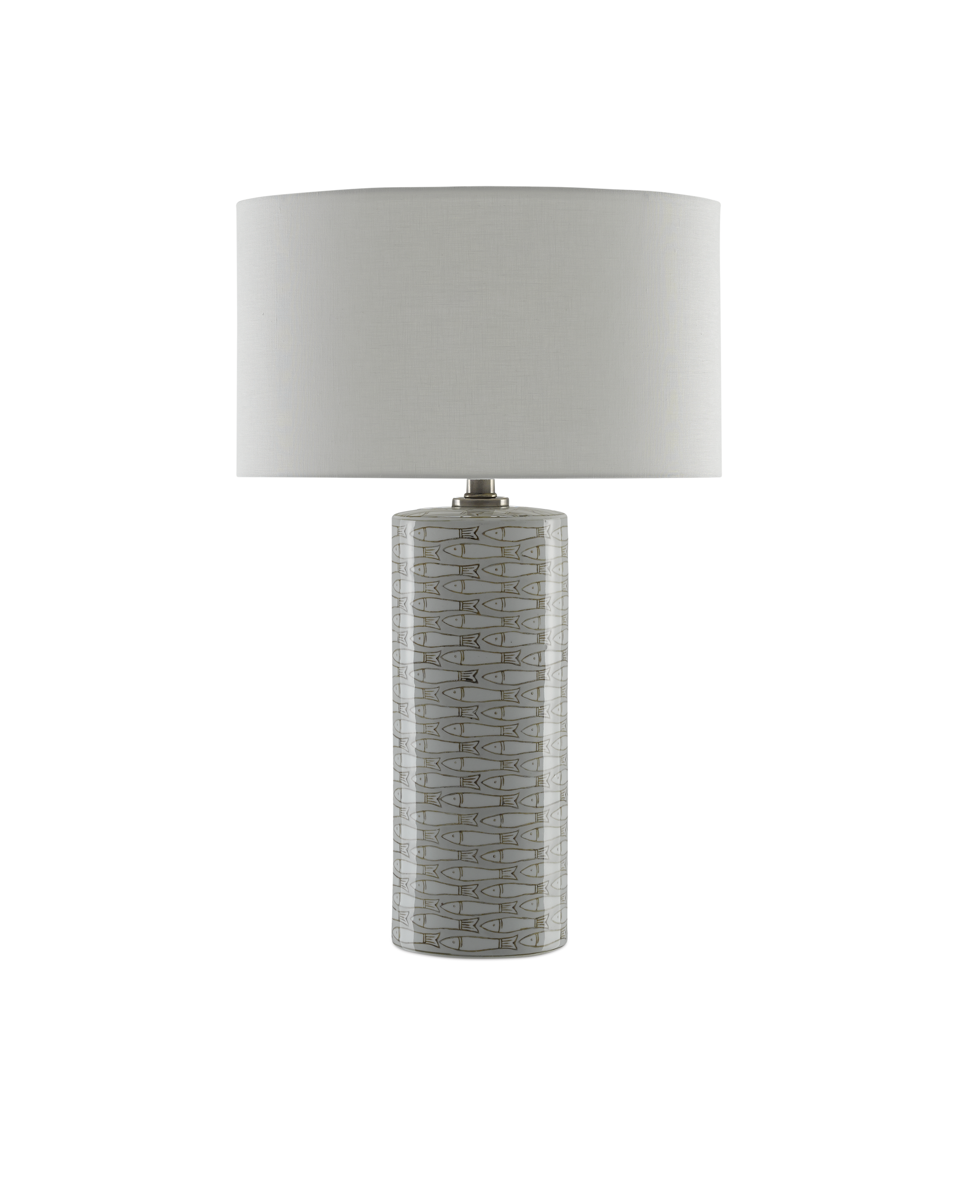 The Fisch Large Table Lamp has a fish pattern on the clean-lined porcelain column in gray and white. The antique nickel finish on the hardware echoes the tones in the glazing. We've topped the gray lamp with an off-white linen shade.