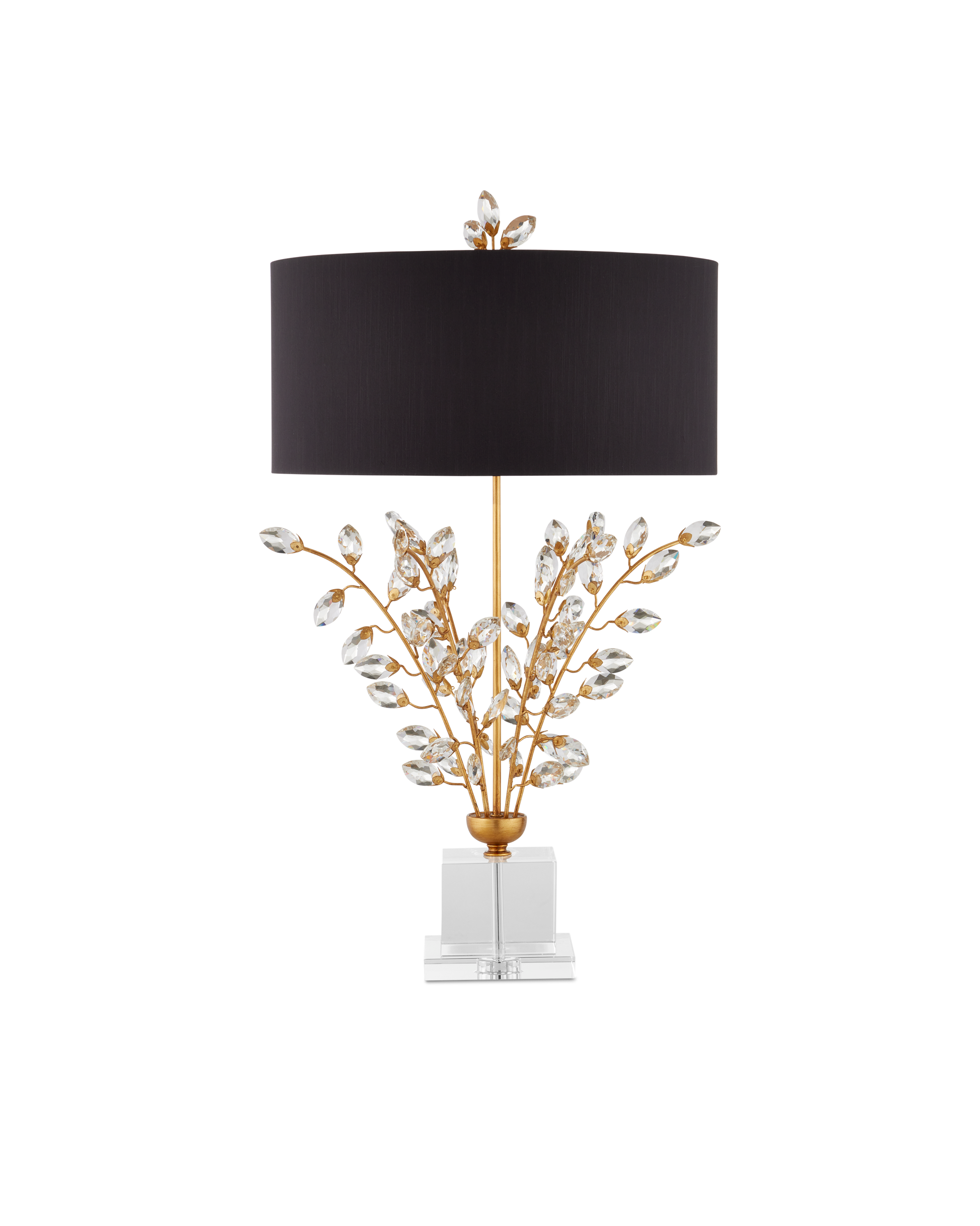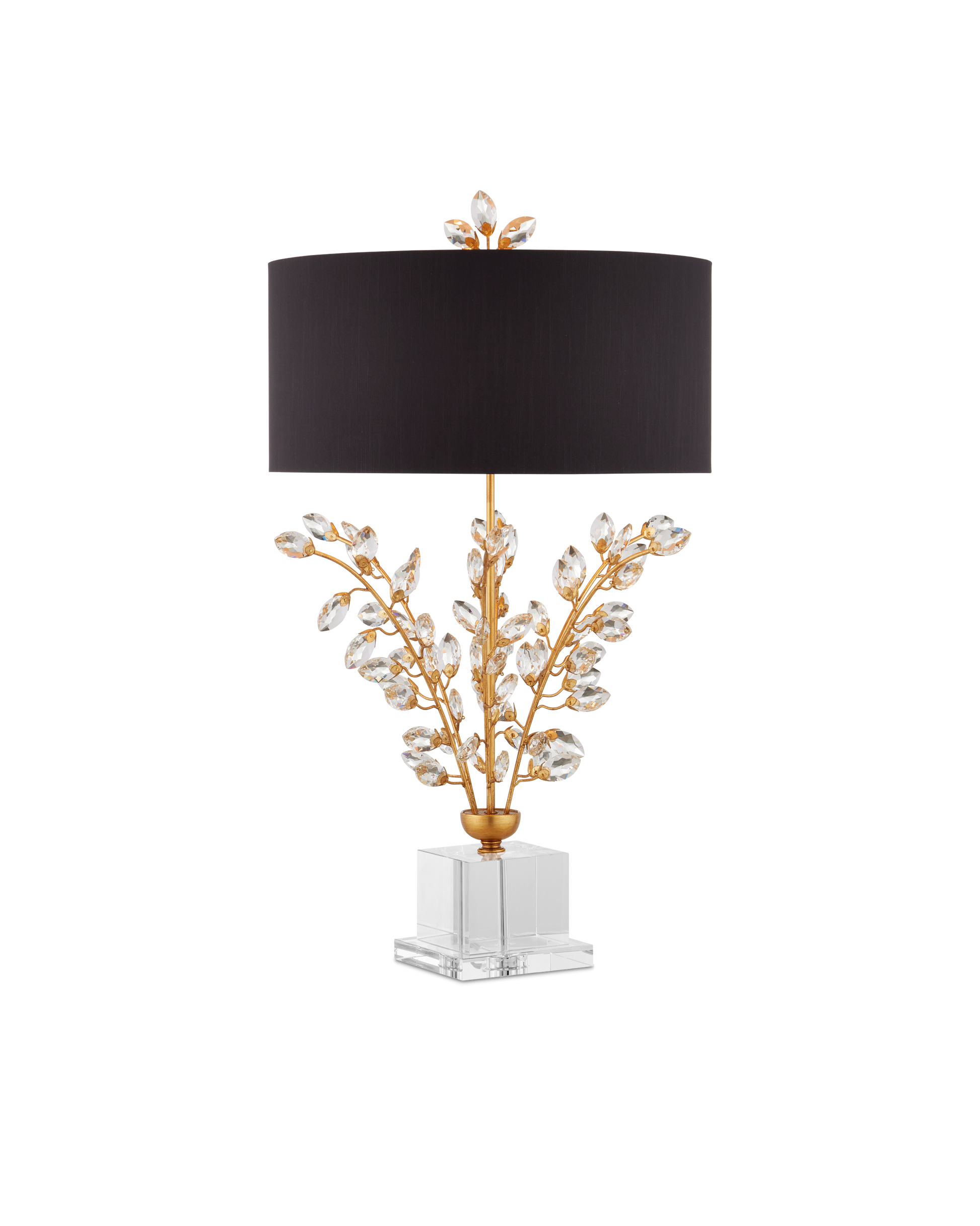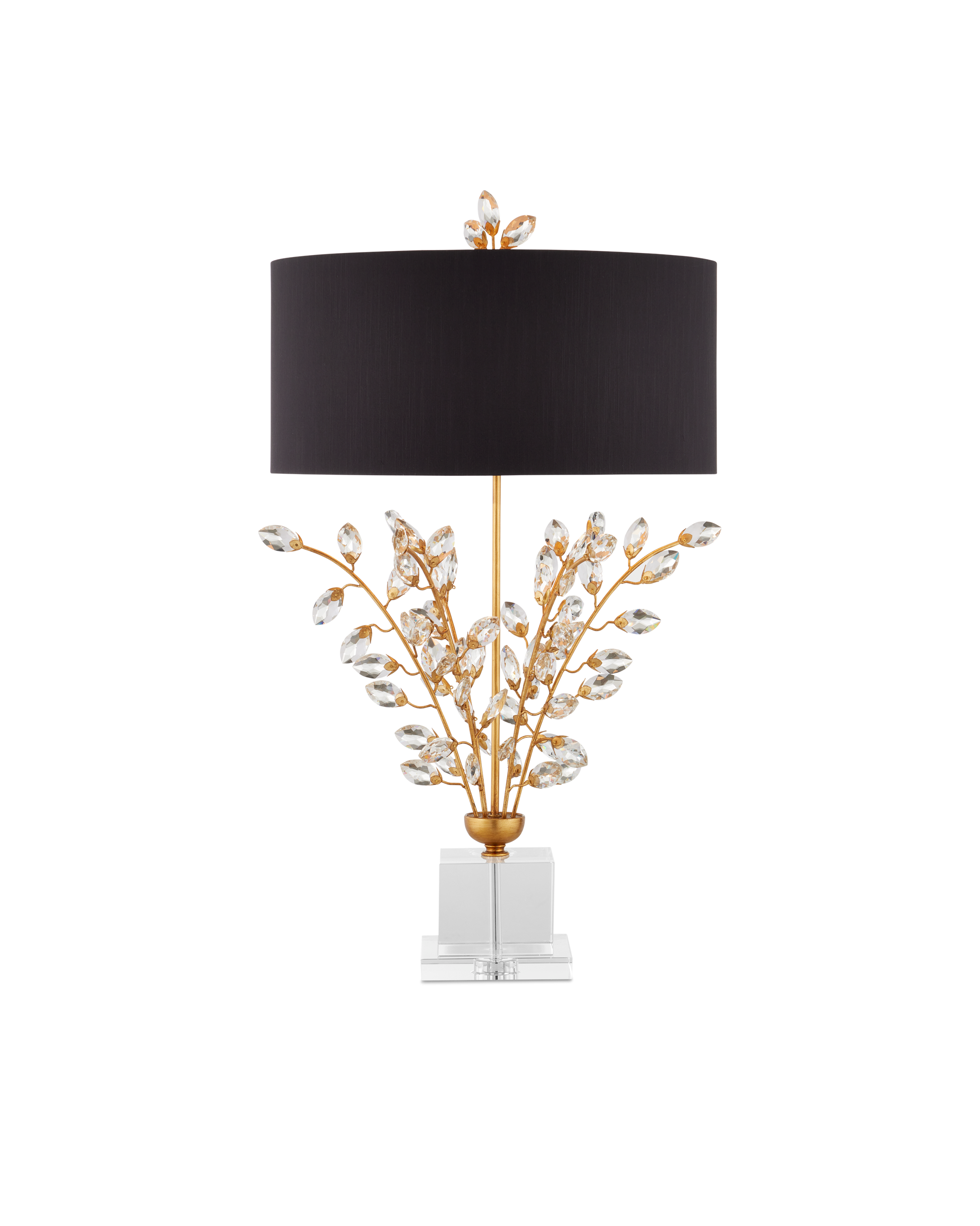 Our Forget-Me-Not Table Lamp has stems of metal in a rich Chinois gold leaf finish that hold luxuriant beveled optic crystal buds. Other notable details on this crystal lamp include a crystal finial and stacked base, and a black shantung drum shade in perfect proportion to the spray of crystals. This lamp, along with the Forget-Me-Not Table Lamp in a silver leaf finish and white shade, was designed by Tom Caldwell.