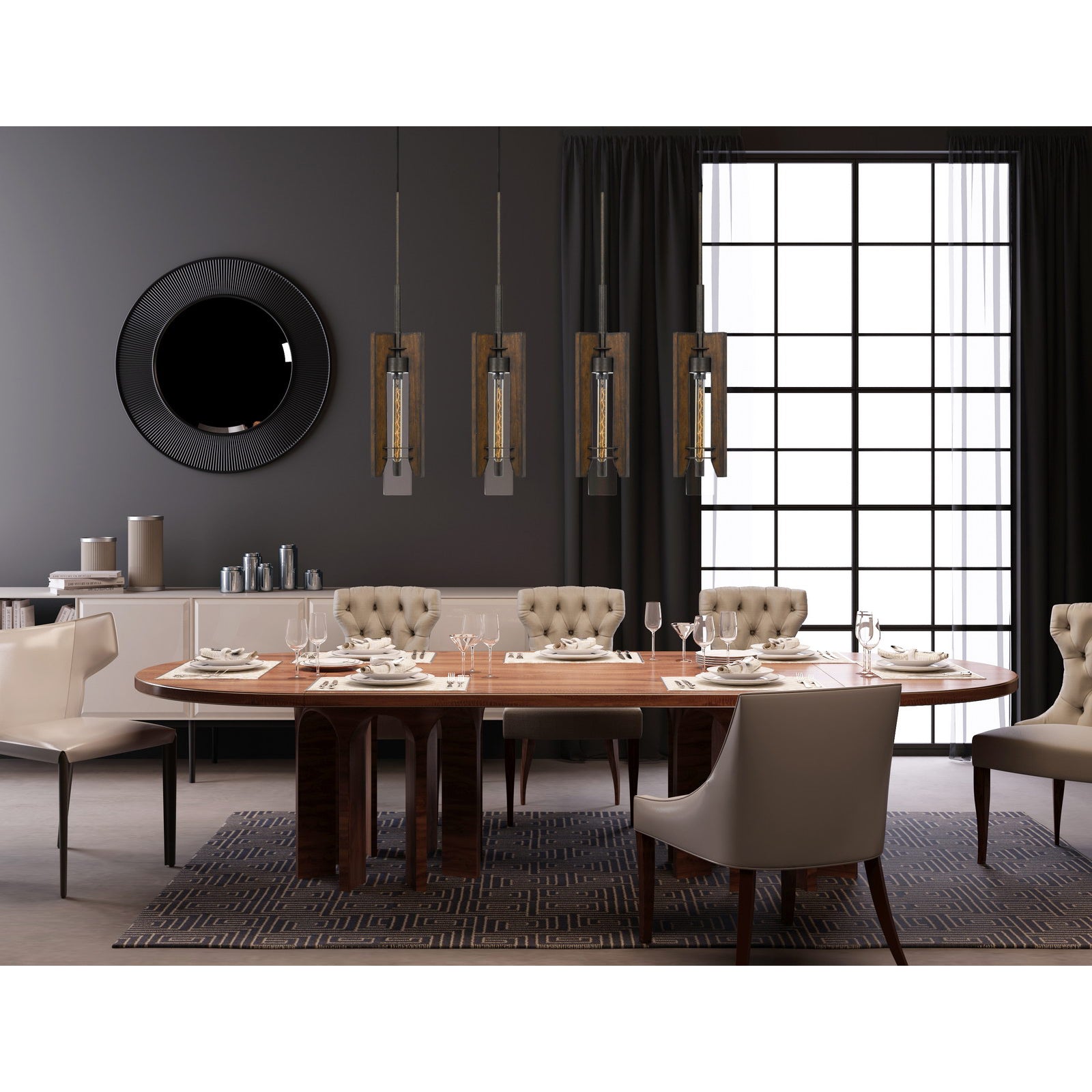 Our Rosemary Collection features a variety, from the single light pendant here all the way up to our Rosemary 5 light pendant. The uniform design of the 4 light pendant makes it perfect for a kitchen island! The dark finish on the wood matches perfectly with the metal and contrasts nicely with the clear glass cover.