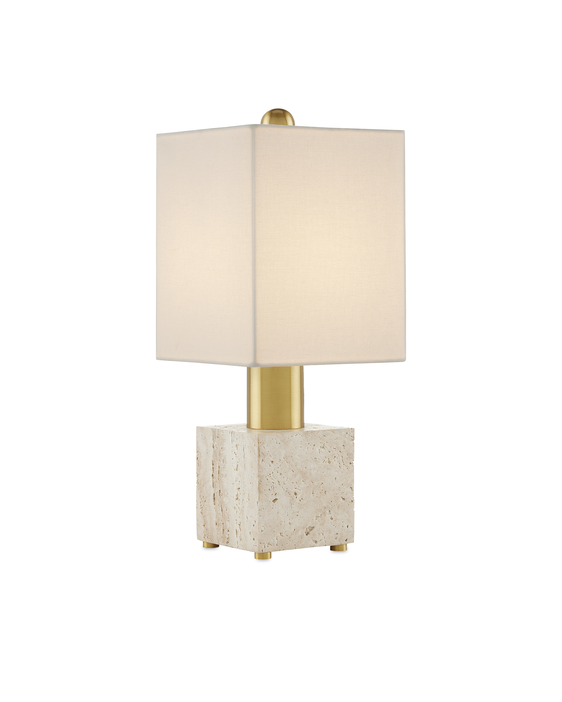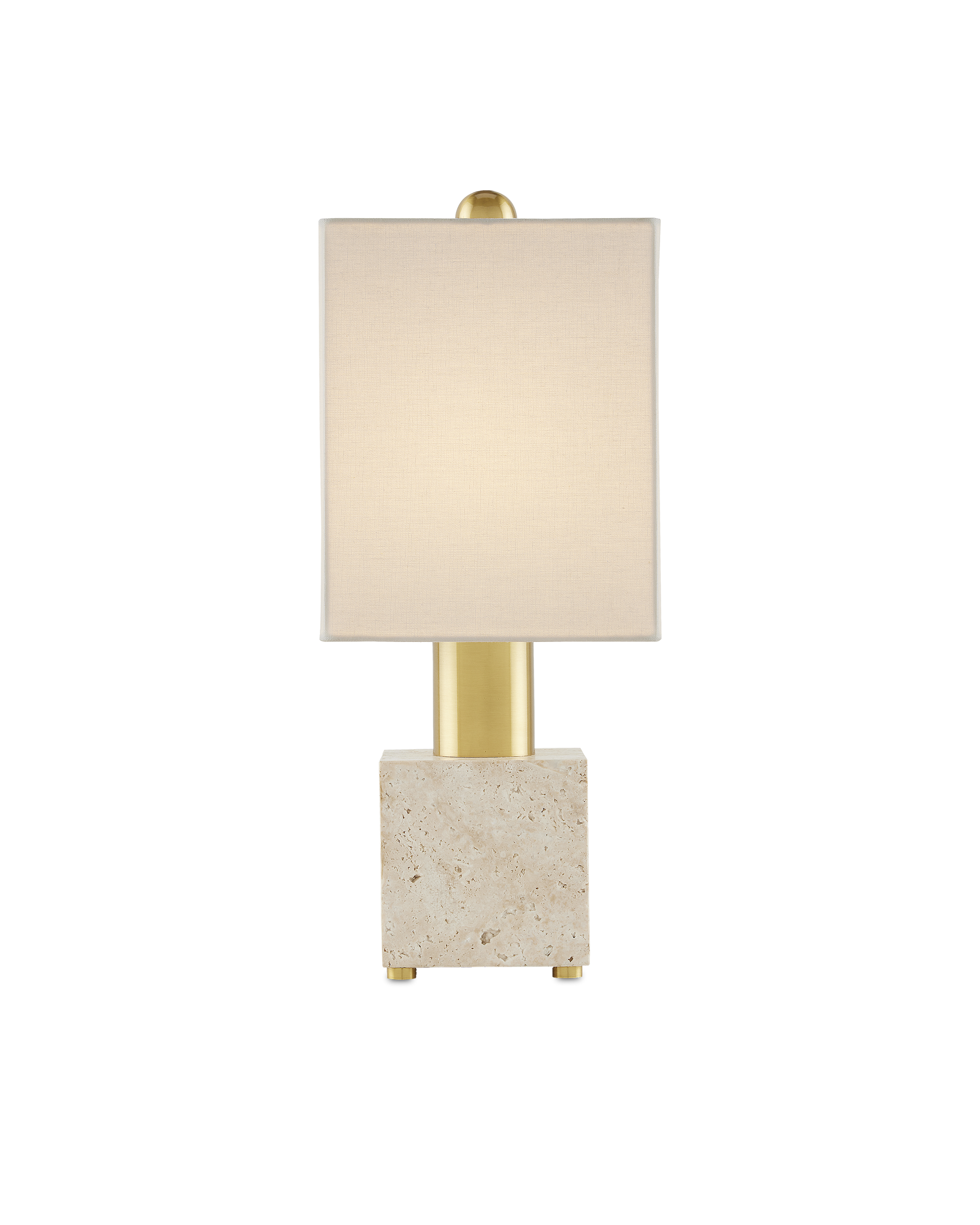 Tom Caldwell had a 1920s Contemporary design aesthetic in mind when he created the Gentini Table Lamp. The geometric shape is made from a mix of textural travertine and smooth steel in an antique brass finish. The personality of the surface of the travertine stems from the fact that it is porous and has a variety of nooks and crannies in its pitting. Inherent variations in the stone's texture, veining, and color - from pale ivory to a warm tan - are to be expected and celebrated. Each surface is unique so no two are exactly alike. The shape of the bone linen shade perfectly echoes the scale of this table lamp.