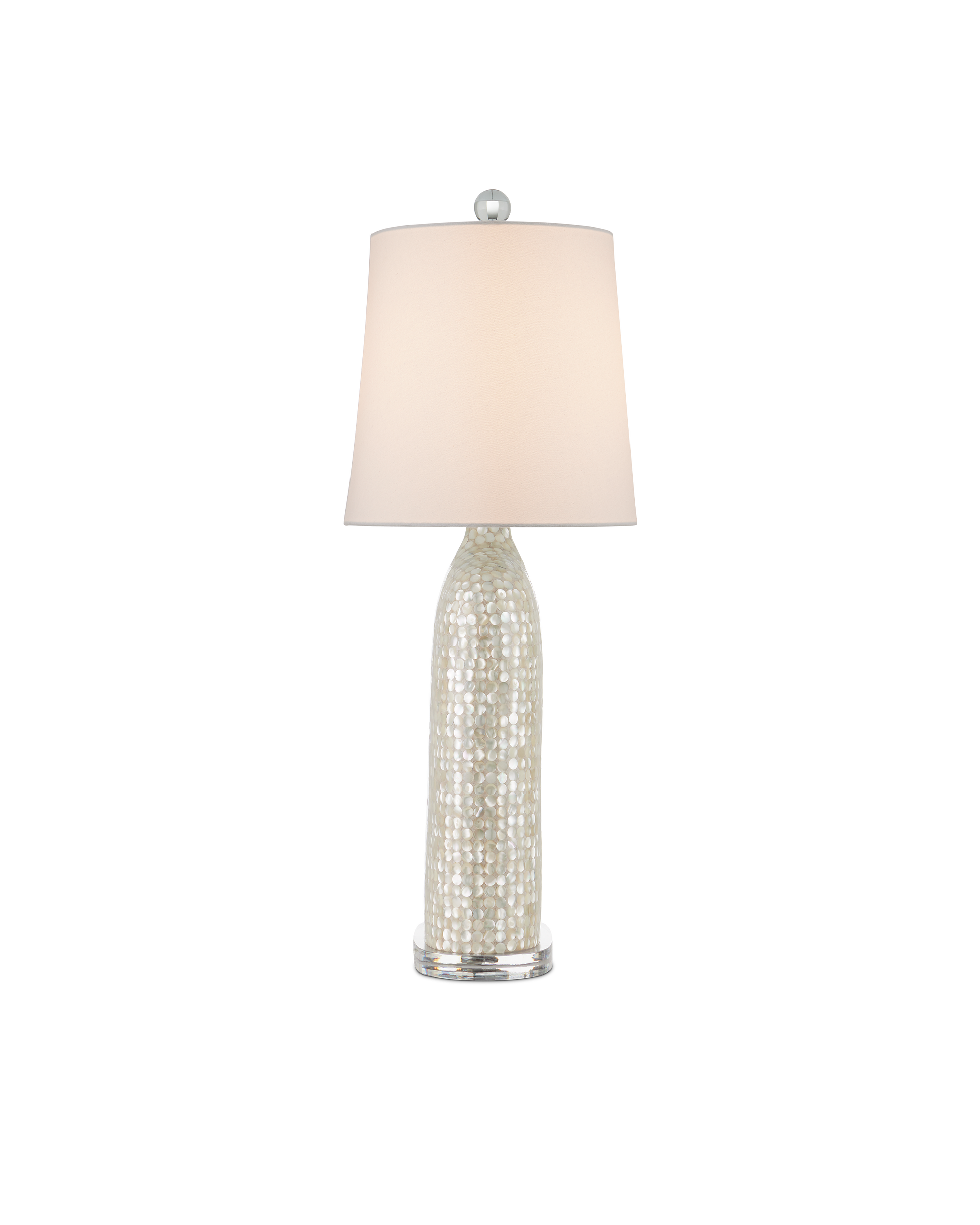 A shimmering composition, the Gerri Dot Table Lamp has a body covered in tiny circlets of mother of pearl. The bottle shape with its curving shoulders is surprisingly thin, as is the oblong shade. The slimness makes this white lamp a terrific choice for tabletops or chests where space is limited because it will sit close to the wall. Adding to the luminosity of the creation are the acrylic base and finial.