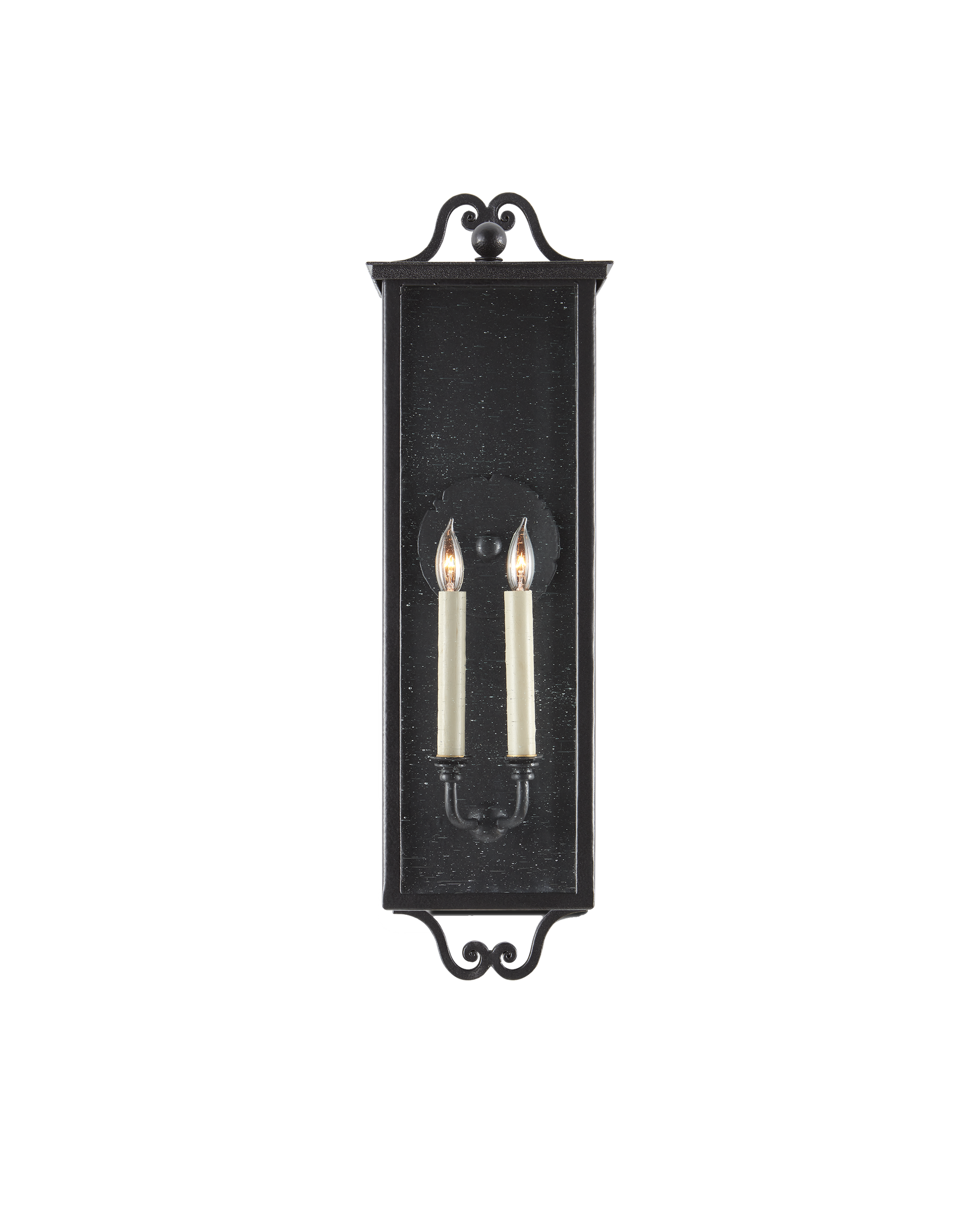 The Giatti Medium Outdoor Wall Sconce in our Twelfth Street collection of outdoor lighting features a high-performance, weather-resistant Trilux finish that is fade resistant, crack resistant and rust resistant. We guarantee the finishes applied to our Twelfth Street pieces for five years. The metal on this black sconce in a midnight finish surrounds seeded-glass panes.