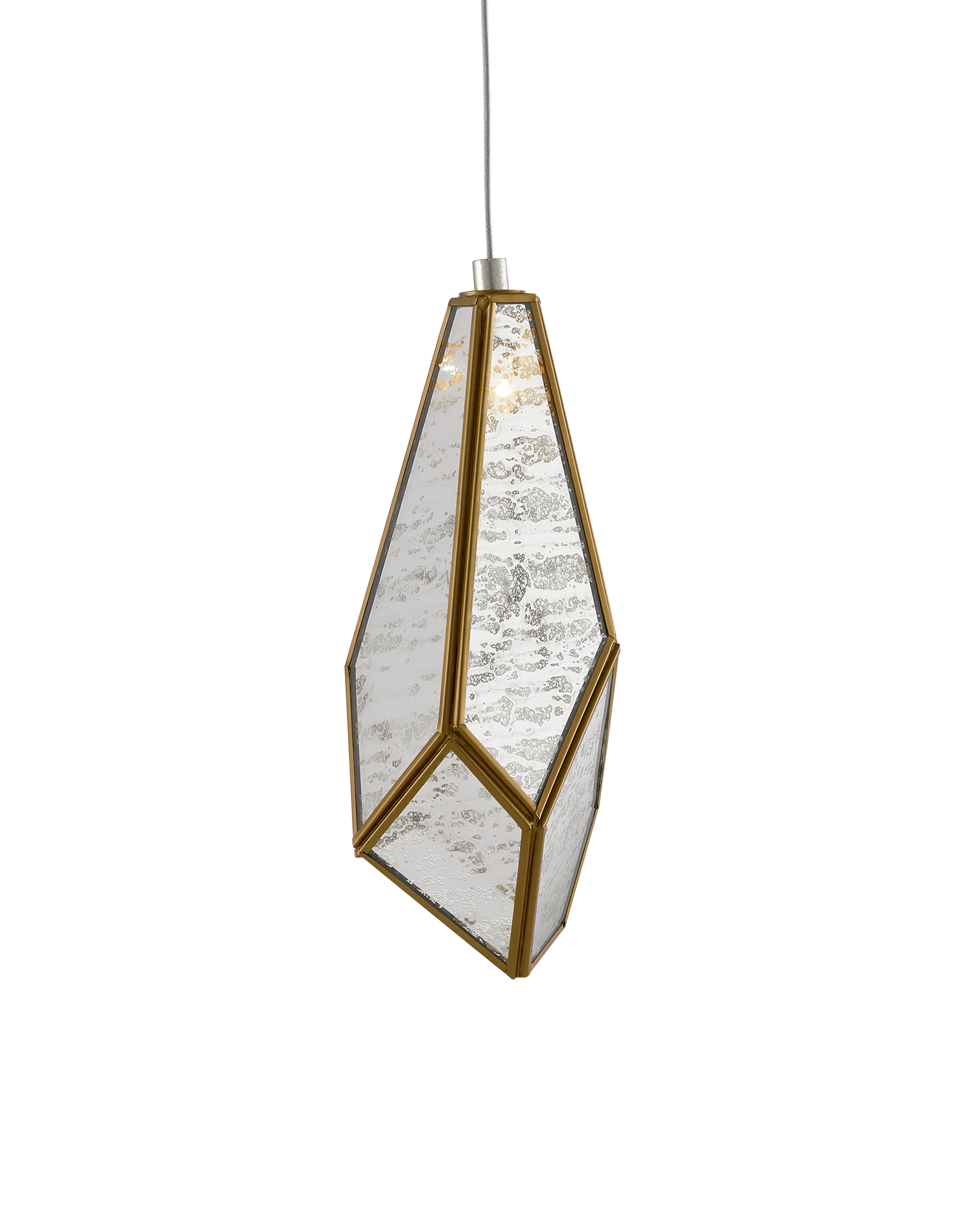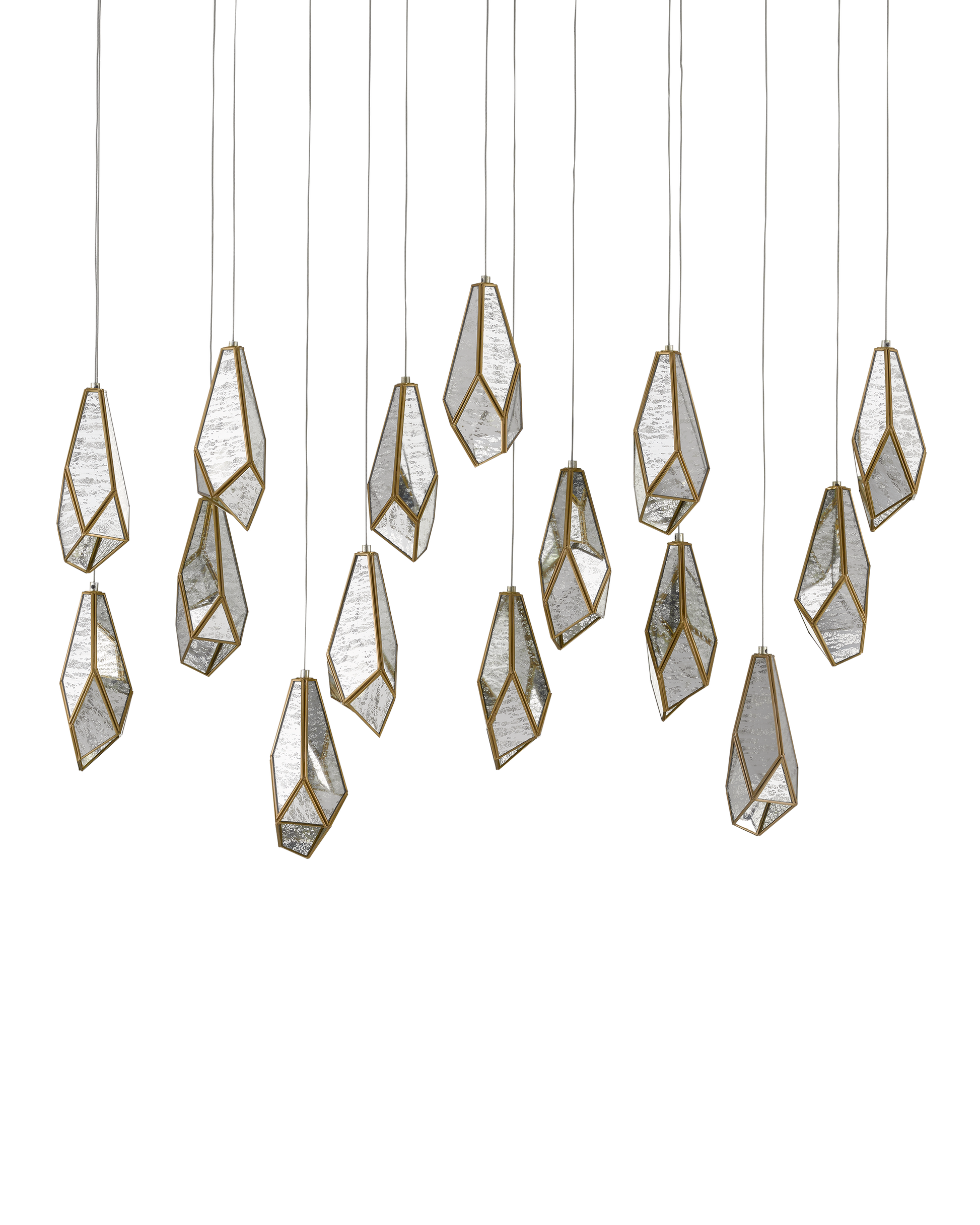The faceted shades of the Glace Rectangular 15-Light Multi-Drop Pendant are made of panes of Raj mirror joined with seams of metal in a brass finish. The organic shape of the shades and the fact they hang at differing heights brings this mirrored pendant added personality that will make it a piece of jewelry in a space. The canopy of this piece is luminous in a painted silver finish. This fixture is among Currey & Company's multi-drop pendant collection, which includes multiple configurations.