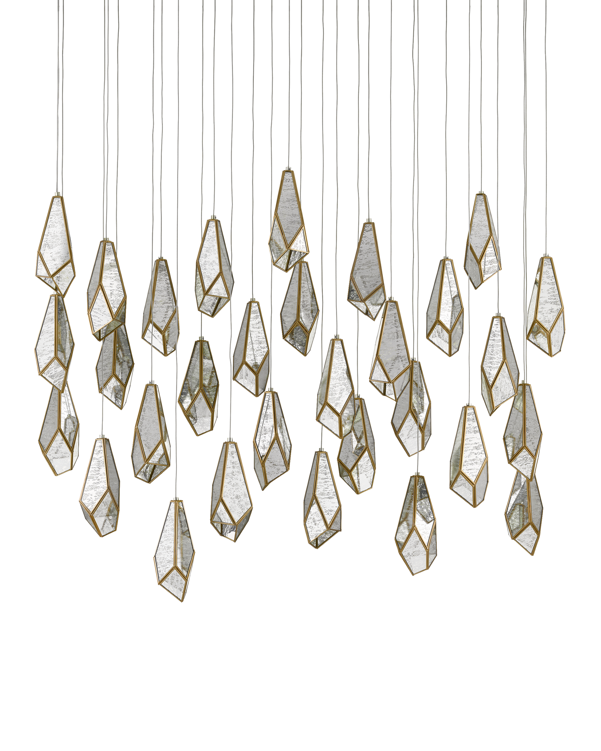 The faceted shades of the Glace 30-Light Multi-Drop Pendant are made of panes of Raj mirror joined with seams of metal in a brass finish. The organic shape of the shades and the fact they hang at differing heights brings this mirrored pendant added personality that will make it a piece of jewelry in a space. The canopy of this piece is luminous in a painted silver finish. This fixture is among Currey & Company's multi-drop pendant collection, which includes multiple configurations.