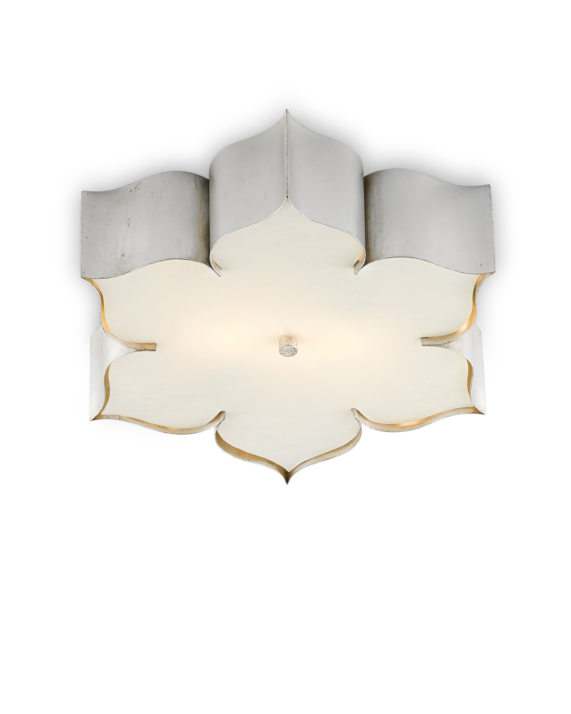 The Grand Lotus Silver Flush Mount receives its majestic good looks from a combination of stunning workmanship and antique contemporary silver leaf finish. The silver flush mount is skillfully fashioned from wrought iron.