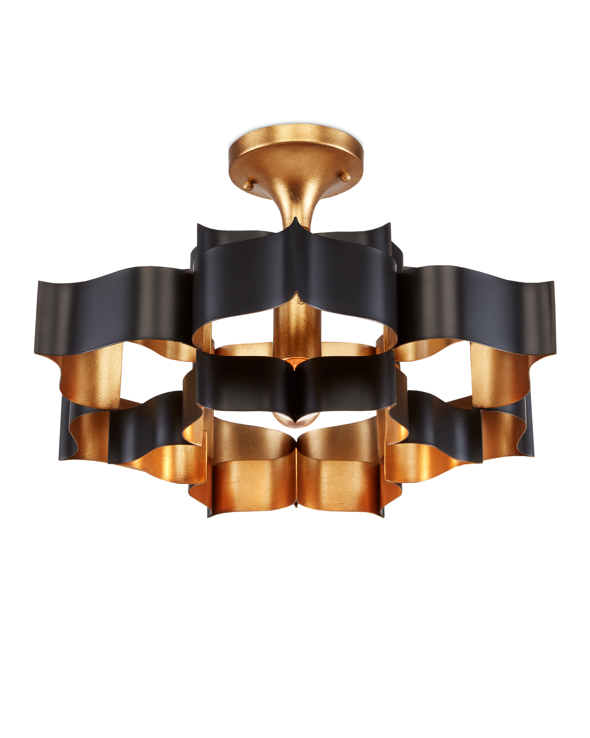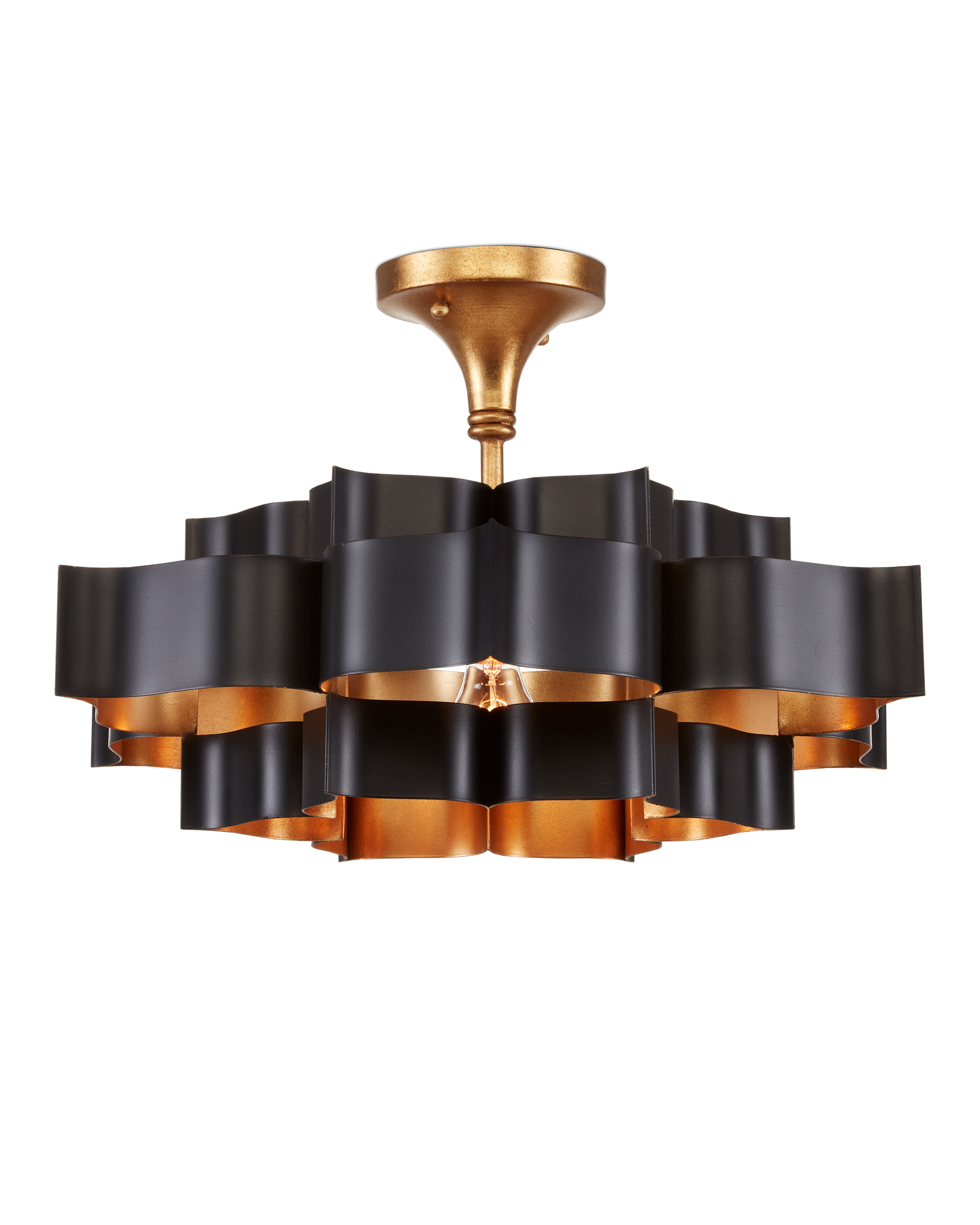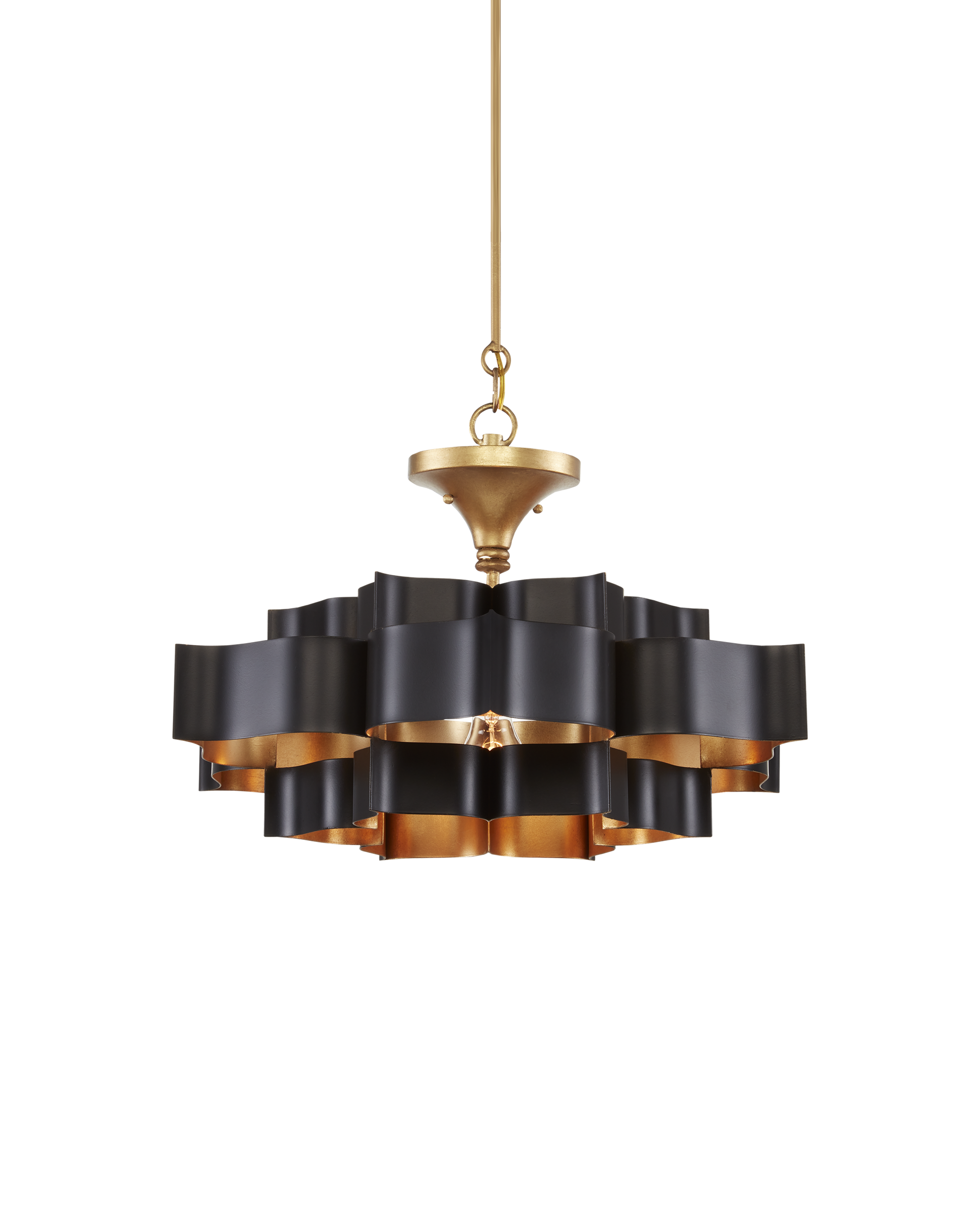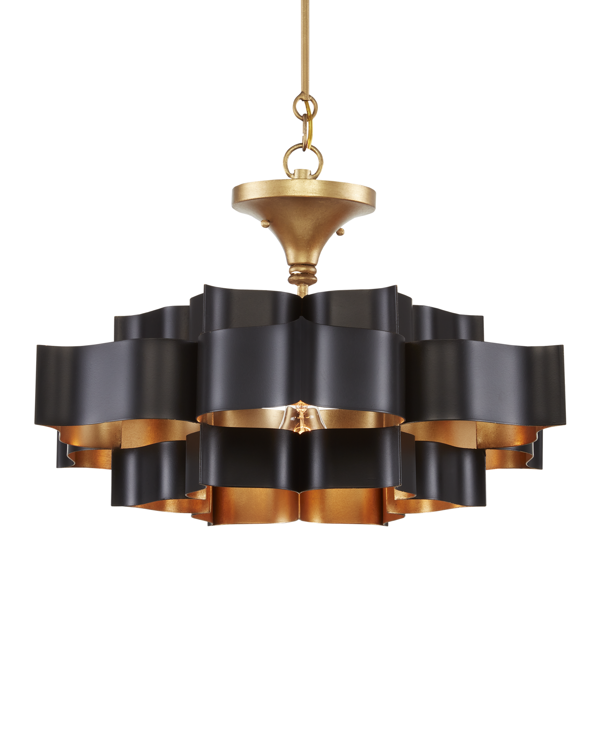The Grand Lotus Black Small Chandelier receives its good looks from a combination of stunning workmanship and a mix of satin black and contemporary gold leaf finishes. The black chandelier is skillfully fashioned from wrought iron. Adjustable from 14" to 86" with use of included chain/rod kit/cable. If your space calls for a longer drop, additional chain/rods/cable is available for purchase.