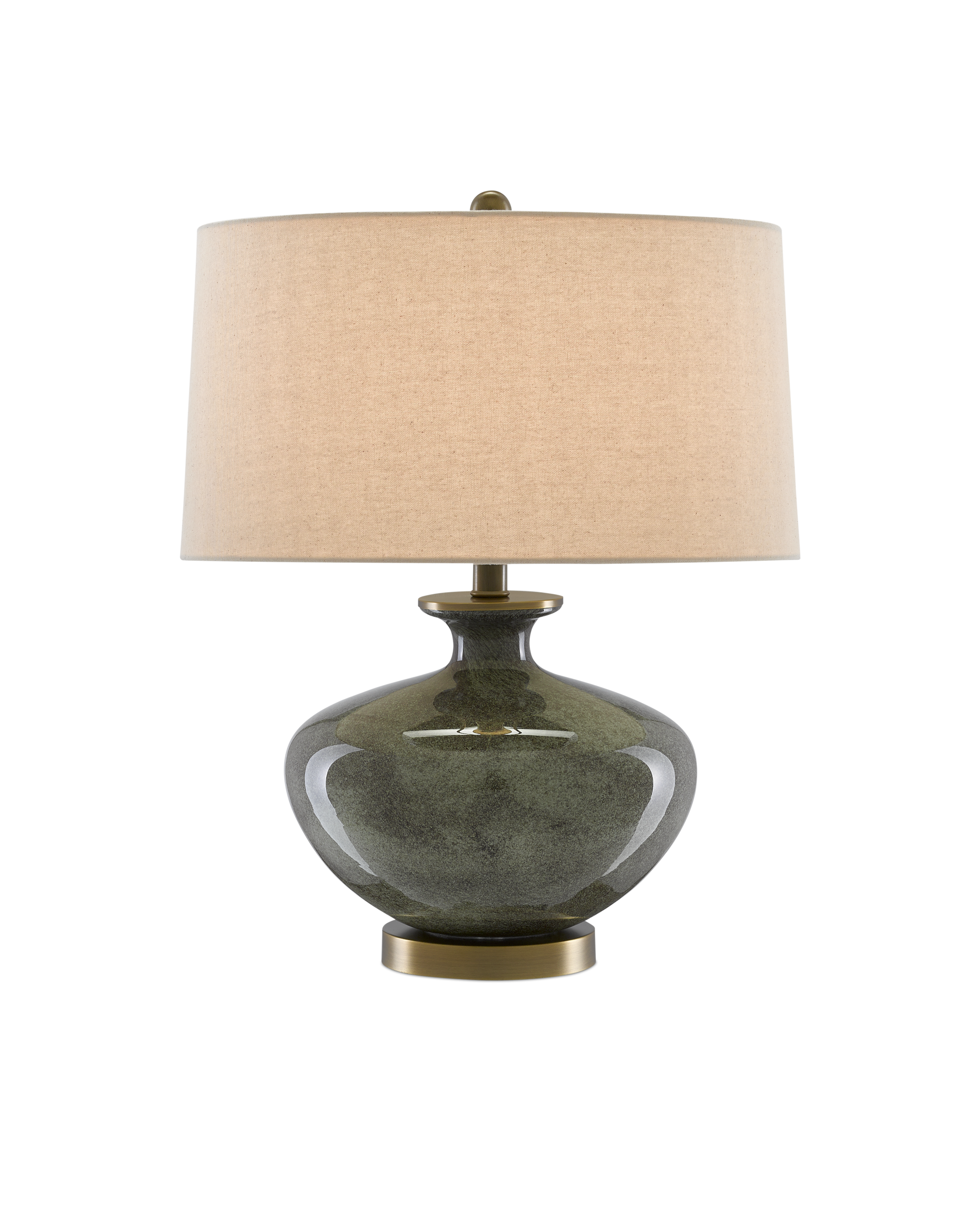 Our Greenlea Table Lamp is made of glass with an intermingling of dark gray and moss green swirling on its surface. The base, finial, and hardware in an antique brass finish complement the natural linen shade.
