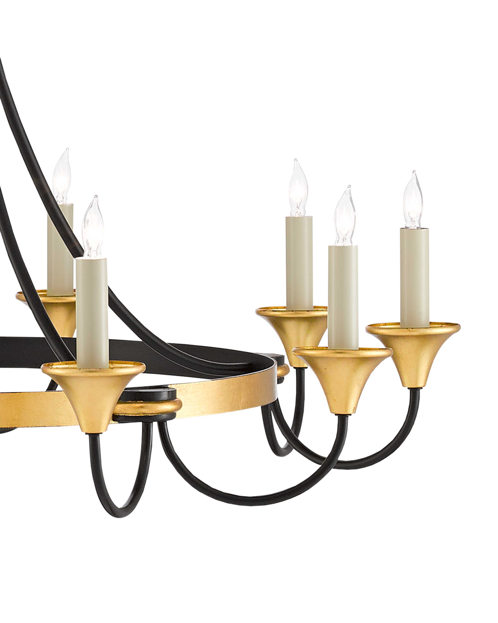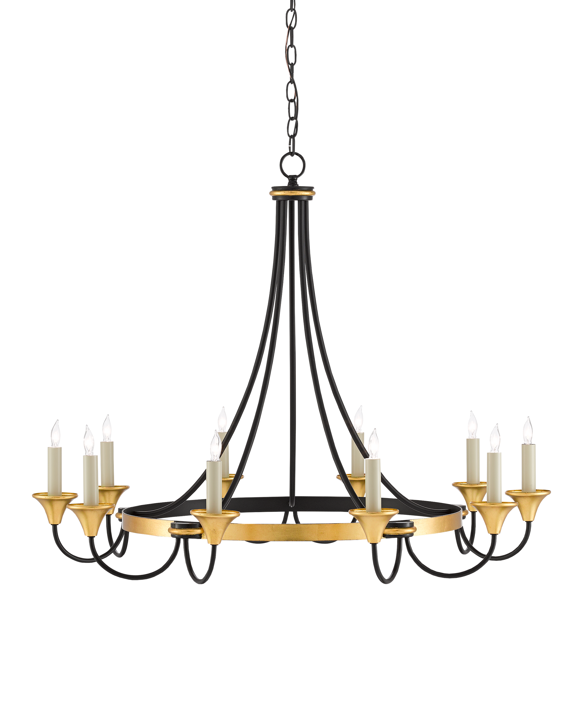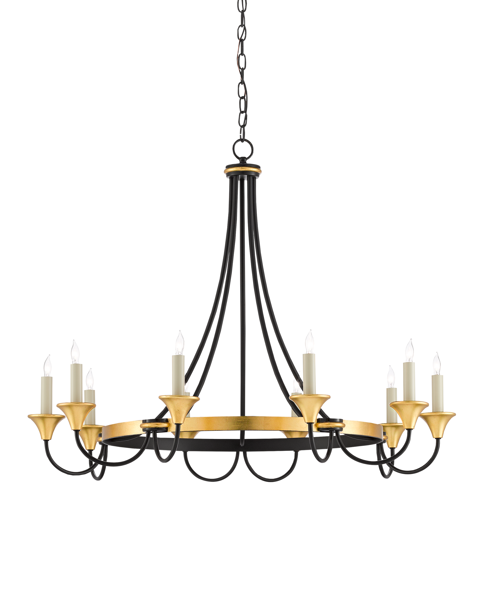 A graceful mix of matte black and gleaming gold make the Hanlon Chandelier one of our loveliest introductions. Ribs of metal curving from a simple crown in a washed black finish embrace a ring in a luminous contemporary gold finish to make this gold and black chandelier a contradiction. Adjustable from 34" to 104" with use of included chain/rod kit/cable. If your space calls for a longer drop, additional chain/rods/cable is available for purchase.
