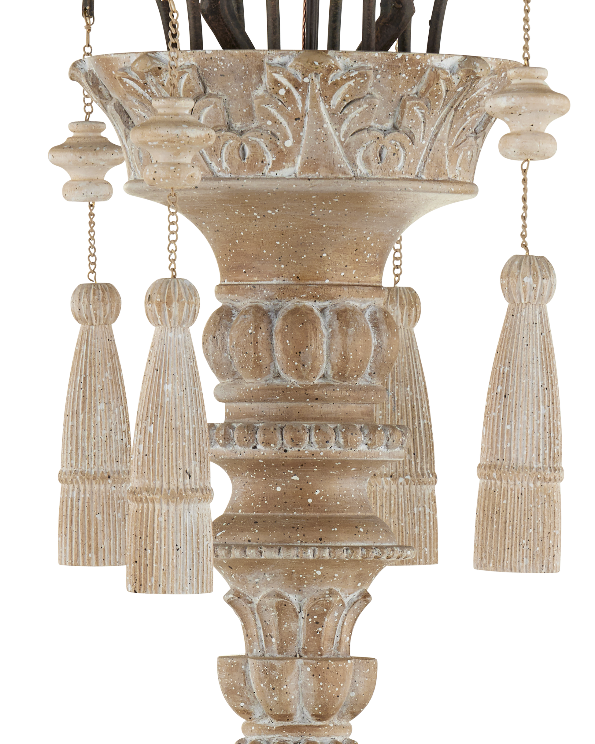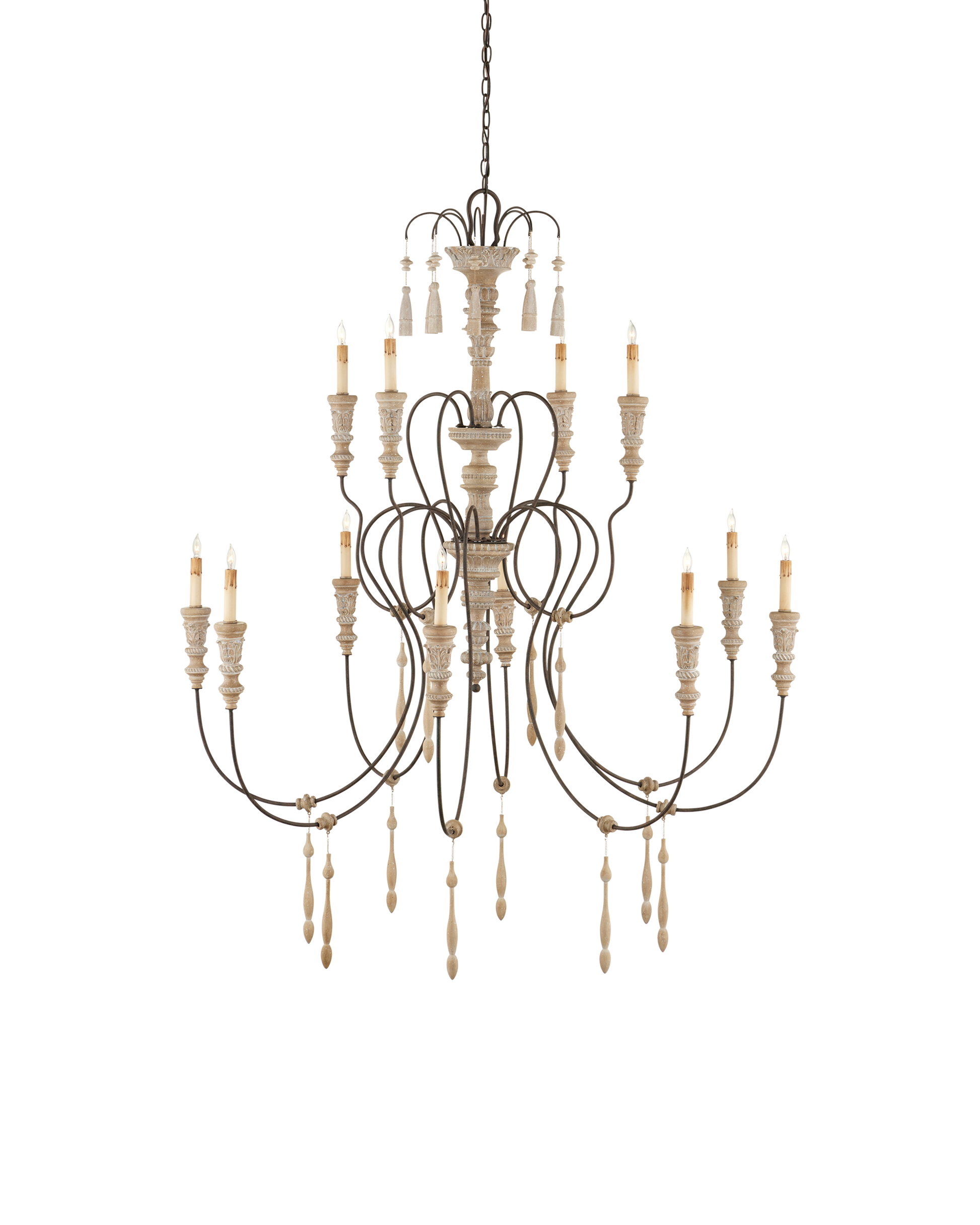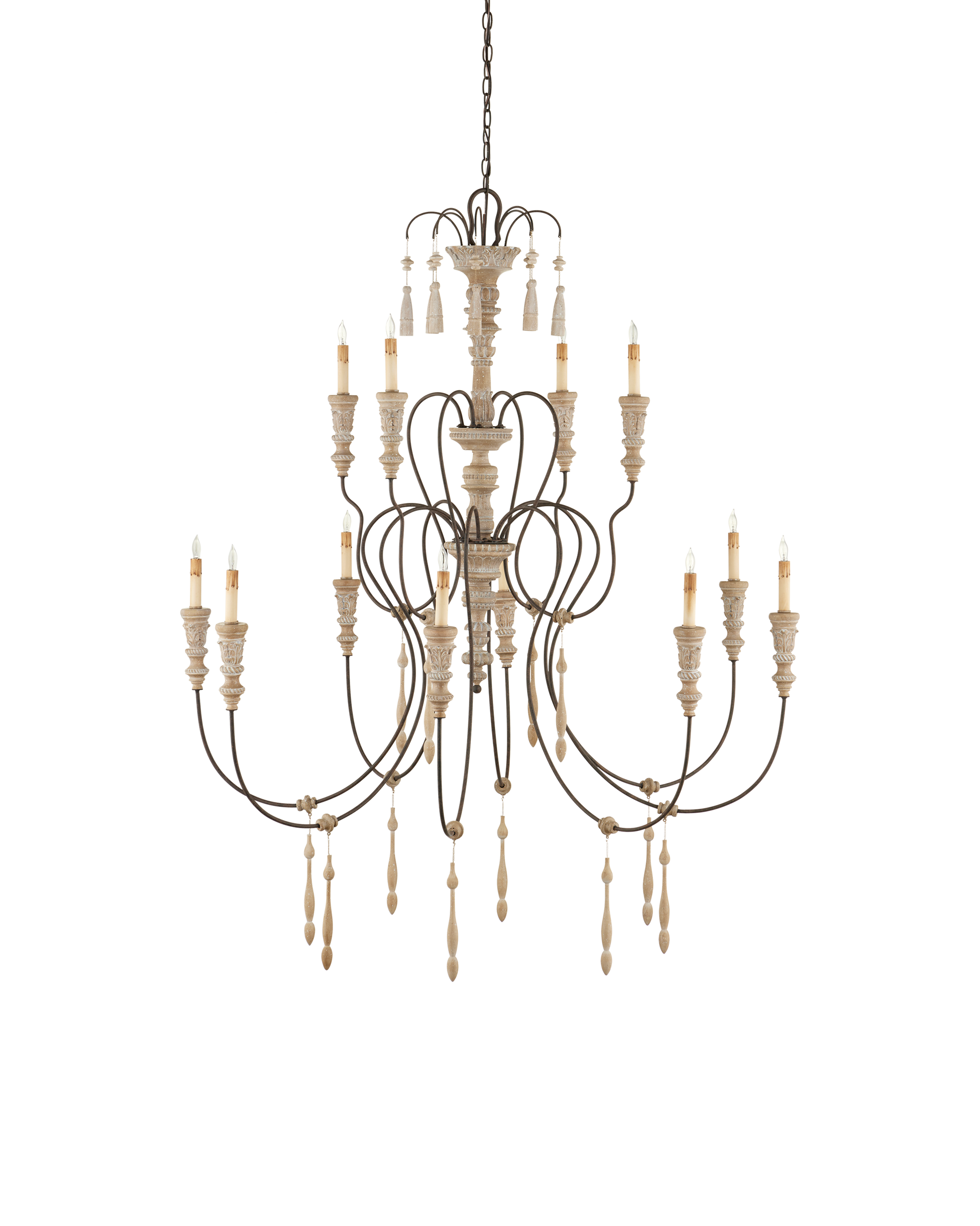 Our Hannah Large Chandelier has a delicate profile. Its hand-carved accents, evocative of turned wood, are more graceful with our Stockholm white finish applied. The scalloped wrought-iron frame in a rust finish brings aged beauty to this white chandelier.