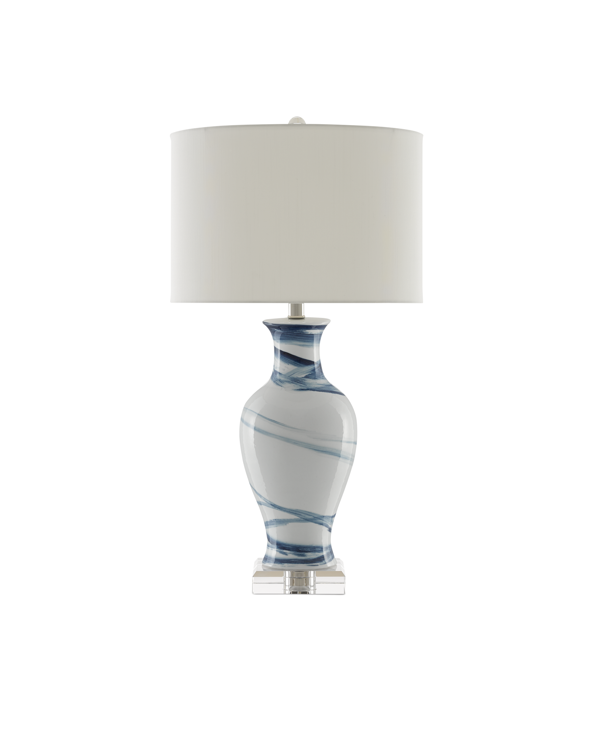 The beauty of finely wrought porcelain shows through in our Hanni Table Lamp. The surface of the white lamp has been decorated with brushstrokes in an elegant shade of navy blue. The optic crystal base and the nickel finish on the hardware add to the luminosity of this lamp that it is topped with an off-white shantung drum shade.
