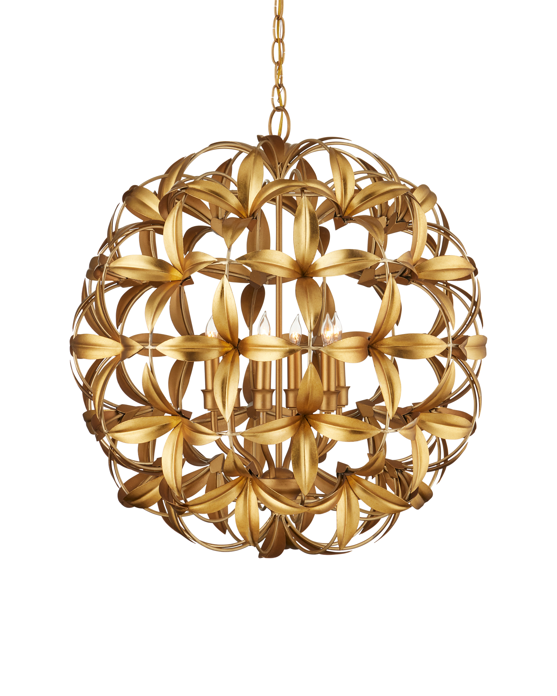 The Helenium Orb Chandelier is a whimsical nature-inspired piece made of wrought iron in a mix of contemporary gold leaf and contemporary gold finishes. Four flowers blossom from each tuft that is affixed to the frame in a steady flow of flourishes, the motifs making this gold chandelier a luxurious fixture and a big hit for flower lovers. Each of the blossoms are cut and stamped before being welded to the frame. Adjustable from 31.75" to 99.75" with use of included chain/rod kit/cable. If your space calls for a longer drop, additional chain/rods/cable is available for purchase.