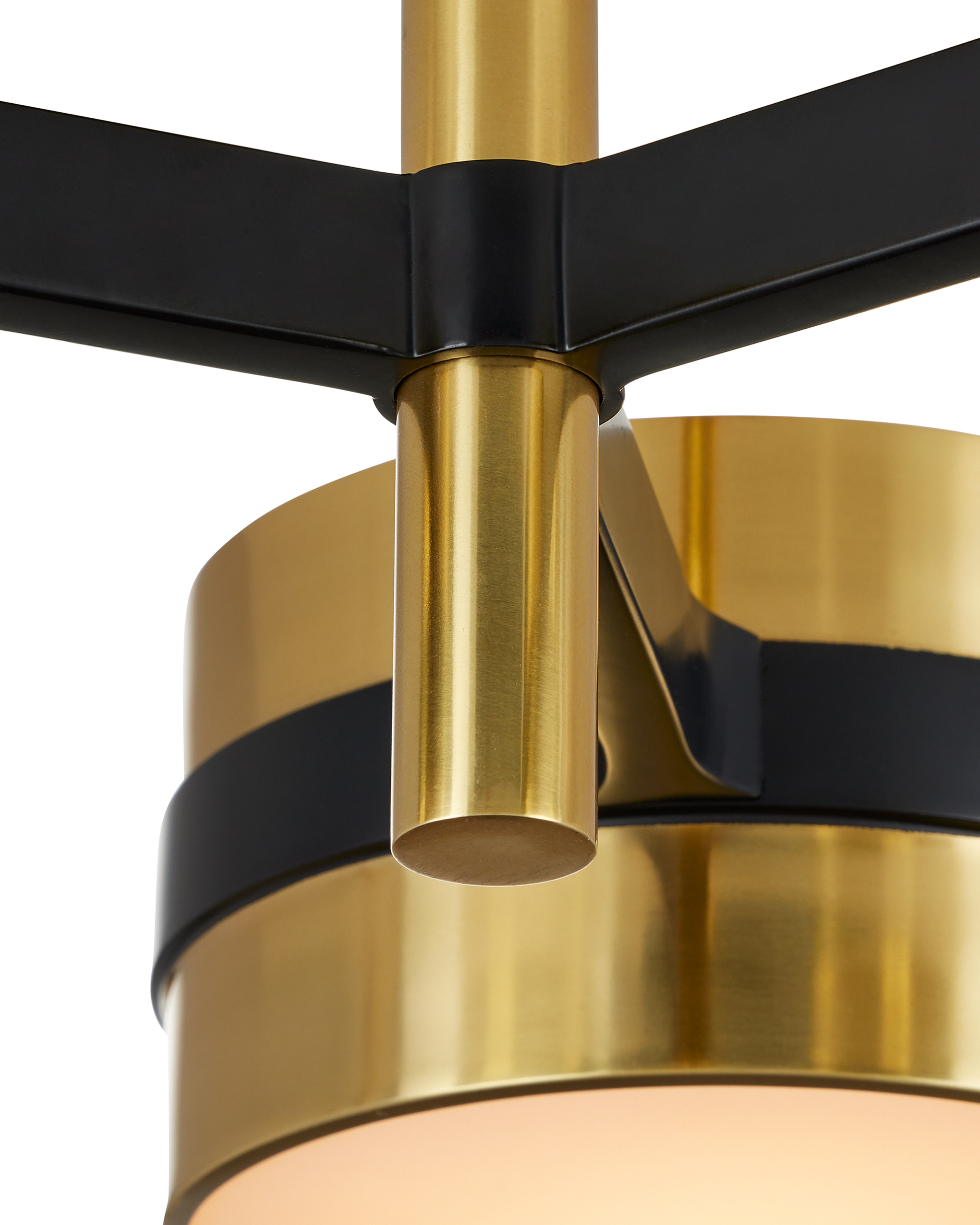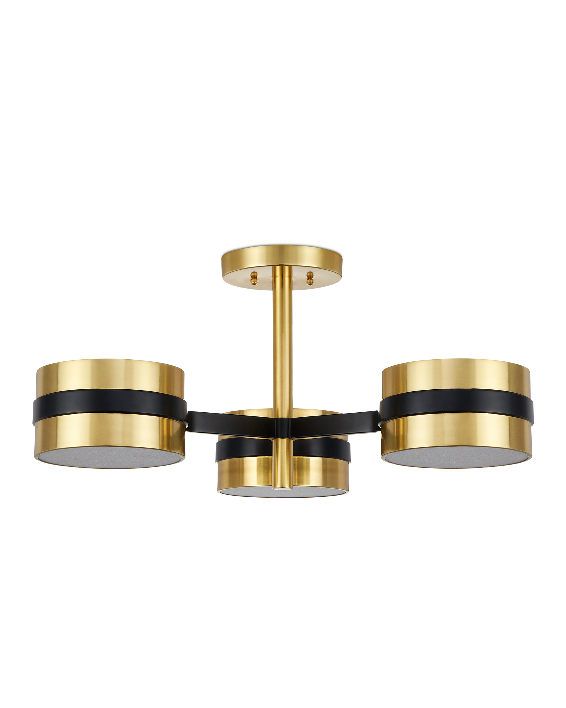 Taking his cues from mid-century modern design, Clarence Mallari envisioned the Heybrook Semi-Flush Mount to reflect the sensibilities of that lauded era. Made of metal in a mix of black and polished brass finishes, the gold semi-flush is fitted with integrated LED technology that is softened by white diffusers at the bottom of each of the three circlets holding the bulbs.