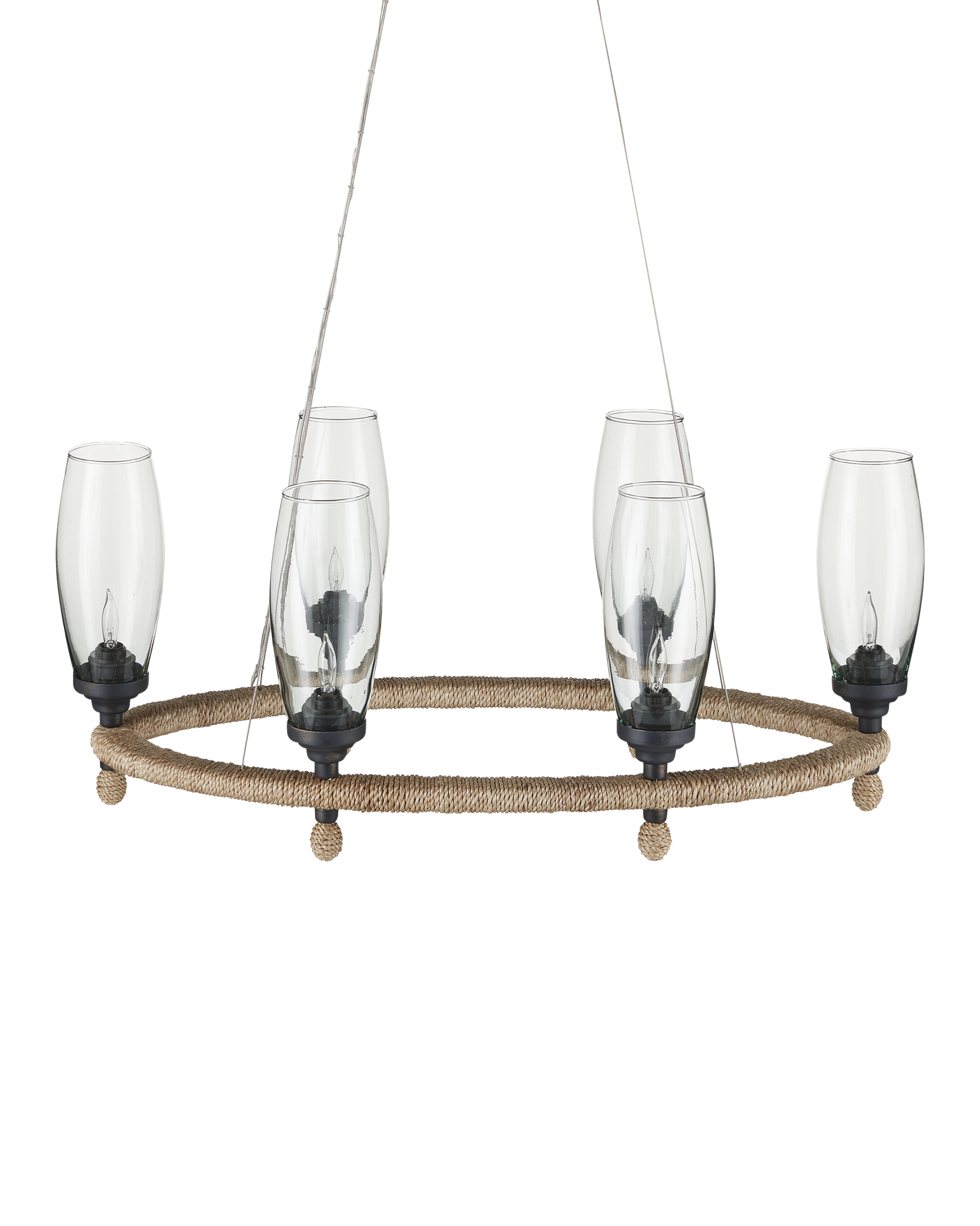 The perfect combination of natural and industrial materials, the Hightider Glass Oval Chandelier has recycled glass shades and wrought iron hardware in a French black finish. The abaca rope that is wrapped around the ring of the nautical pendant brings it a hint of texture. Clarence Mallari's original inspiration came from the small bells used by people selling ice cream in the Philippines. The aircraft cable on which the rope chandelier suspends keeps the design light. Adjustable from 19.5" to 142.5" with use of included chain/rod kit/cable. If your space calls for a longer drop, additional chain/rods/cable is available for purchase.