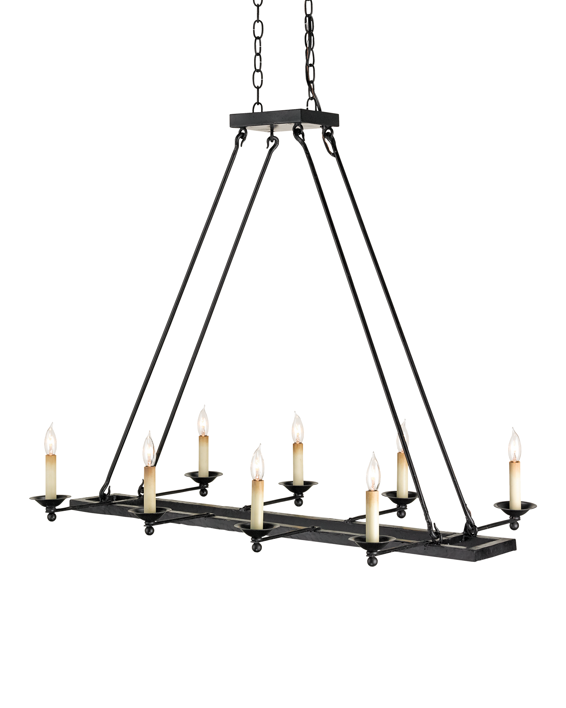 The Houndslow Rectangular Chandelier balances its eight candelabra bulbs from arms fitted with small bobeches. The fixture, made of wrought iron in a satin black finish, is one of our powerful linear offerings. A design note for this black chandelier is its clean-lined angularity.